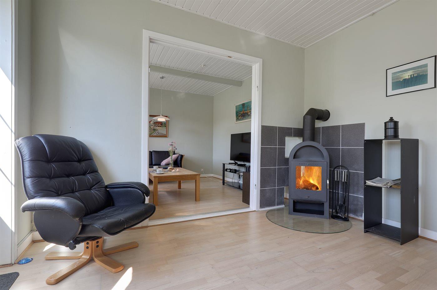 Gemütliches Ferienhaus in Østermarie mit Whirlpool, Balkon und Kaminofen, ideal für erholsame Tage auf dem Land.