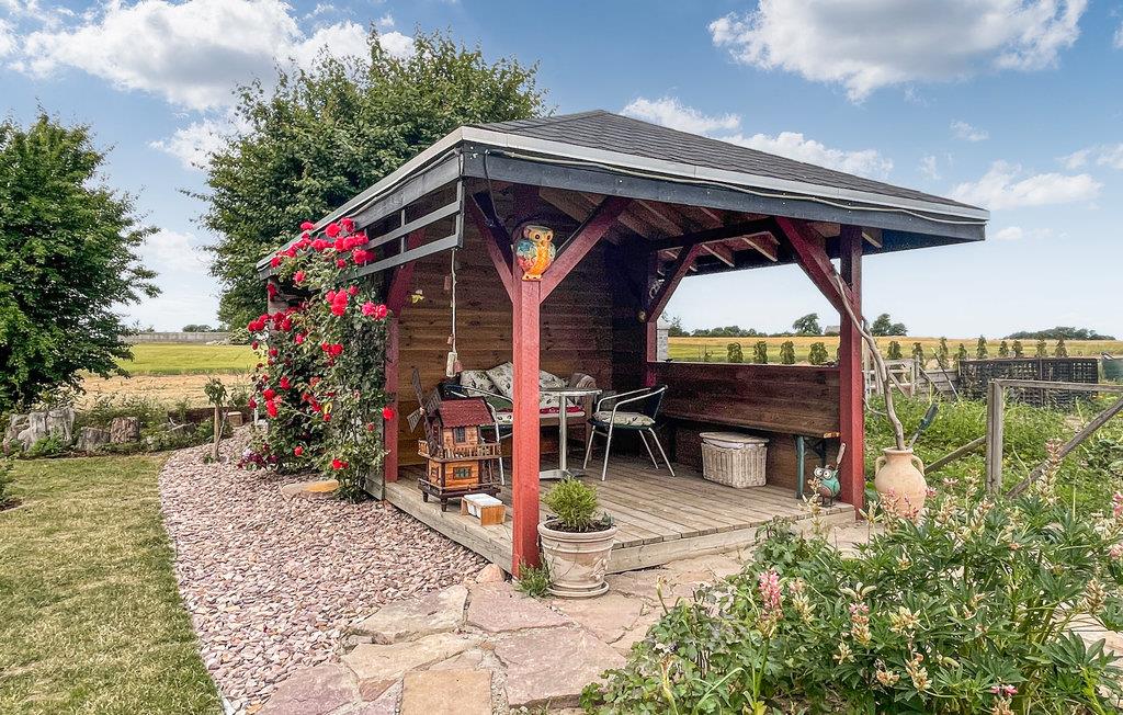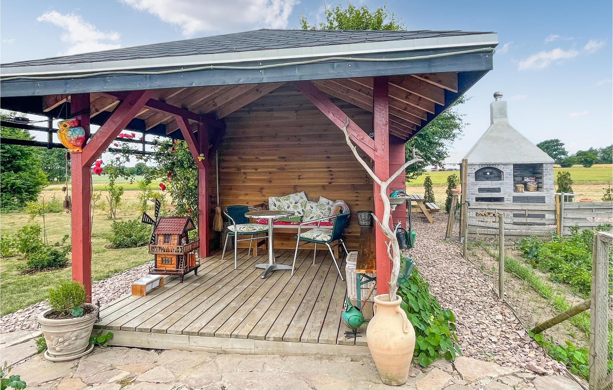 Das Ferienhaus erstreckt sich über zwei Etagen und bietet Platz für vier Personen. Neben einer bestens ausgestatteten Küche können Sie Ihr Essen auch im Freien zubereiten, wo es sowohl einen Gemeinschaftsgrill als auch einen Pizzaofen gibt. Wenn die Mahlzeit fertig ist, können Sie diese auf der überdachten Terrasse verspeisen, während der Blick über die ruhige Umgebung schweift.