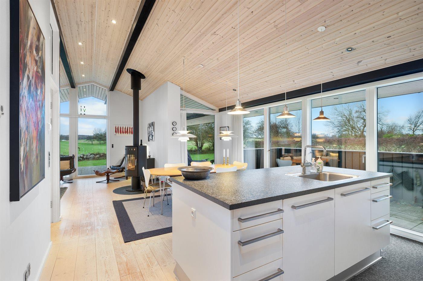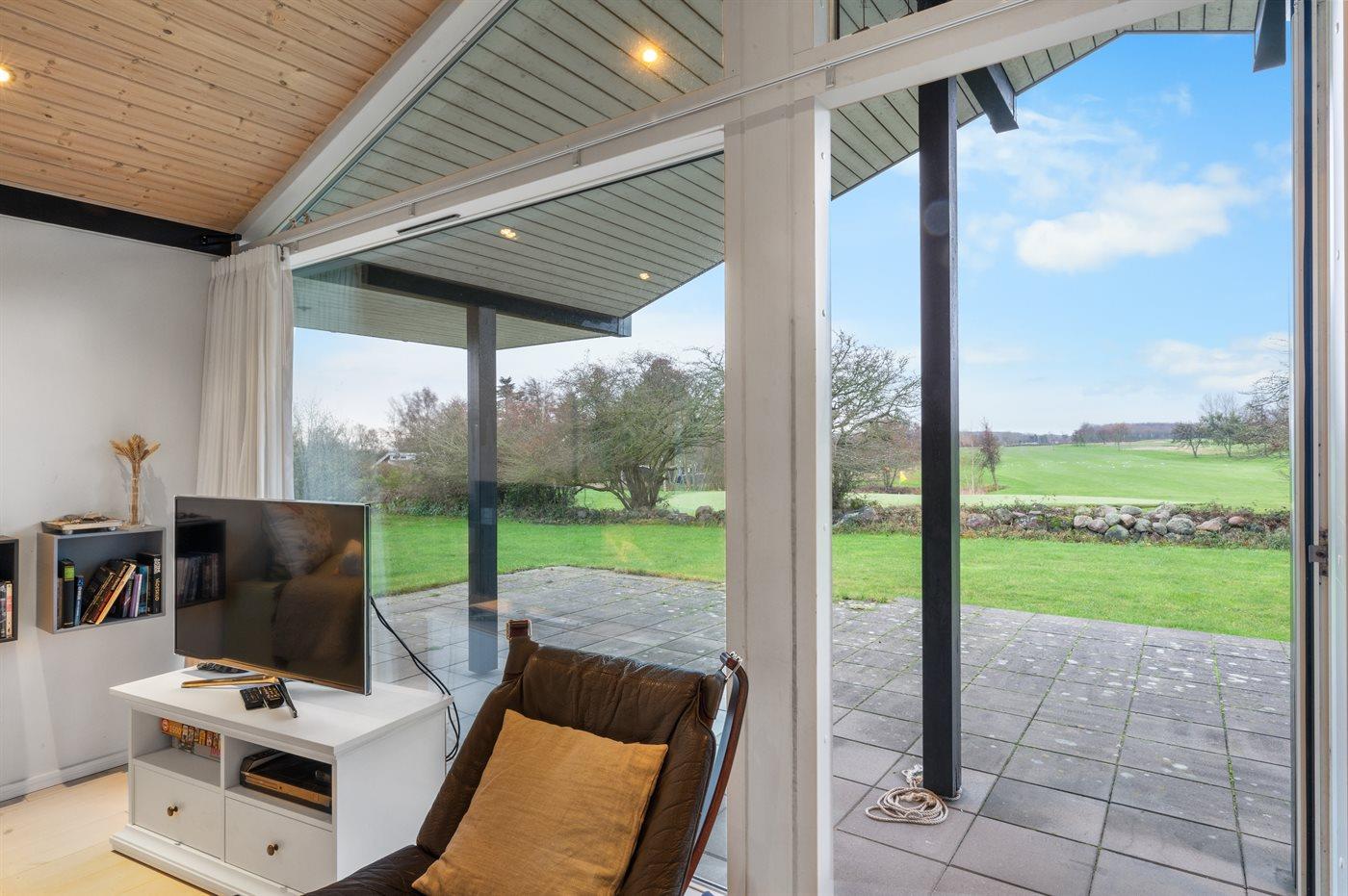 Modernes Ferienhaus mit Golfplatzblick, Sauna und großem Garten in Humble, Dänemark.