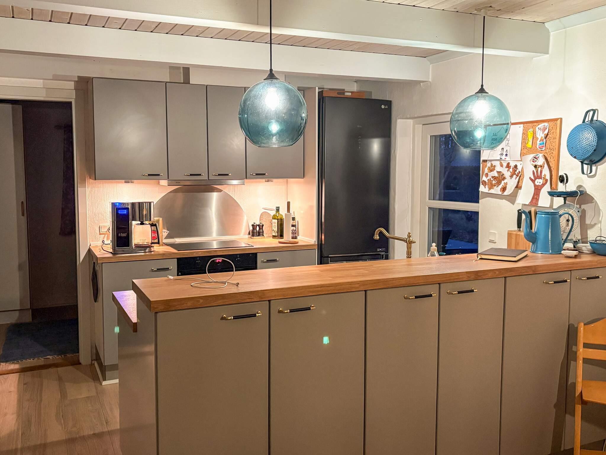 Küche: E-Kochpl., Ofen, Kühl-Gefrier-Kombi, Mikrow., Kaffeem., Waschm.