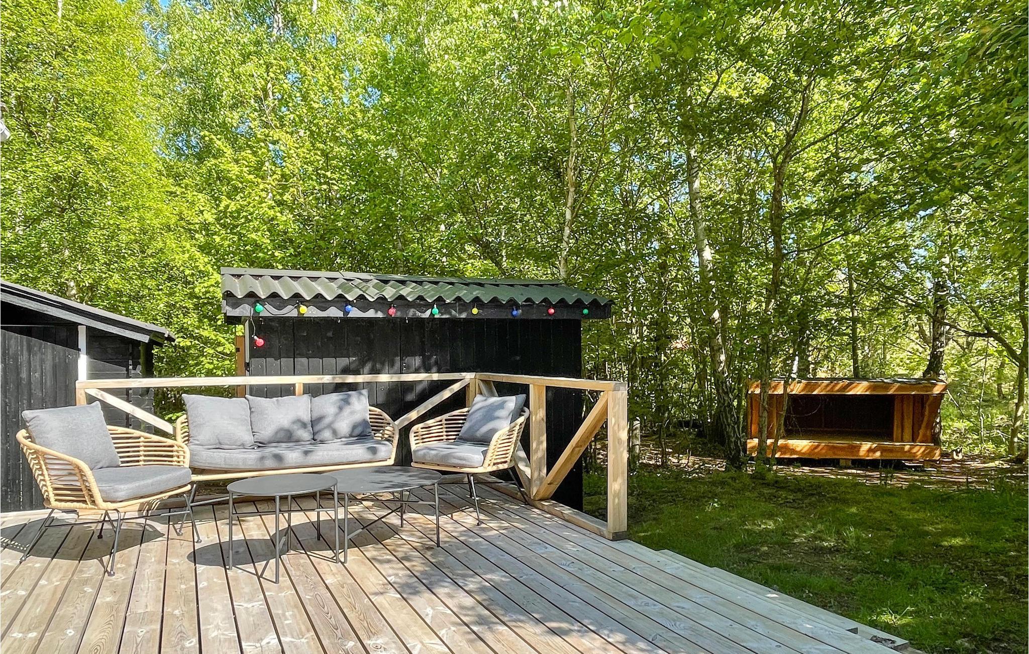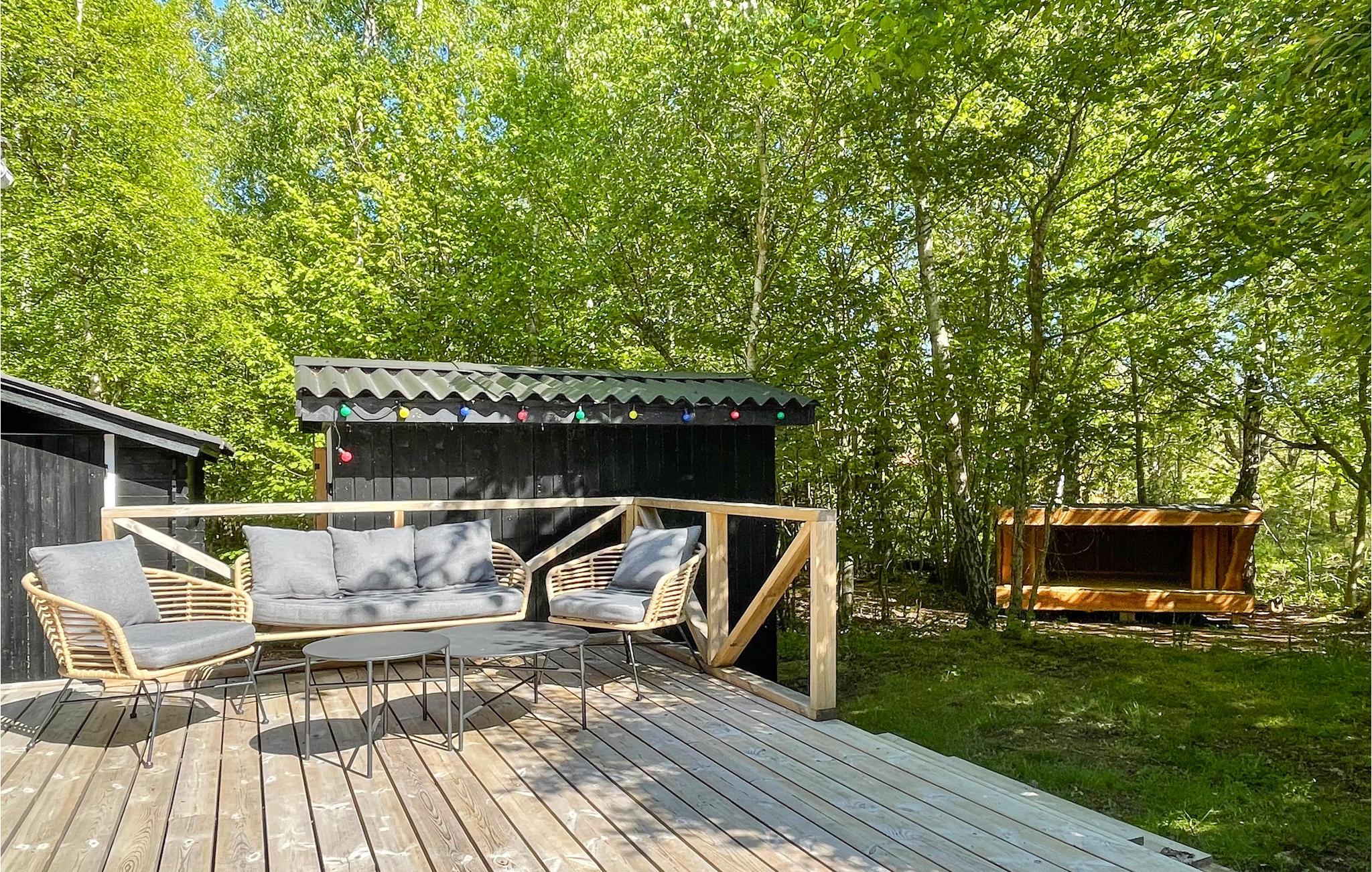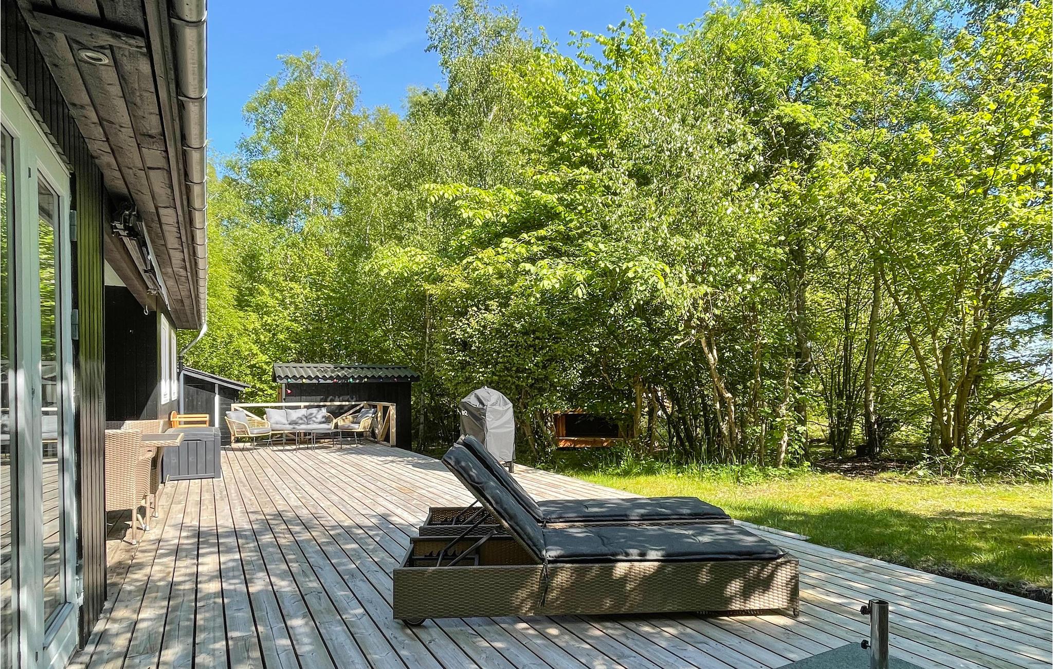 Ihre südlich ausgerichtete, windgeschützte Terrasse ist teilüberdacht und bietet sich für Mahlzeiten im Freien und lange Sonnenstunden auf den bequemen Liegen an. Genießen Sie hier die friedliche Atmosphäre zwischen schattigen Bäumen und lassen Sie Ihre Kinder spielerisch die Natur erkunden und sich an urigen Spielmöglichkeiten erfreuen. Spazieren Sie barfuß zum Strand und entfachen Sie den Grill für stimmungsvolle Abende unter freiem Himmel.