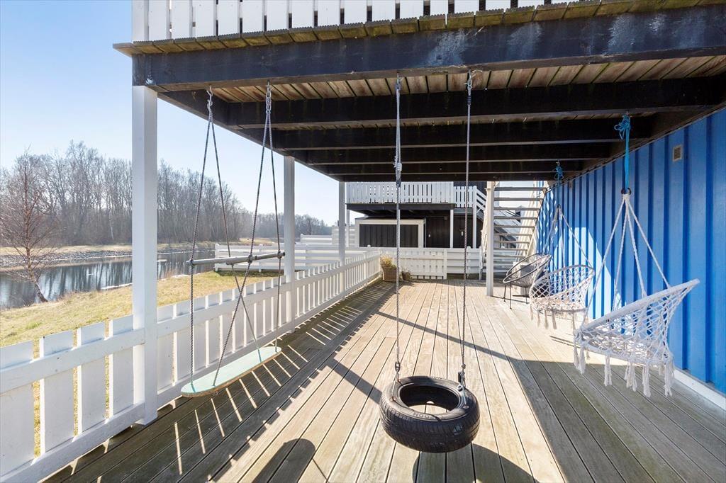 Mit zwei großen Terrassen könnt ihr das Leben im Freien richtig genießen. Die Süd-Terrasse im ersten Stock ist ausgestattet mit komfortablen Möbeln und einem Grill. Auf der Terrasse im Erdgeschoss können die Kinder sich an der Schaukel austoben oder in den Hängesitzen entspannen. Die Ferienwohnung ist umgeben von bunten Ferienhäusern und liegt direkt am Kanal, wo die beschaulich-maritime Atmosphäre eine ganz besondere Stimmung erschafft.