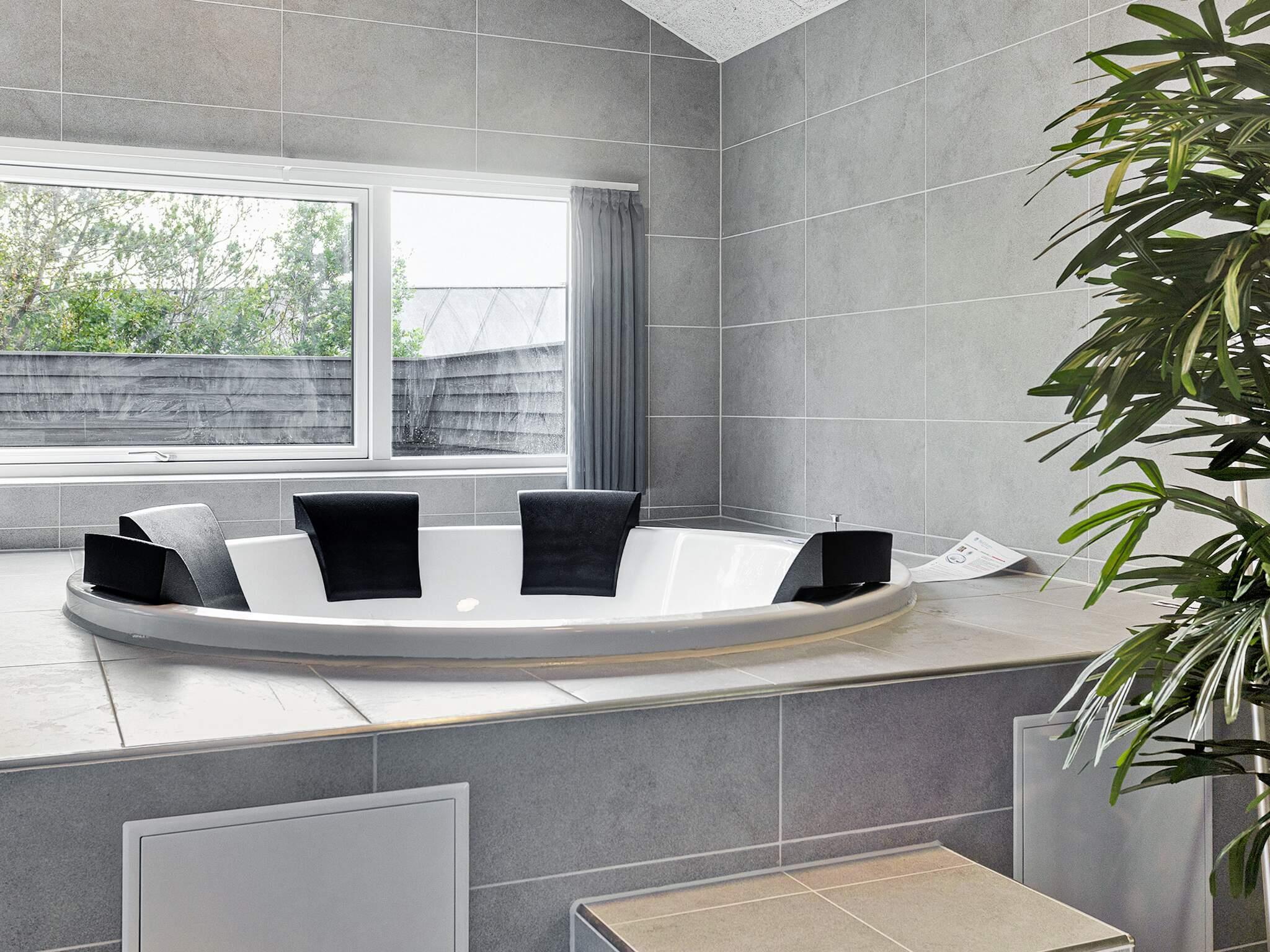 Die Bademöglichkeiten sind endlos. Vom Poolraum aus gelangt man in den Außenwhirlpool des Ferienhauses, der sich in einer Ecke der Terrasse befindet. Hier lässt sich das Wellness-Feeling unter freiem Himmel fortsetzen – auch an kalten Wintertagen.