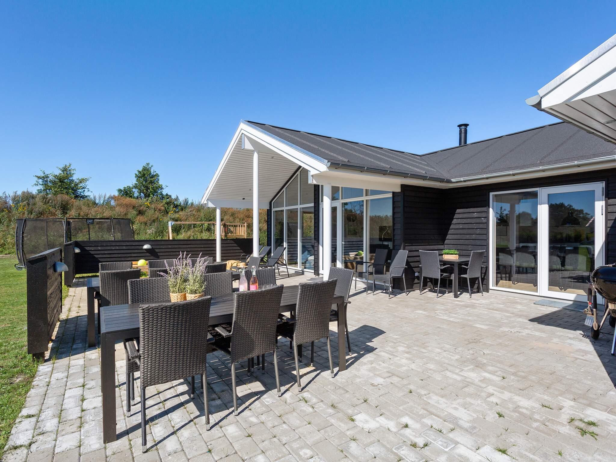 Die teilweise überdachte Terrasse bietet reichlich Gelegenheit, die dänische Sonne zu genießen. Gartenmöbel und ein Grill laden zum Grillen ein. Für die Kinder gibt es außerdem eine Schaukel, ein Trampolin und einen Spielturm.