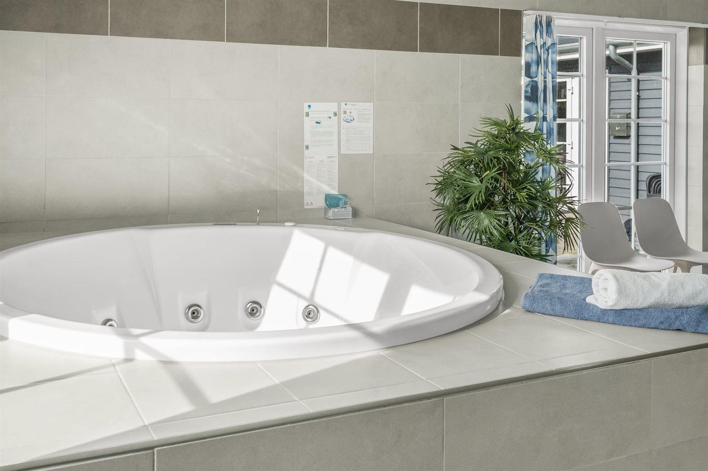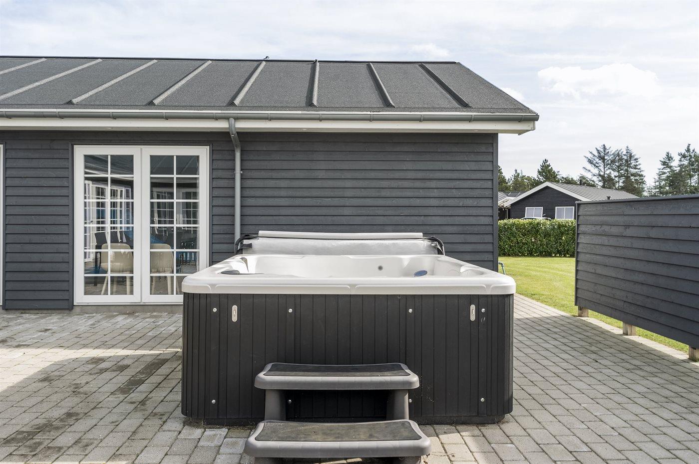 Auf der Terrasse finden Sie einen schönen Außenwhirlpool für 4 Personen - Entspannen Sie sich im warmen Wasser während Sie den beruhigenden Geräuschen der Natur lauschen. Gemütlicher wird es kaum!