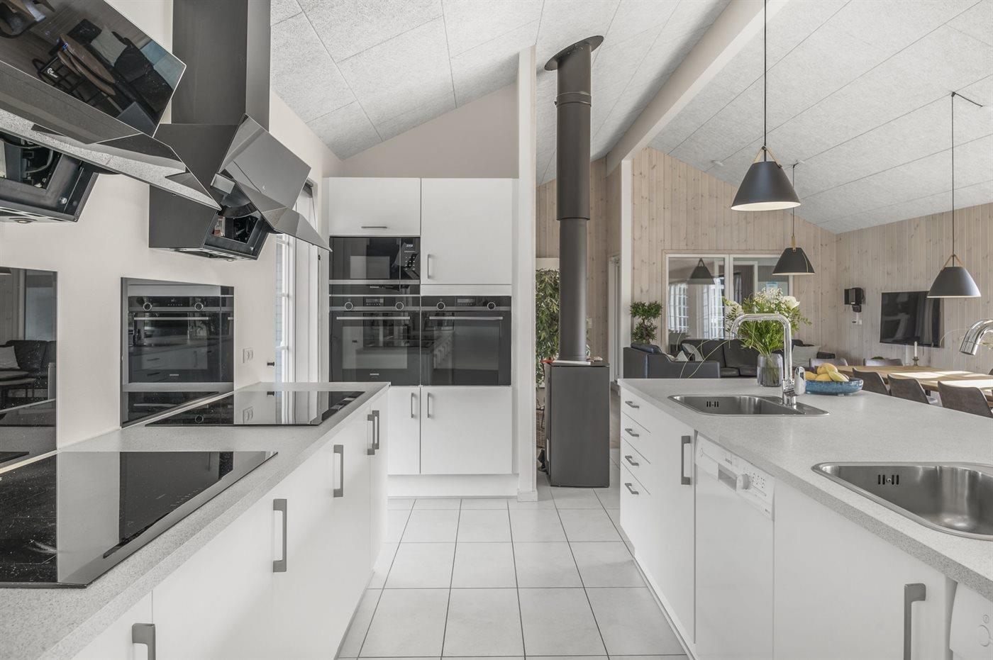 In der gut ausgestatteten Küche gibt es selbstverständlich 2 Geschirrspüler, 2 Backöfen, 2 Spülbecken und 2 Kühlschränke. Das zubereiten der Mahlzeiten für viele Personen soll einfach sein und Spaß machen – dafür gibt es hier die allerbesten Möglichkeiten. Die Küche liegt in offener Verbindung mit dem hellen Wohnzimmer/Aufenthaltsraum, wo sich auch ein Kaminofen befindet, der an kühle Tage für wohlige Wärme sorgt.