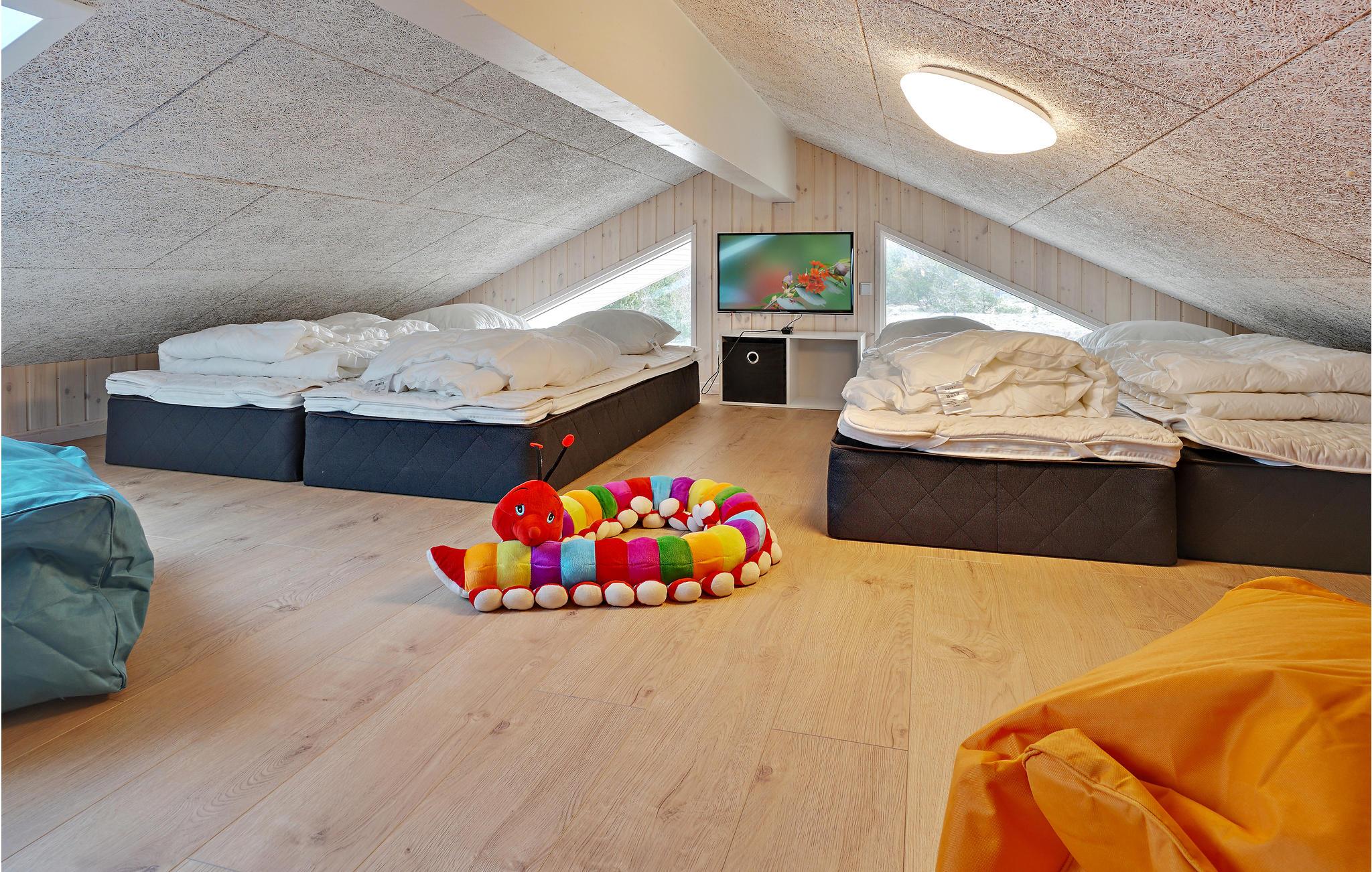 Das Haus mit insgesamt 298 m² Wohnfläche hat eine praktische Raumaufteilung, so dass Sie sich hier sehr gut mit mehrerem Familien oder als Gruppe aufhalten können. Es bietet Platz für 24 Personen mit 9 Schlafzimmern und 2 Zwischenböden, die jeweils 3 Matratzen ausgestattet sind. Es gibt drei separate Schlafbereiche, die sich jeweils ein Bad teilen.