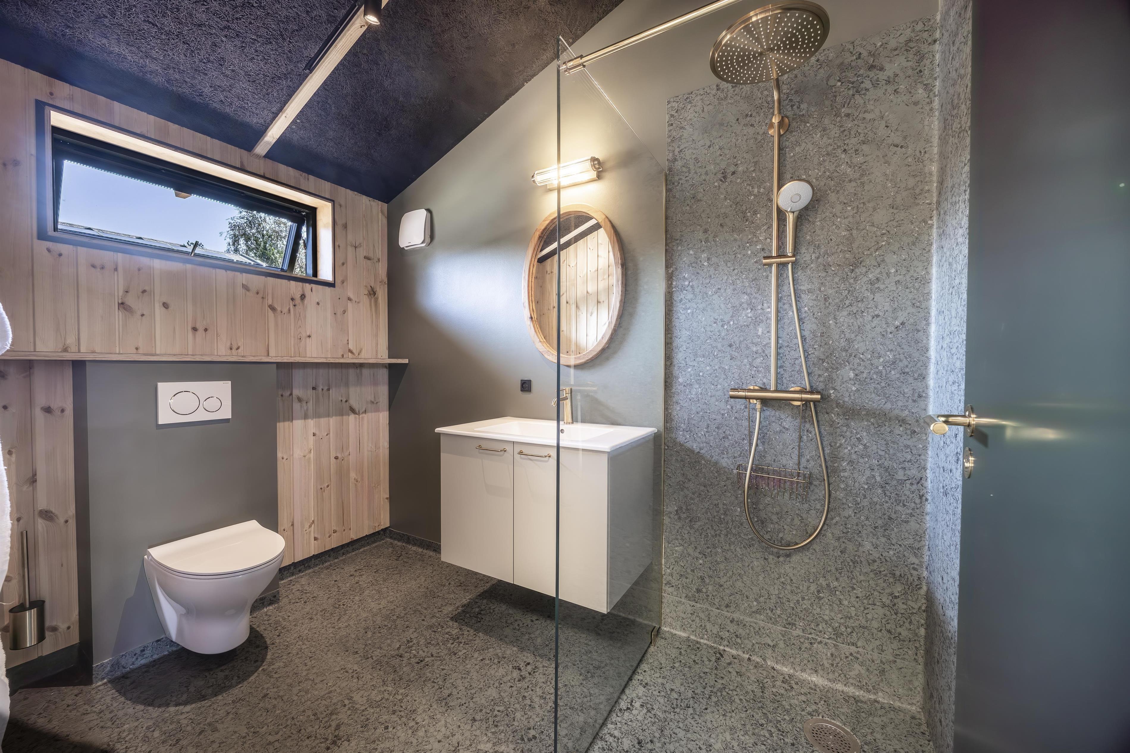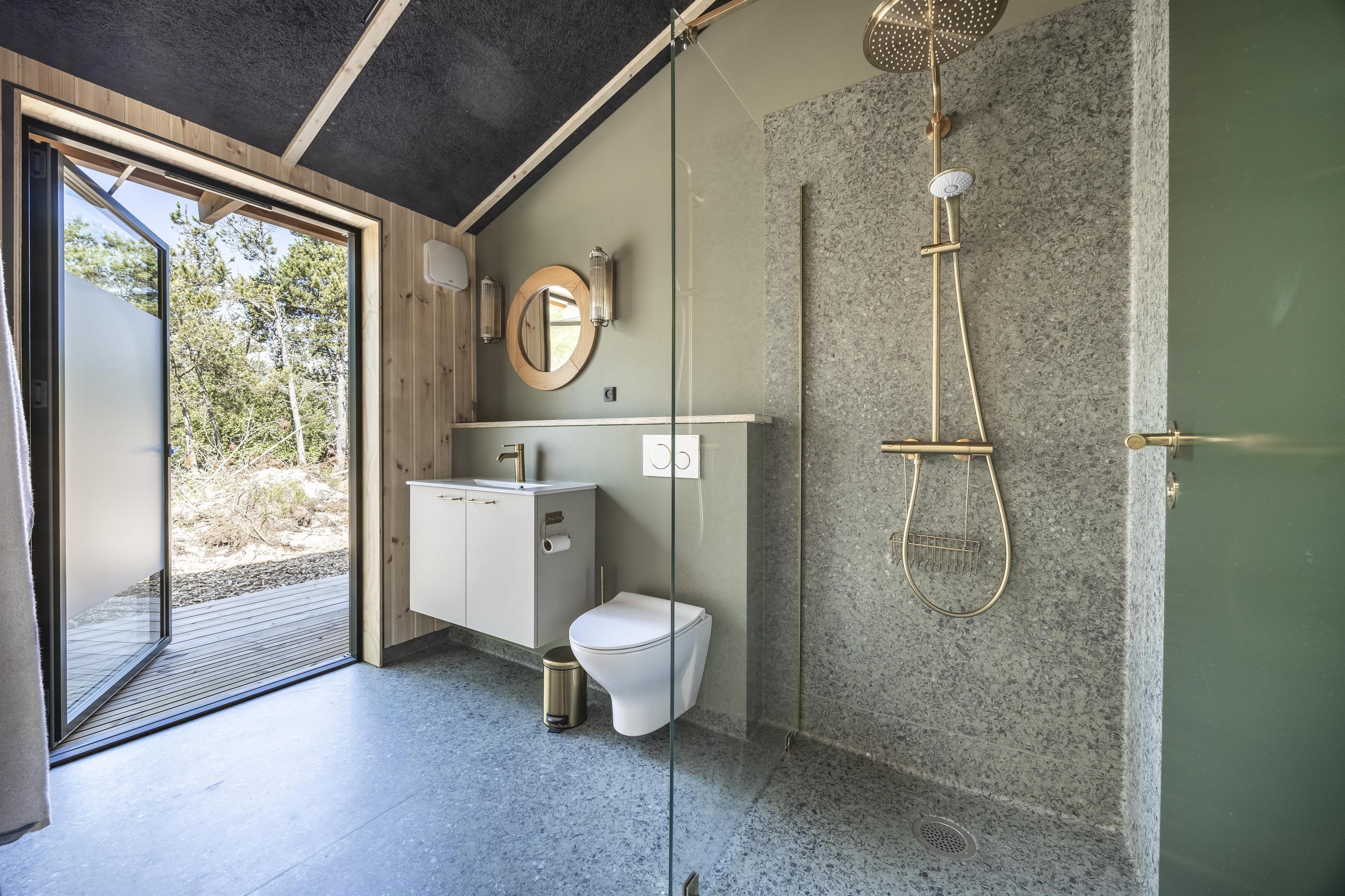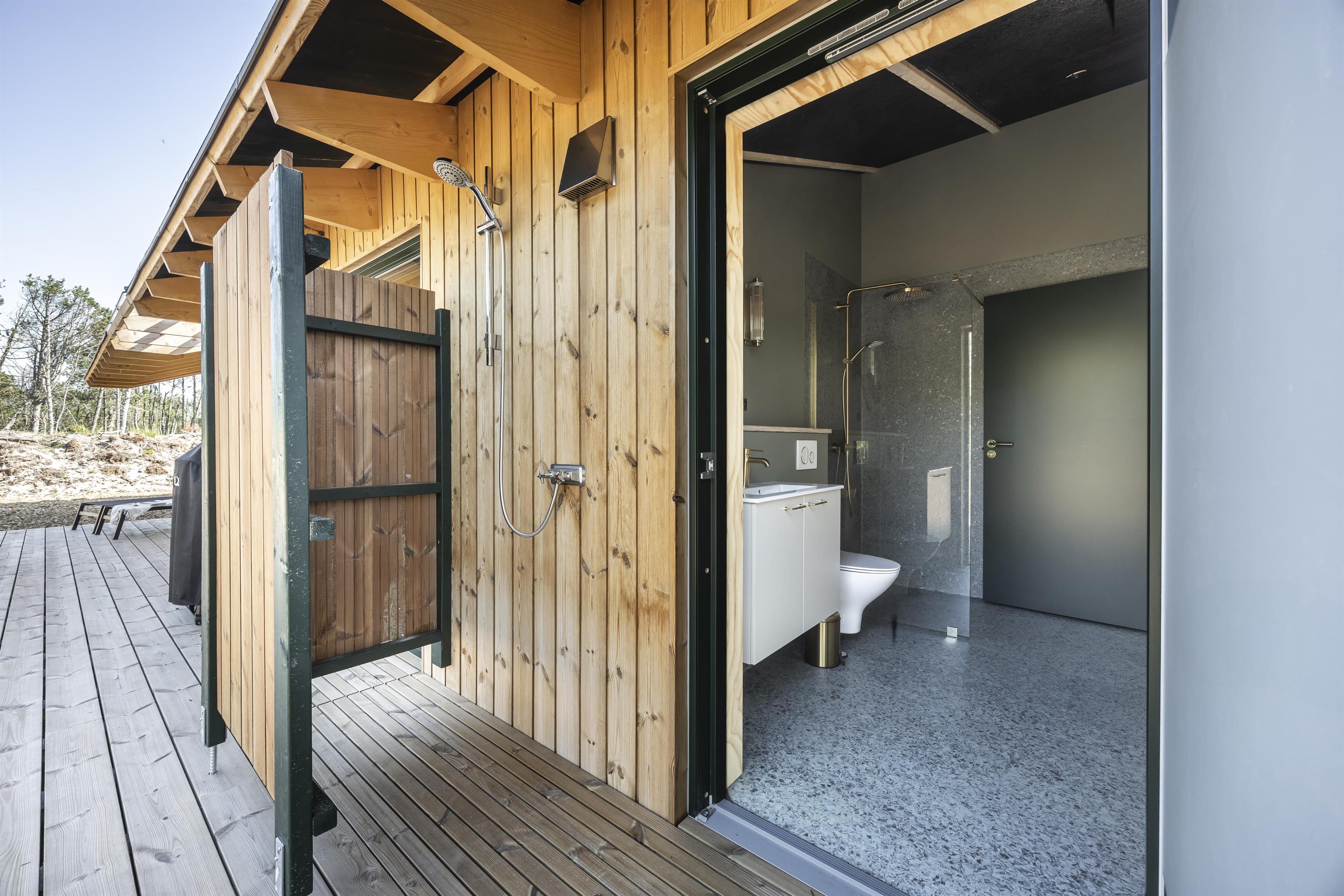 Es gibt zwei moderne Badezimmer – eines davon mit direktem Zugang zur Außendusche, sodass Sie das Gefühl von Natur und Freiheit hautnah erleben können.