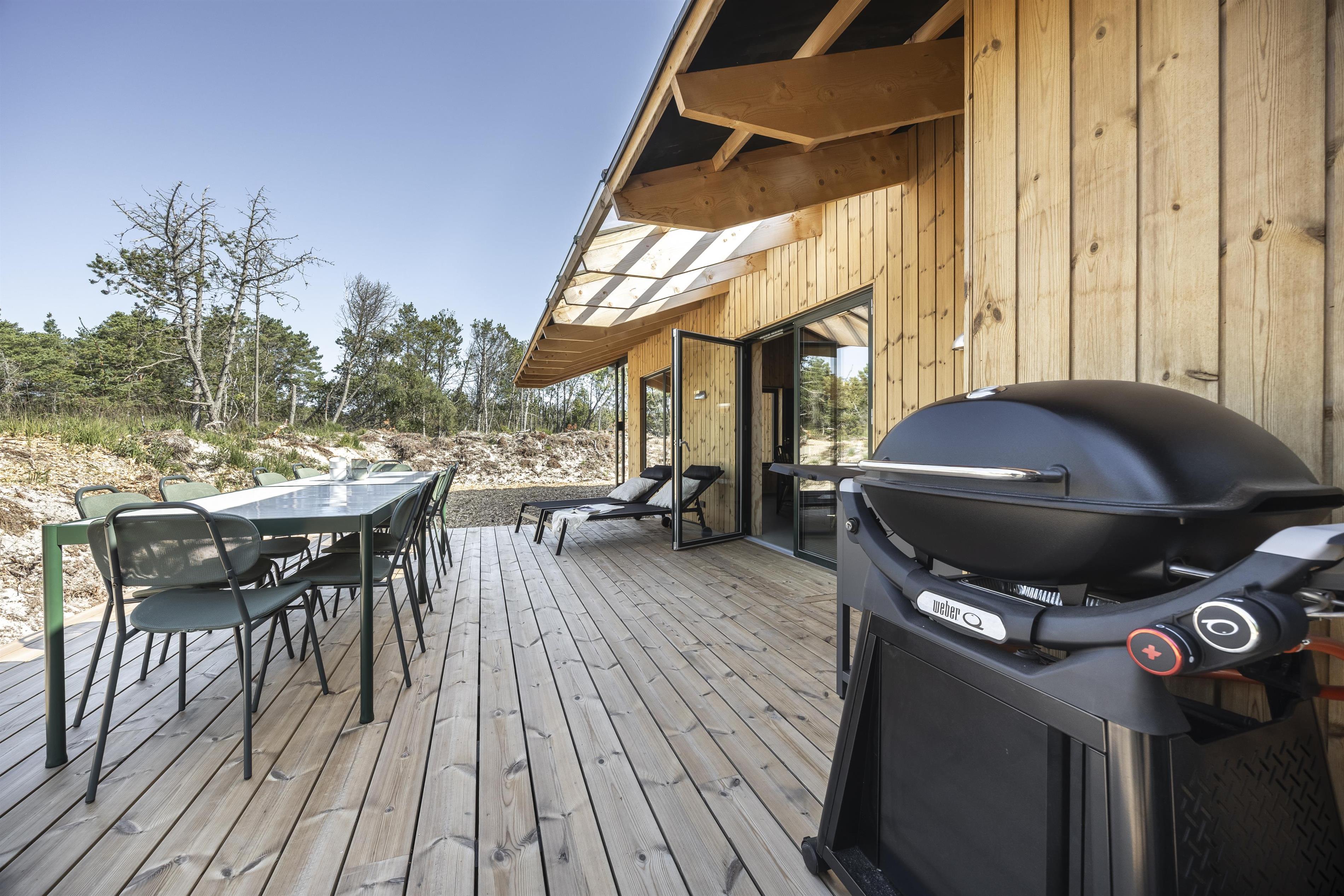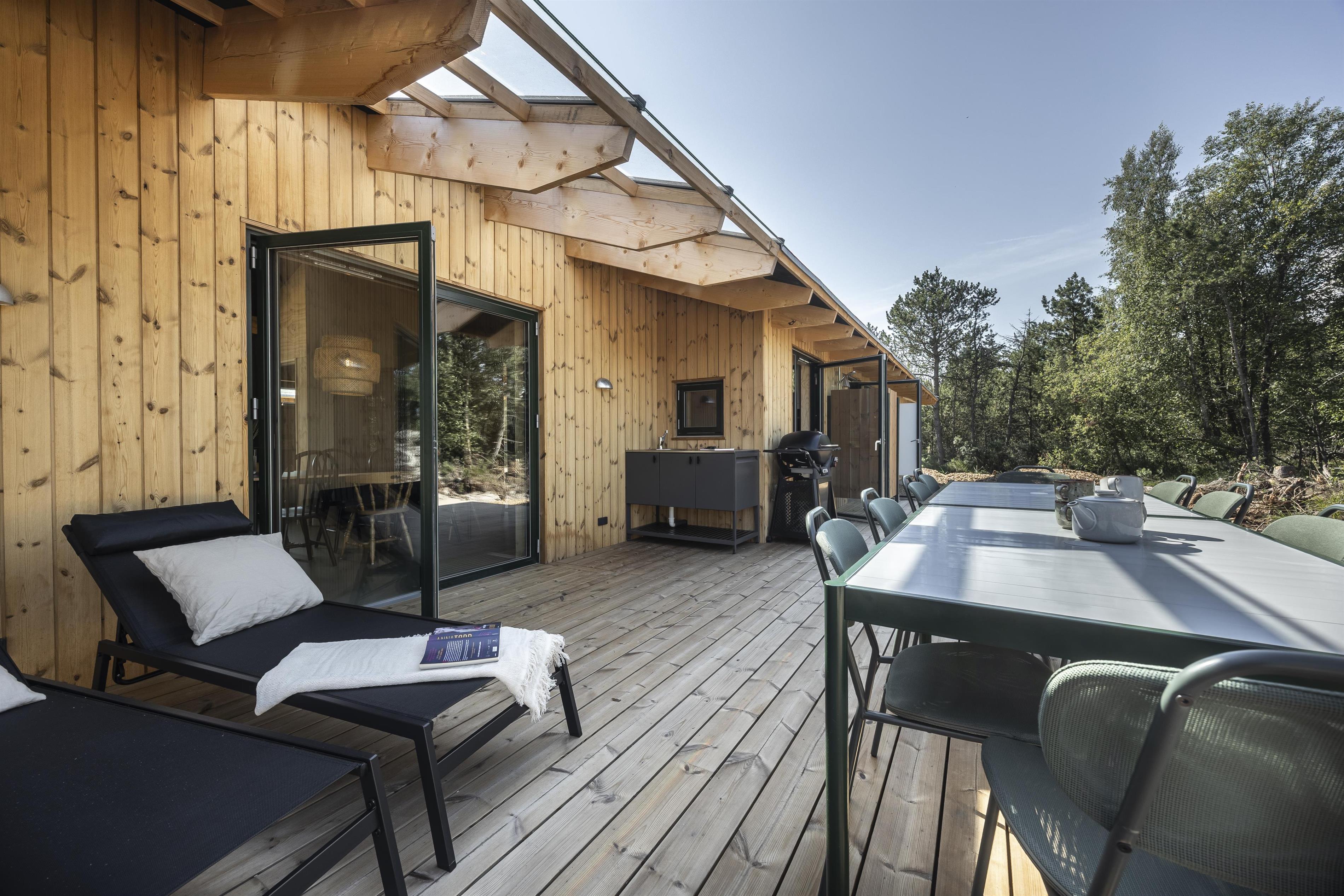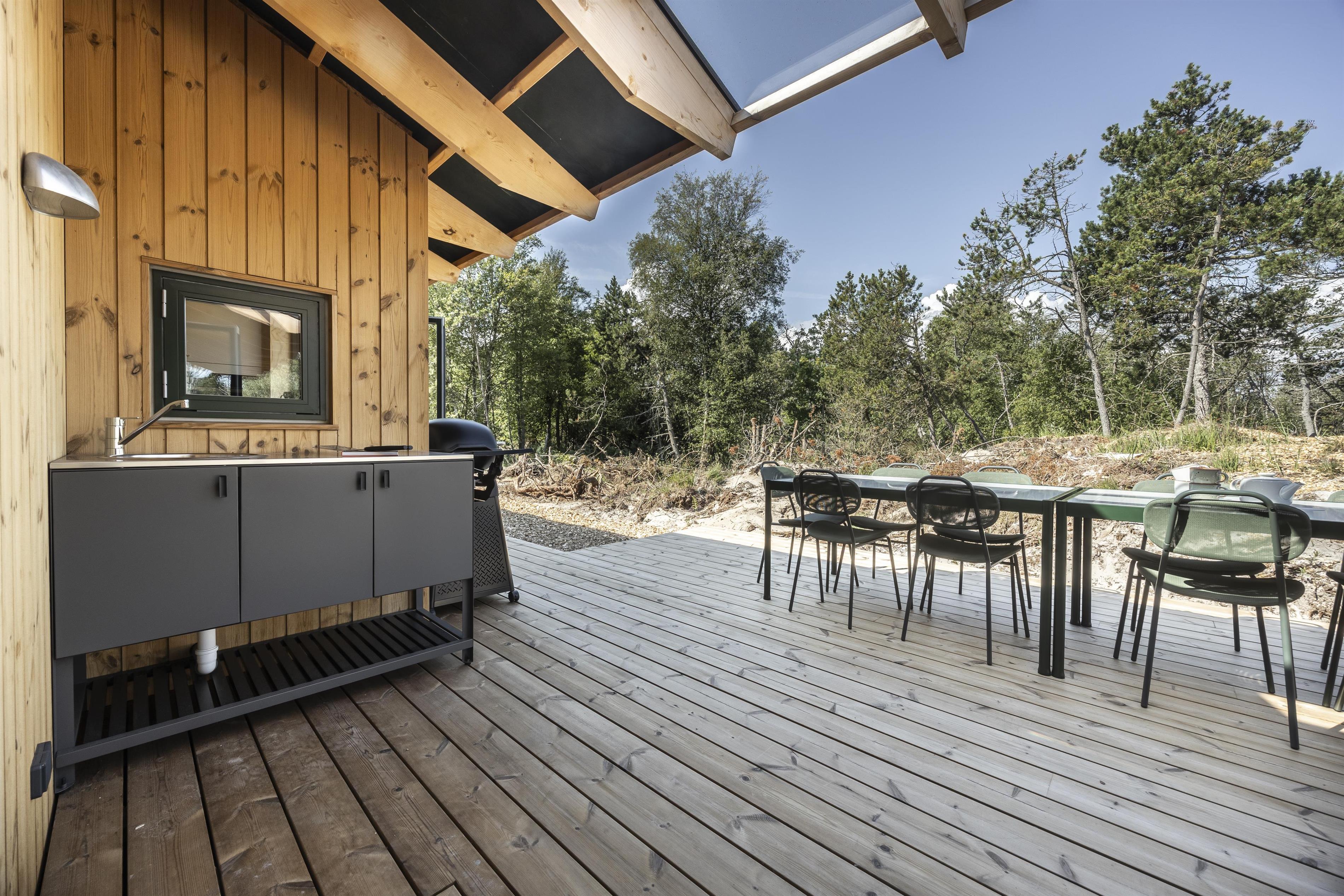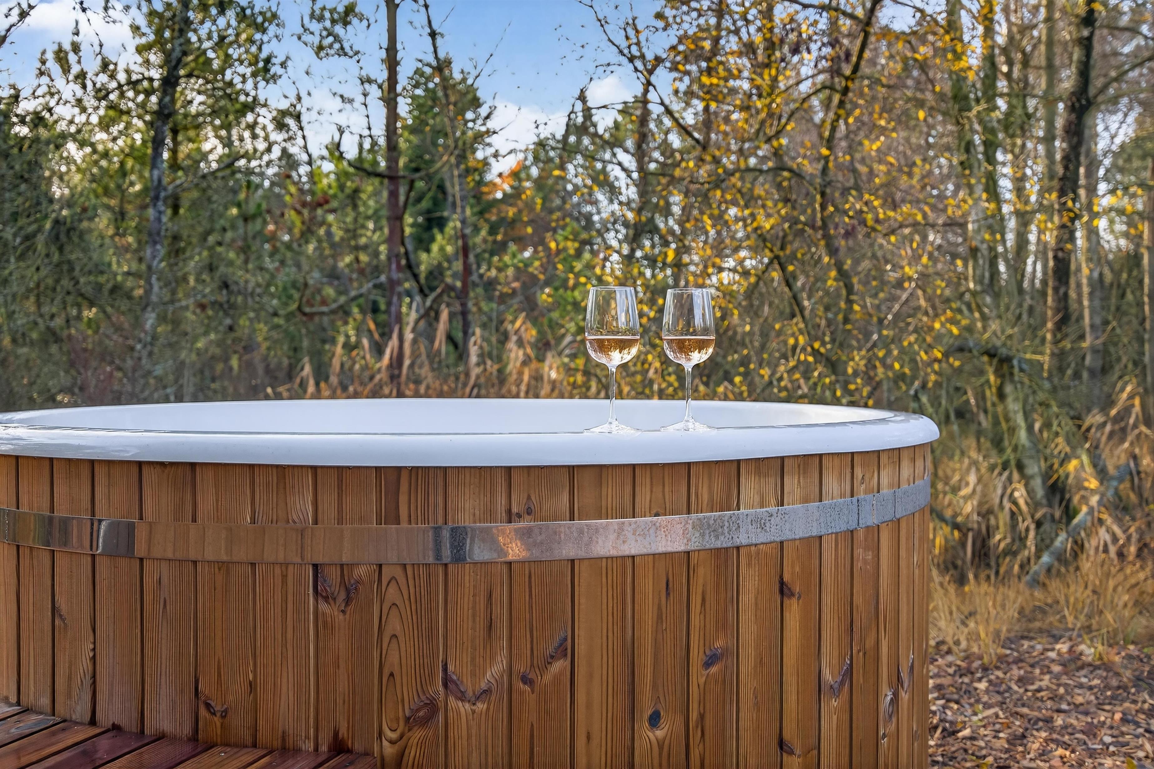 Auf den Terrassen laden bequeme Liegestühle zu langen, entspannten Stunden ein – und als i-Tüpfelchen könnt ihr im einladenden Badefass entspannen. Hier erwartet euch Wellness unter freiem Himmel, ausschließlich elektrisch beheizt, sodass ihr auf Feuerholz verzichten und die wohlige Wärme mit gutem Gewissen und maximalem Komfort genießen könnt.