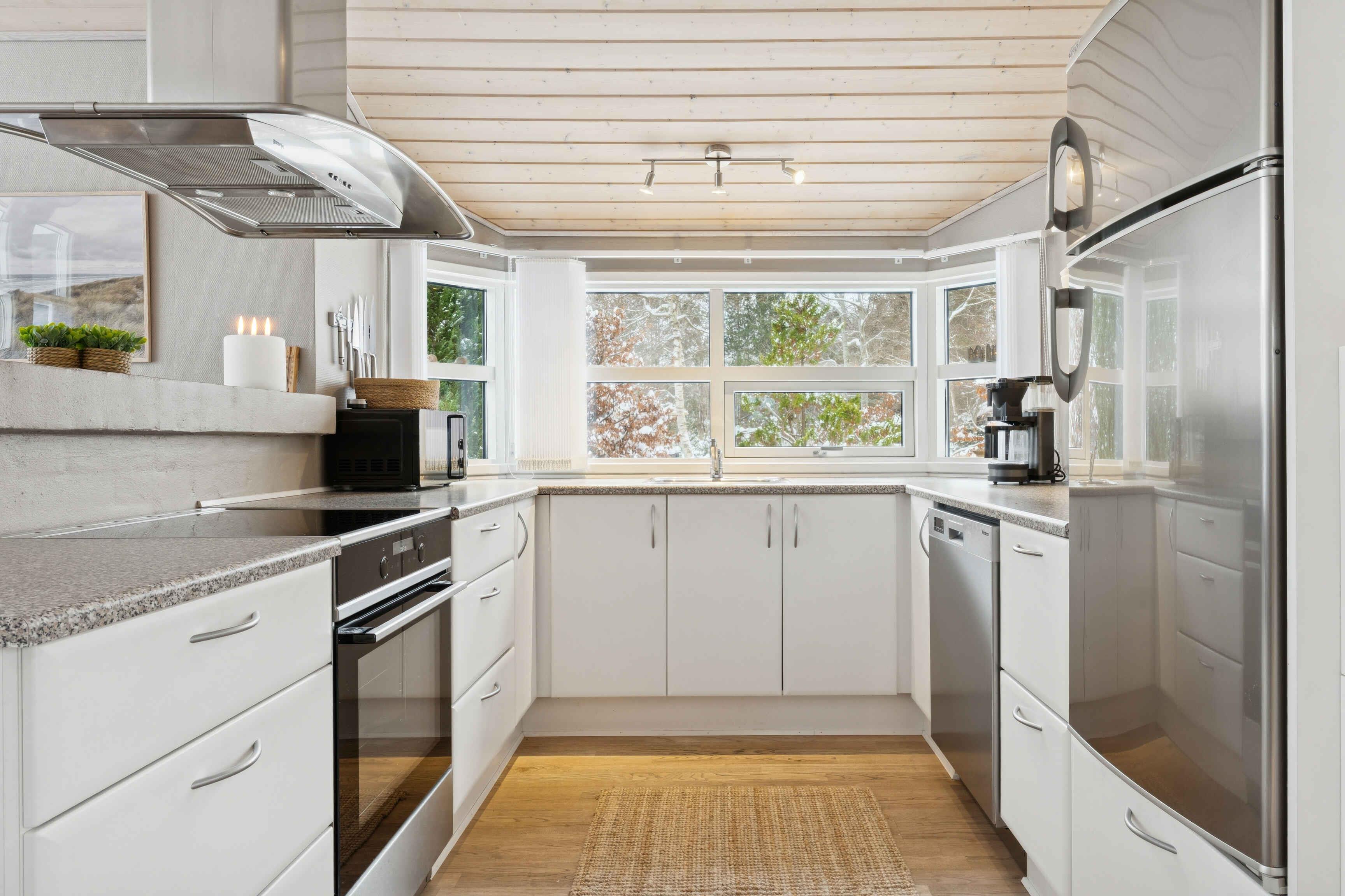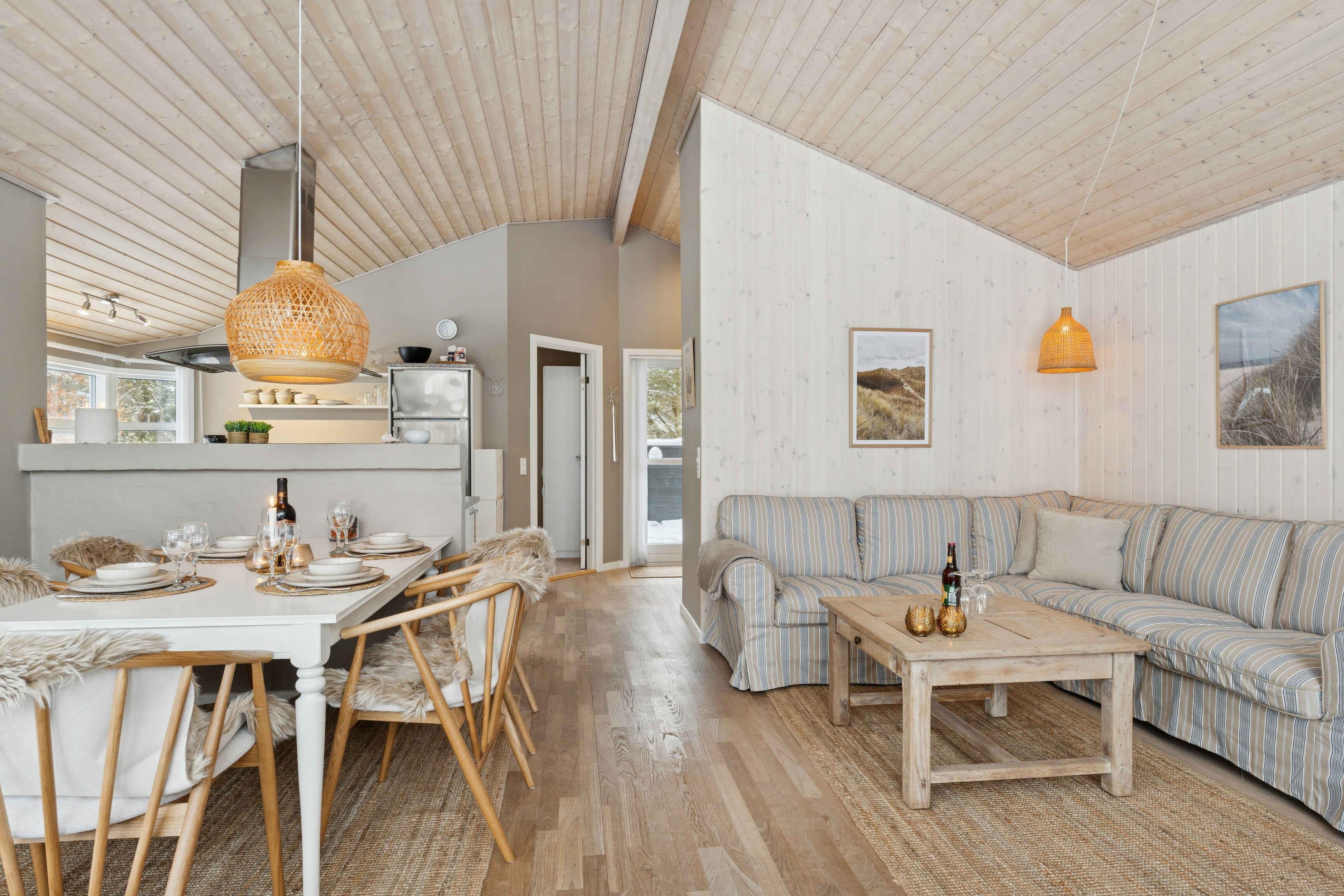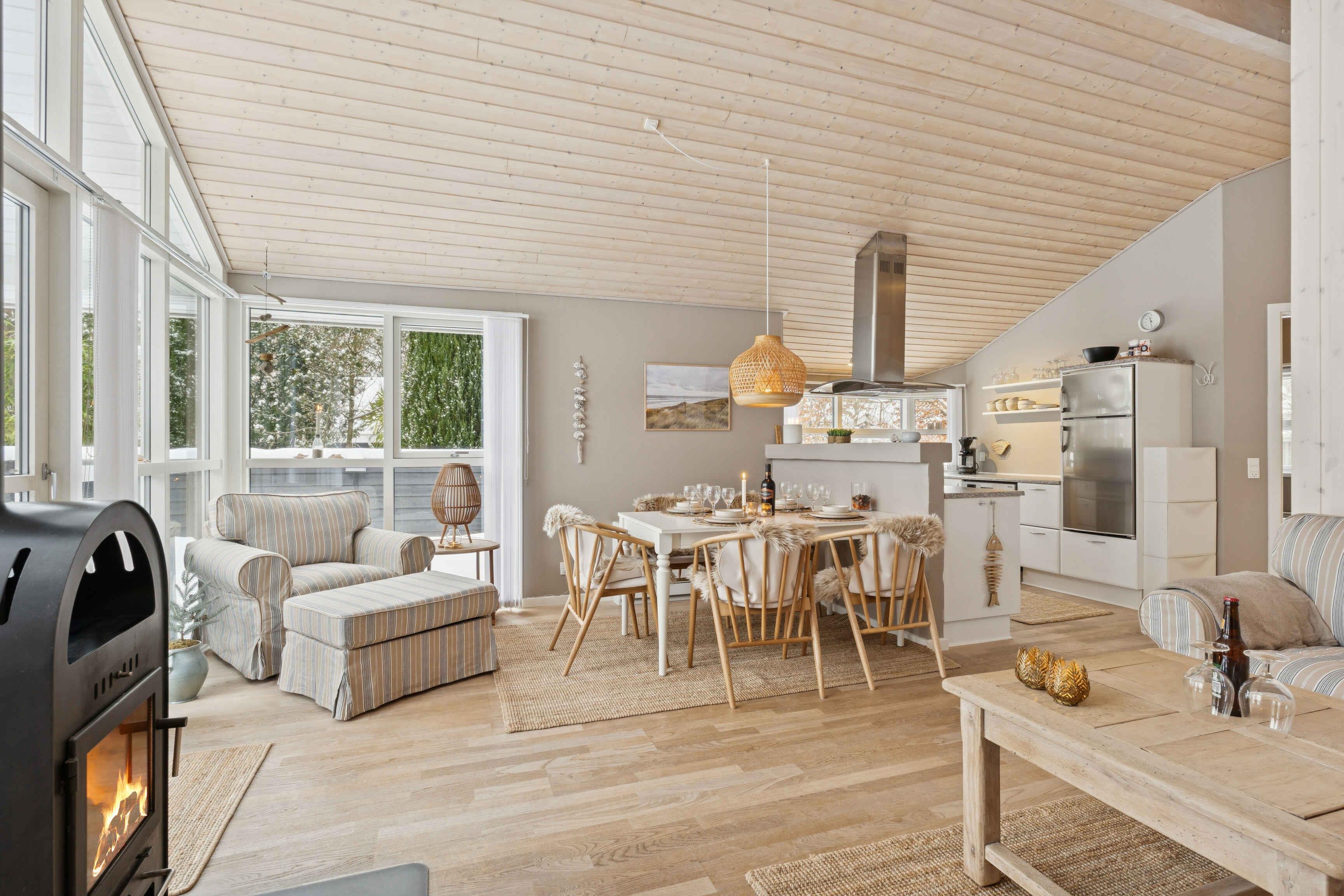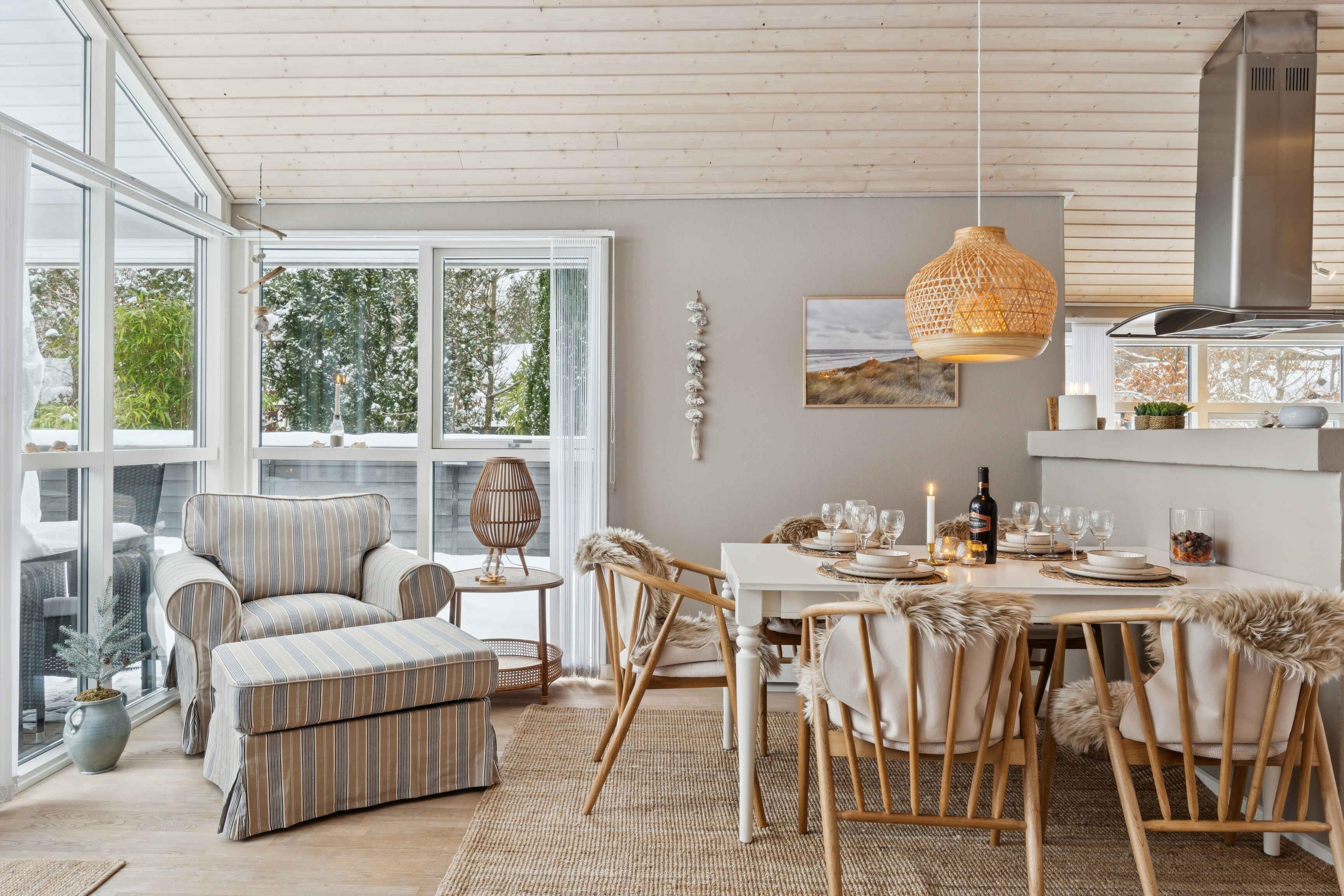 Gepflegtes Ferienhaus mit 70 m², 3 Schlafzimmern und 5 Schlafplätzen. Gemütliche Atmosphäre mit Holzpaneelen und Kaminofen. Überdachte Terrasse und Annex. Nahe Strand und Natur in Nordjütland.