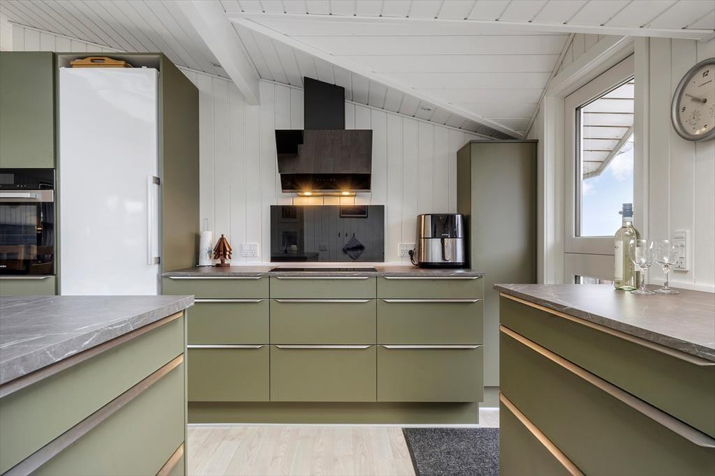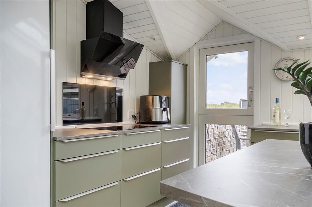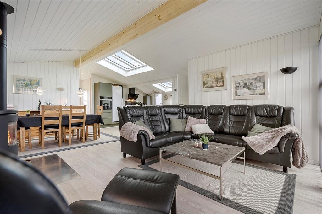 Im Tingodden 298 erwarten Sie ein Haupthaus und ein Nebengebäude. Letzteres umfasst zwei Schlafzimmer mit insgesamt vier Schlafplätzen, ein Badezimmer und einen Wohnraum mit einem Sofa und einem Fernseher. Dadurch eignet sich dieses Nebengebäude unter anderem sehr schön für Teenager, die nicht unbedingt jede einzelne Minute mit den Eltern verbringen möchten. Das Hauptgebäude enthält ebenfalls ein Badezimmer und zwei Schlafzimmer mit vier Schlafplätzen. Hinzu gesellt sich ein offener Aufenthaltsbereich, der den Wohnraum und die gut ausgestattete Küche offen in sich vereint. In diesem Raum können alle Mitreisenden gemeinsam die Mahlzeiten zubereiten und im Anschluss am Esstisch genießen. Die Küche verfügt über einen schönen Tresen mit Barhockern. Die bodentiefe Fensterpartie lässt viel Tageslicht durch den Raum strömen. Ein Kaminofen und eine Wärmepumpe sorgen für behagliche Temperaturen und eine gemütliche Atmosphäre. Zu entspannten Abenden laden die Polstersitzgarnitur und der Fernseher ein.