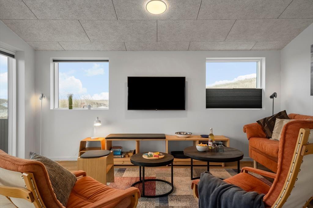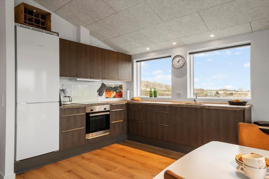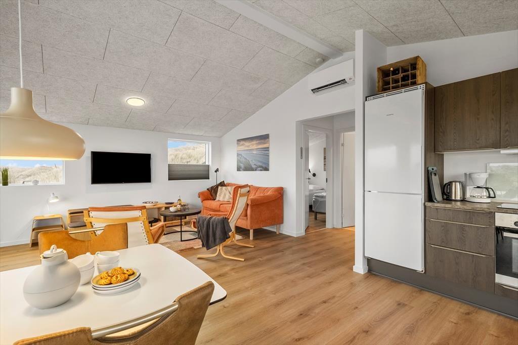 Im Inneren empfängt dich eine helle, einladende Atmosphäre, in der Materialien und Einrichtung perfekt auf die naturnahe Lage abgestimmt sind. Der offene Wohnbereich verbindet Küche, Essplatz und Wohnzimmer zu einem gemeinsamen Raum, in dem das Urlaubsleben ganz selbstverständlich zusammenfindet – ob morgens ruhig zur ersten Tasse Kaffee oder abends bei geselligen Gesprächen auf dem Sofa. Große Fensterflächen holen das Licht und die Landschaft direkt ins Haus und eröffnen einen wunderbaren Blick auf die Dünen, während du in der Ferne den Fjord zwischen Strandhafer und Heide schimmern siehst.