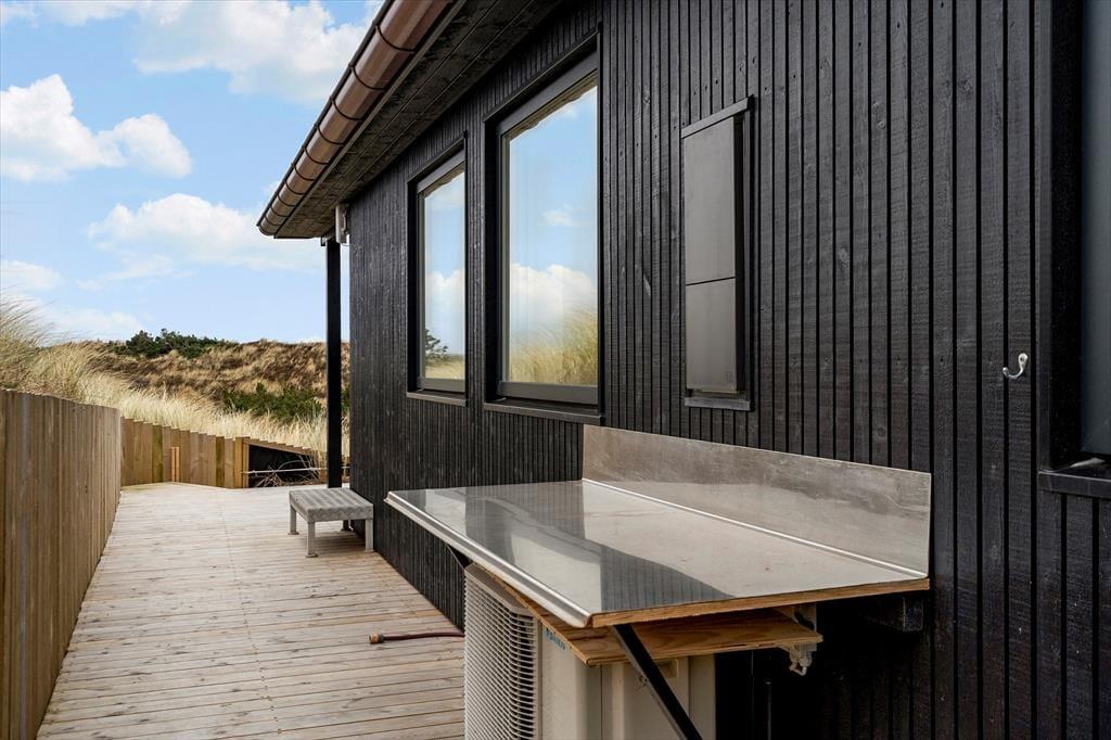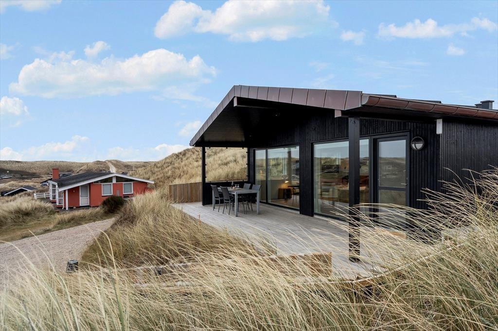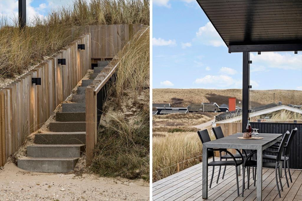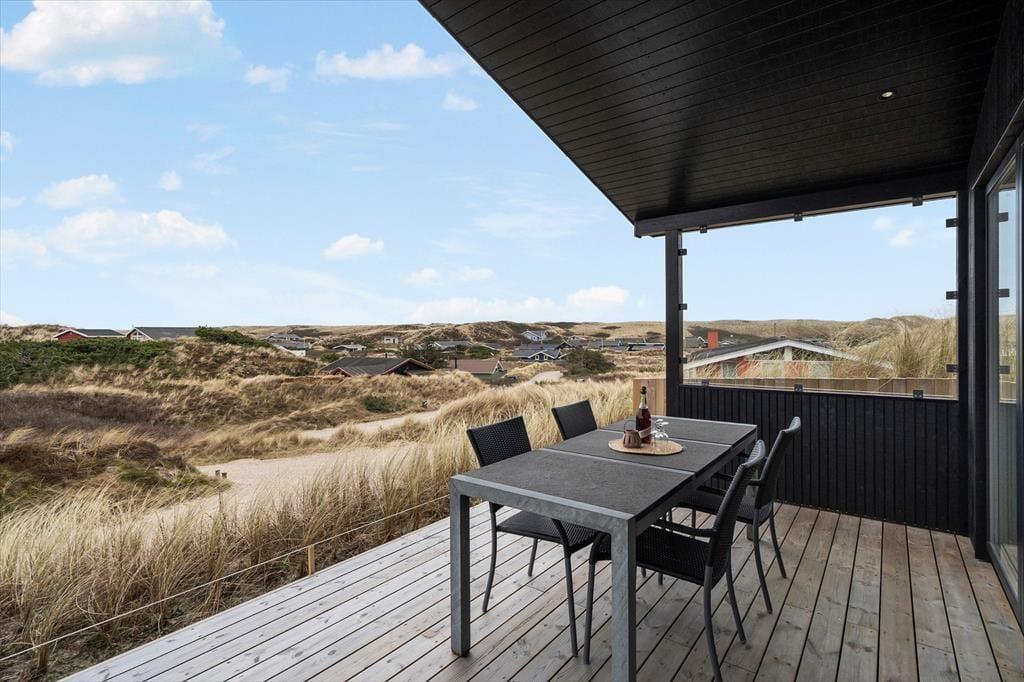 Das Leben unter freiem Himmel entfaltet sich auf der großzügigen Holzterrasse, die sich rund um das Ferienhaus erstreckt. Teile der Terrasse sind überdacht, sodass du je nach Wetter und Wind immer ein geschütztes Plätzchen findest. Hier kannst du deinen Tag mit Vogelgezwitscher und Aussicht auf die Dünen beginnen und ebenso entspannt ausklingen lassen, während du deinen Blick über die Landschaft mit dem Fjord in der Ferne schweifen lässt.
