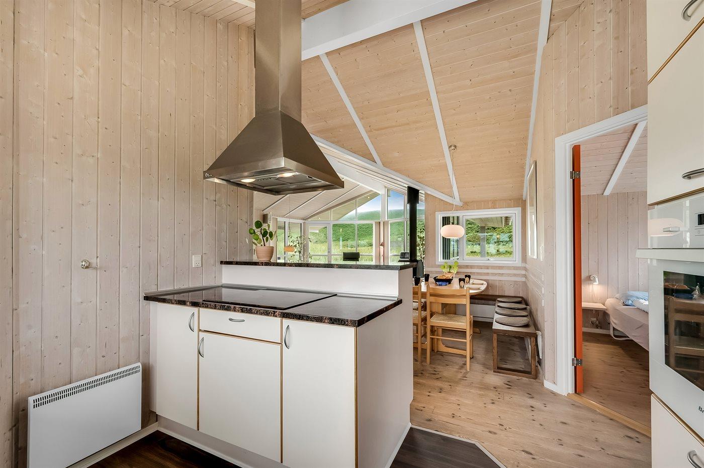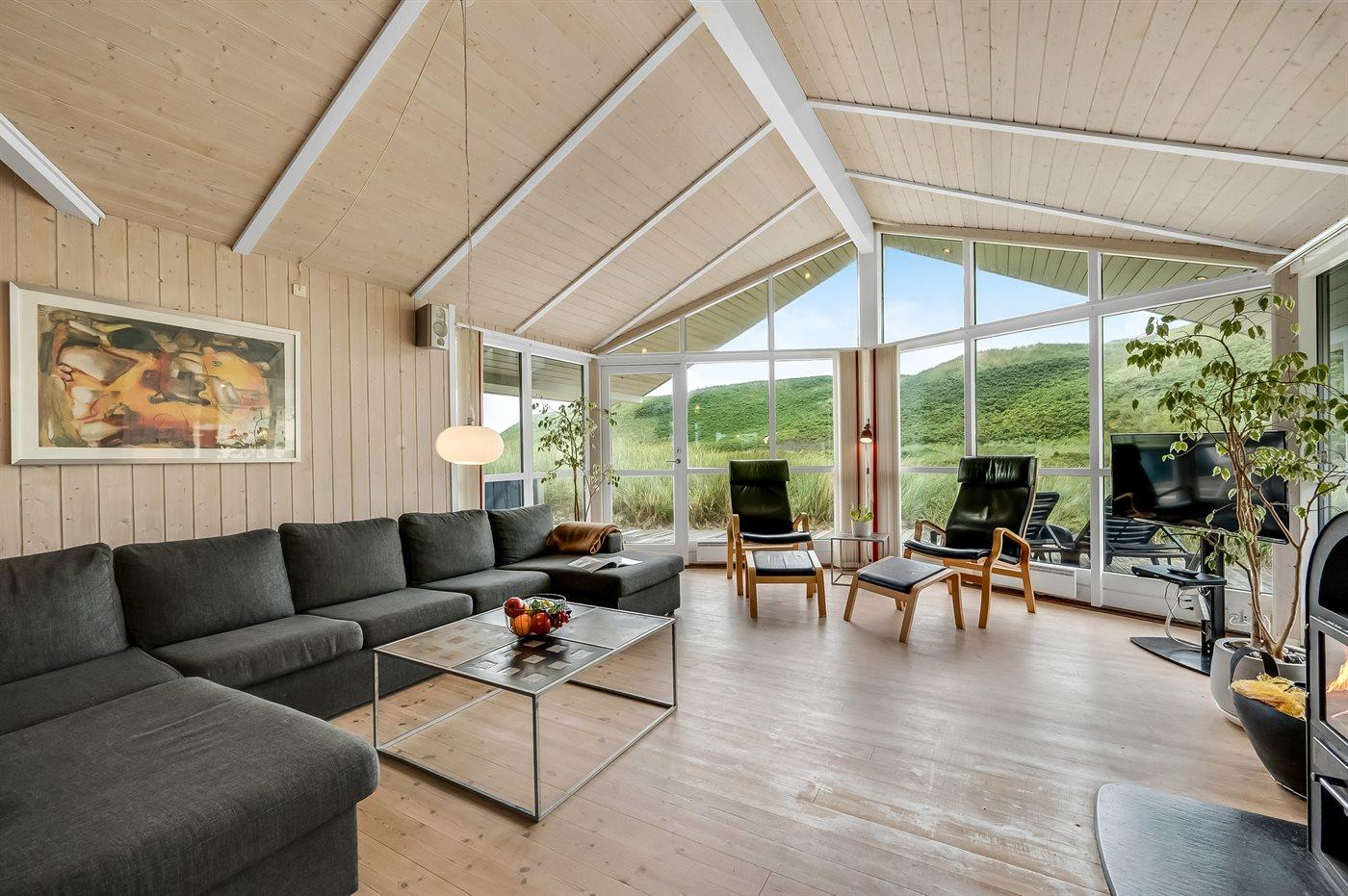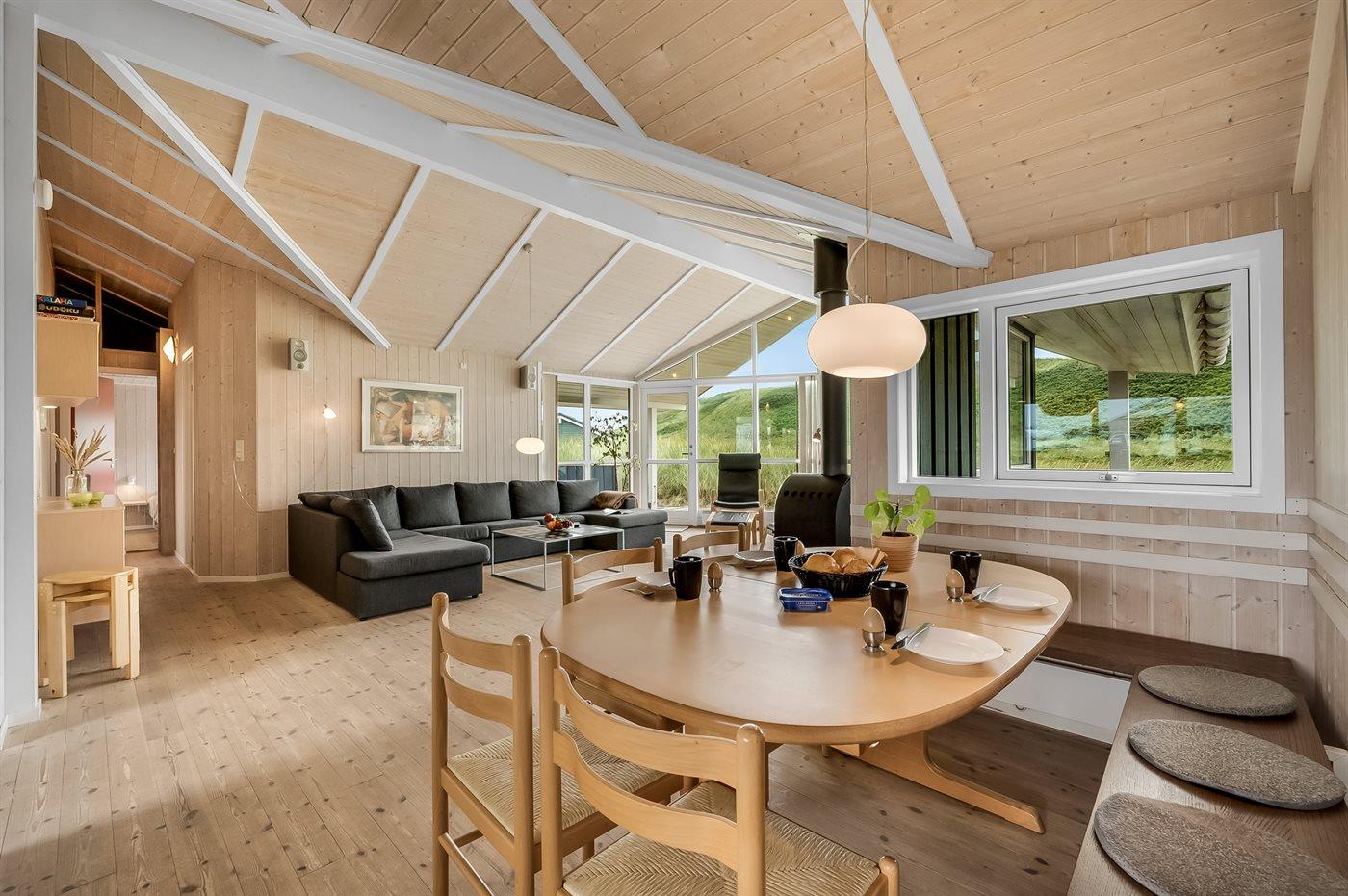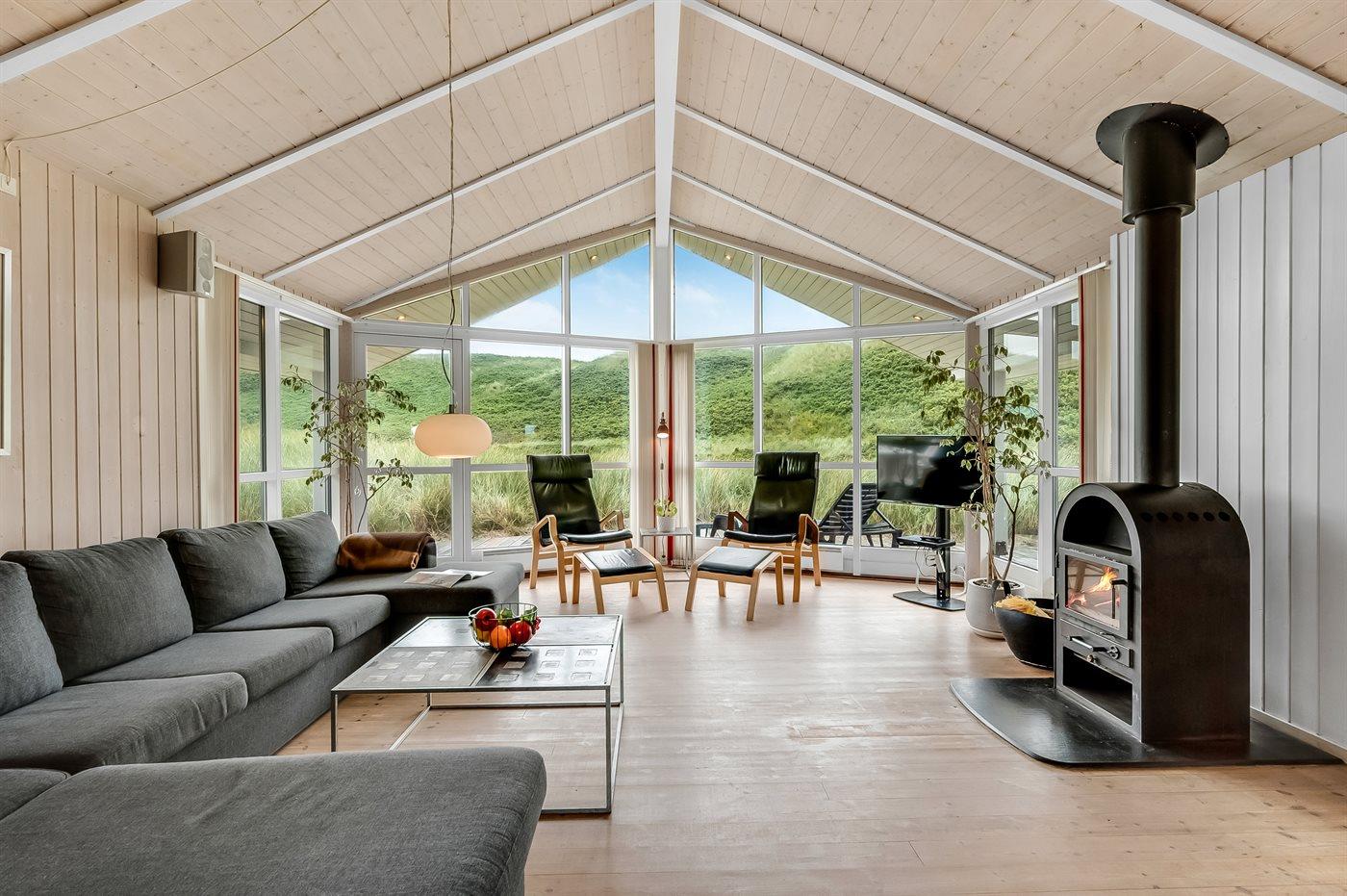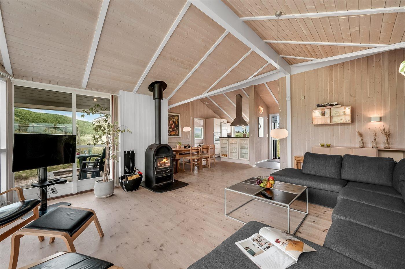 Der Küchen-Wohnbereich des Ferienhauses bietet Decken bis zum First und große Fenster mit einem herrlichen Blick auf die Dünenlandschaft. Im gemütlichen Wohnzimmer kannst du es dir mit einem guten Buch auf der Couch bequem machen und das knisternde Feuer im Kaminofen genießen.