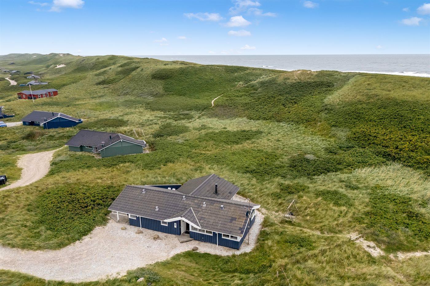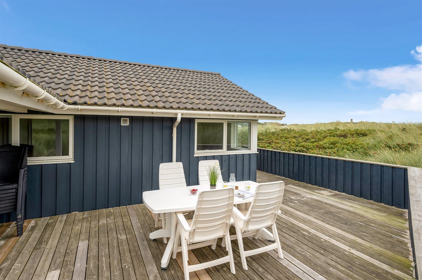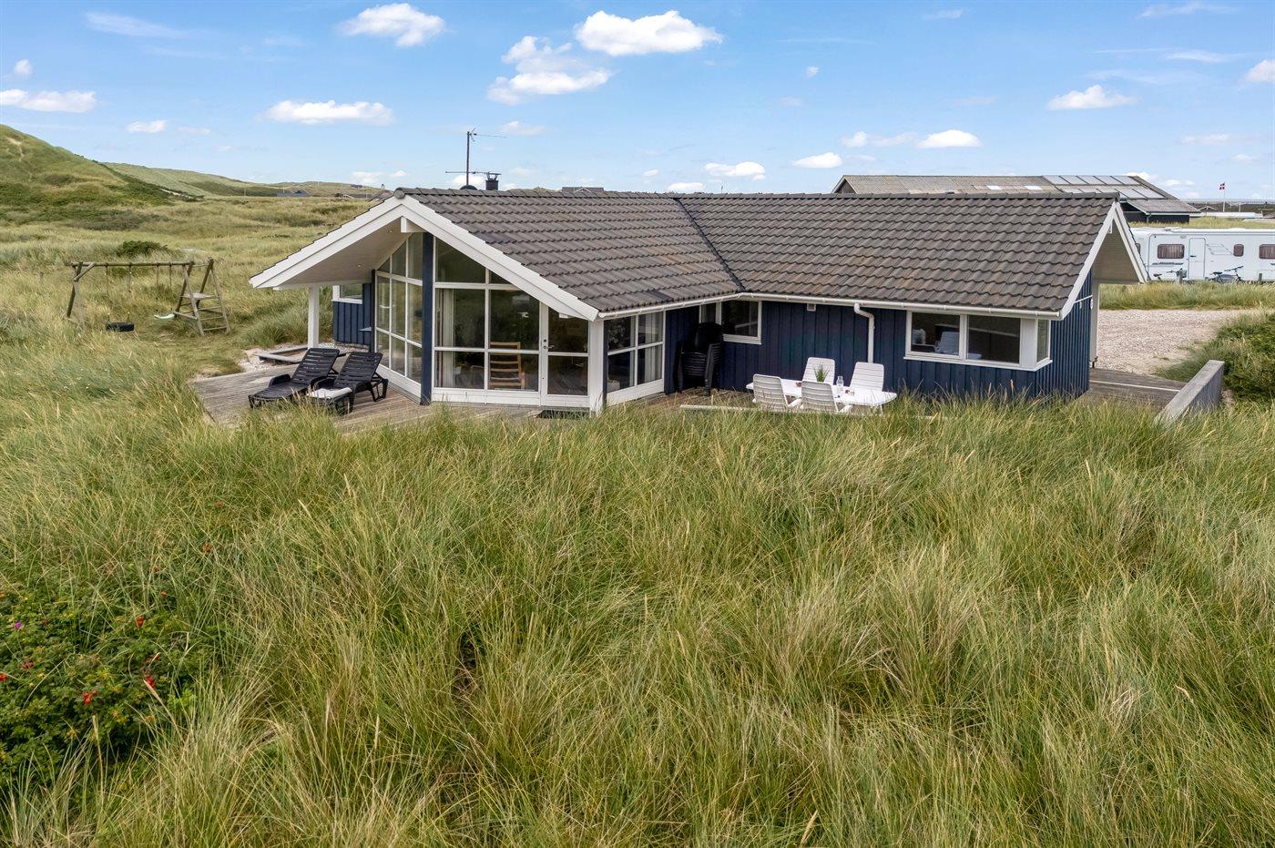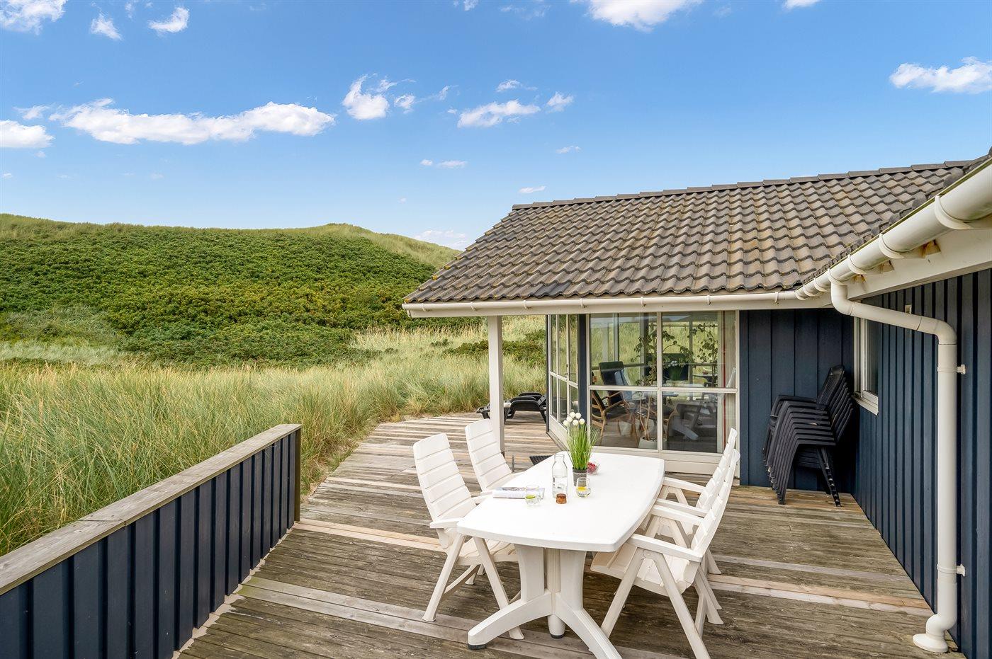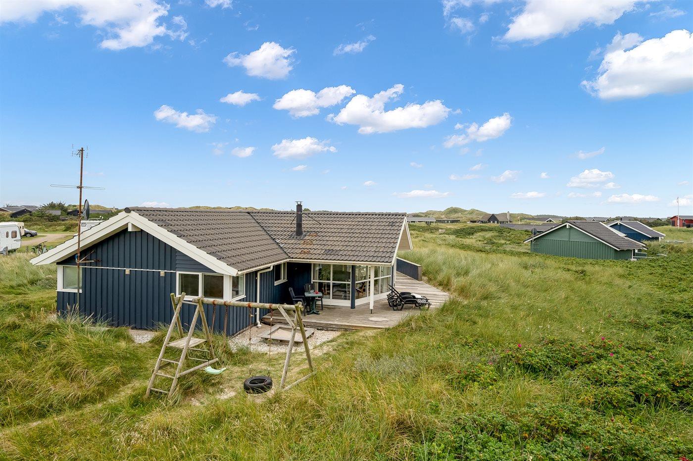 Möchtest du lieber die schöne Natur sowie den Klang und den Duft der Nordsee genießen, bietet die südwestlich ausgerichtete, große und teilweise überdachte Terrasse viele Möglichkeiten. Hier wirst du dich ganz sicher mit der Natur verbunden fühlen. Wenn Kinder mit im Urlaub sind, können sie draußen spielen, wo es eine Schaukel und einen Sandkasten gibt. Mit der Nordsee auf der anderen Seite der Düne kannst du die schöne dänische Westküste bei jedem Wetter genießen.
