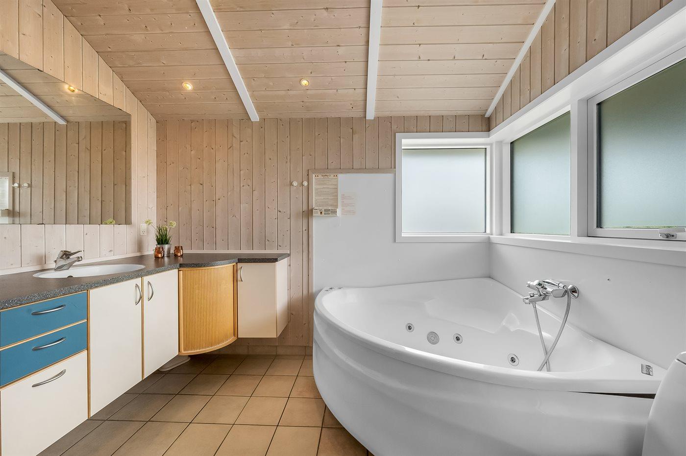 Die Küche des Ferienhauses ist komplett ausgestattet mit Kühlschrank (inkl. 20 l Gefrierfach), 4 Cerankochfeldern, Backofen und Mikrowelle sowie Geschirrspüler. Es gibt 2 Schlafzimmer mit Doppelbetten, zwei Schlafzimmer mit jeweils zwei Einzelbetten sowie ein offenes Obergeschoss. Es gibt 2 Badezimmer mit Fußbodenheizung – eines mit Whirlpool, Sauna und Duschnische und das andere mit Duschnische. Hier findest du auch die Waschmaschine und den Wäschetrockner des Hauses.