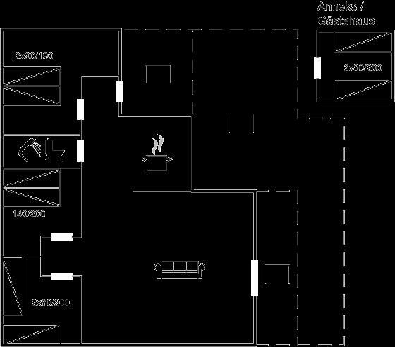 Die Schlafplätze verteilen sich auf 3 Schlafräume. 4 Schlafplätze in Doppelbetten. 4 Schlafplätze in Einzelbetten. 2 von diesen Schlafplätzen befinden sich im Gästehaus. Ferner steht ein Kinderbett zur Verfügung.