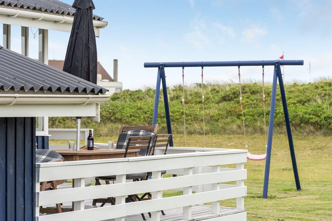 Auf einem großen Naturgrundstück nur 150 m von der Nordsee entfernt liegt dieses Ferienhaus aus Holz, 1975 gebaut, 2003 völlig renoviert und seitdem laufend gepflegt. Zum Haus gehören sowohl überdachte als auch offene, nach Süden gerichtete Terrasse mit Gartenmöbeln. Innen sind die Böden mit Teppich ausgelegt, jedoch PVC-Boden in der Küche. Die Wände und Decken sind mit hellem, rustikalem Holz verkleidet. Badezimmer mit Duschnische und Zutritt zu einem separaten Raum mit 2-Pers. Whirlpool und Zutritt zur Sauna. Die schöne Küche ist u. a. mit Mikrowelle, Umluftofen und Geschirrspüler ausgestattet. Das helle Wohnzimmer enthält Kaminofen, DVD-Spieler, TV mit digitalem Satellitenanschluss, Video sowie Stereoanlage mit CD-Spieler. Die Schlafplätze verteilen sich auf 2 Zimmer mit Doppelbett und 1 Zimmer mit 2 Einzelbetten. Ferner stehen kostenlose, kabellose Internetverbindung (Computer ist mitzubringen), Waschmaschine sowie Wäschetrockner zur Verfügung und es ist eine energiegerechte Wärmepumpe installiert. Für die kleinen Feriengäste gibt es Sandkasten und Schaukel auf dem Grundstück. Nicht weit vom Haus entfernt gibt es einen Put & Take Angelsee und ein Fahrradweg durch das Dünengebiet, der sich von Nymindegab bis nach Søndervig erstreckt. Ein schönes Ferienhaus mit einer guten Lage zu jeder Jahreszeit.