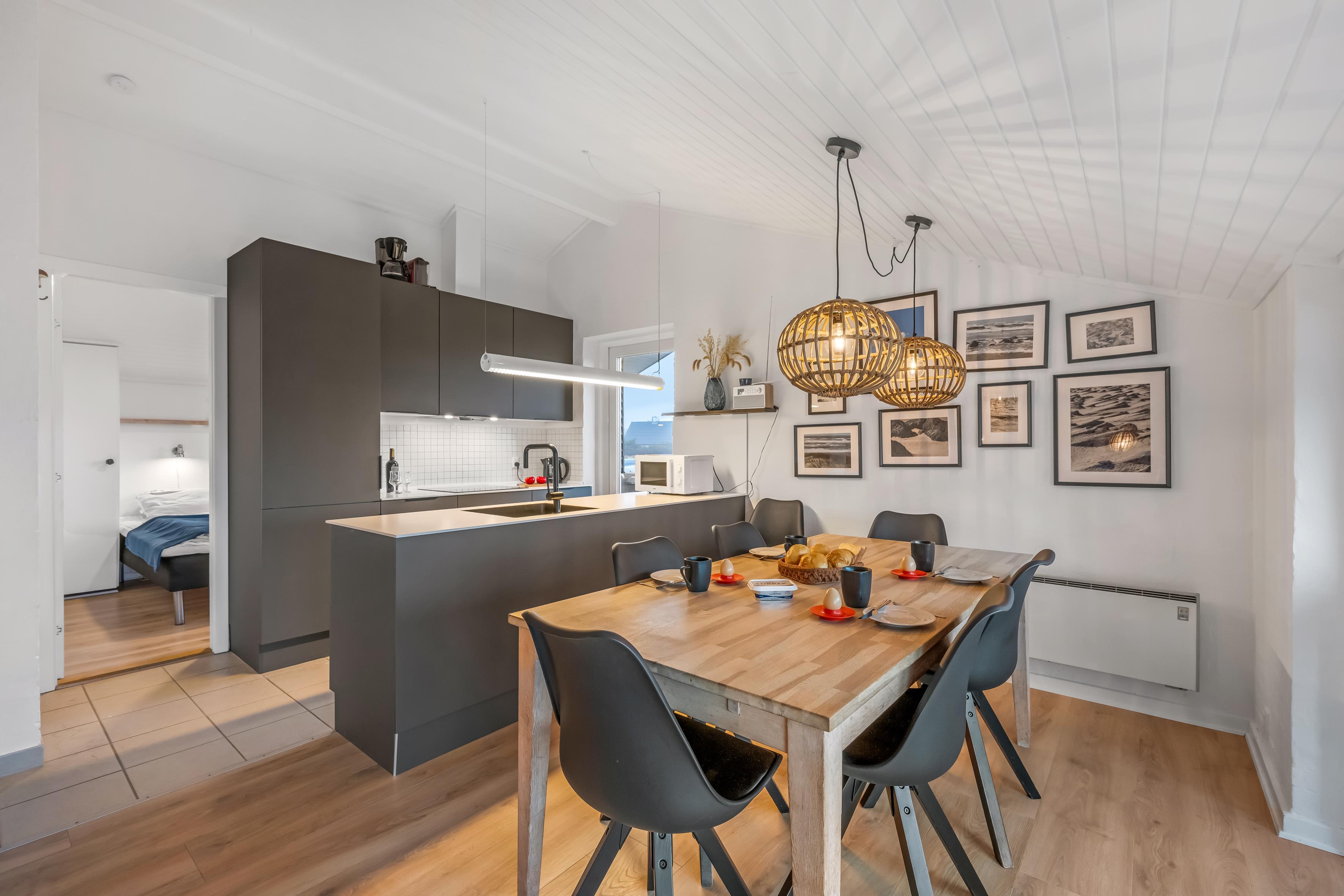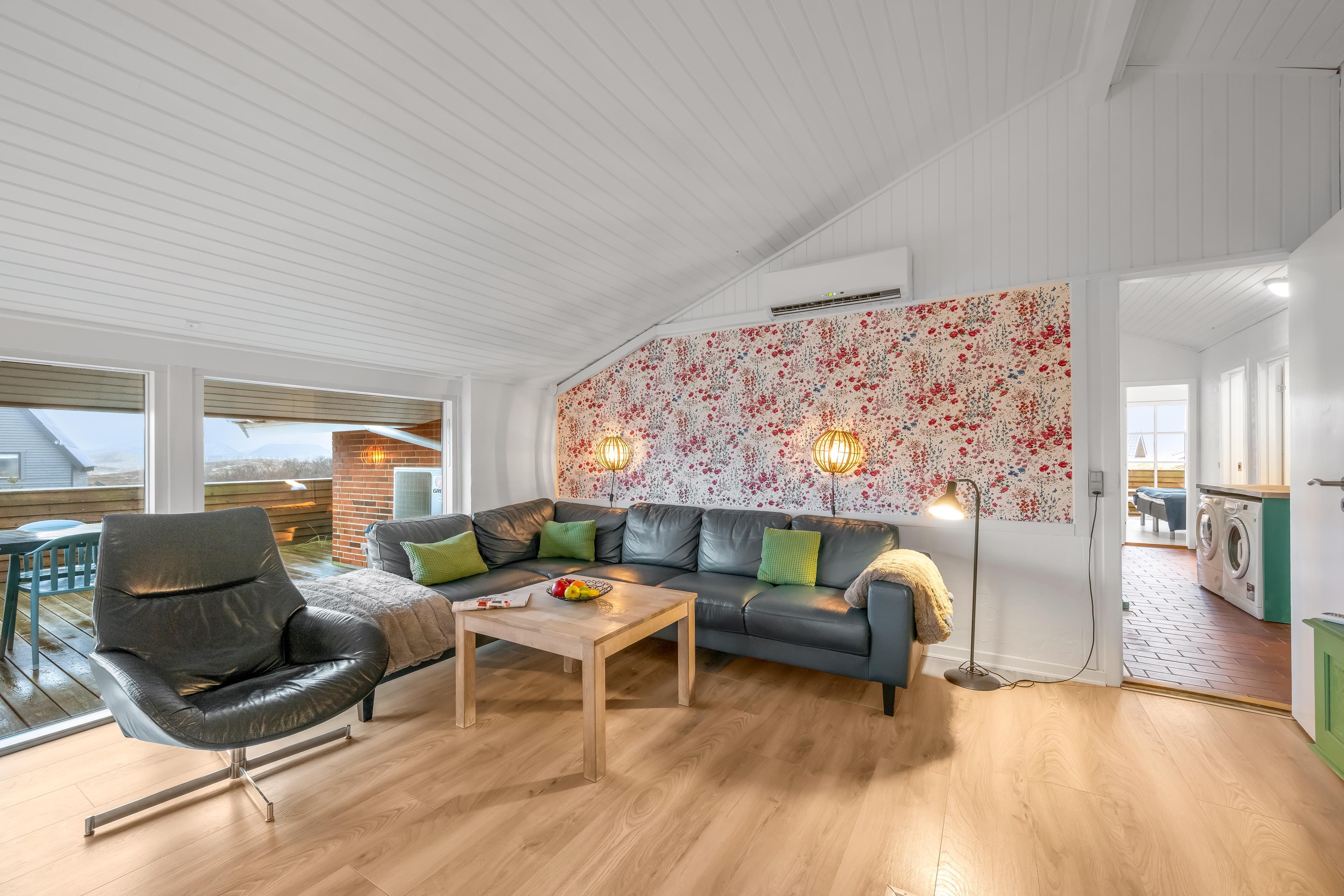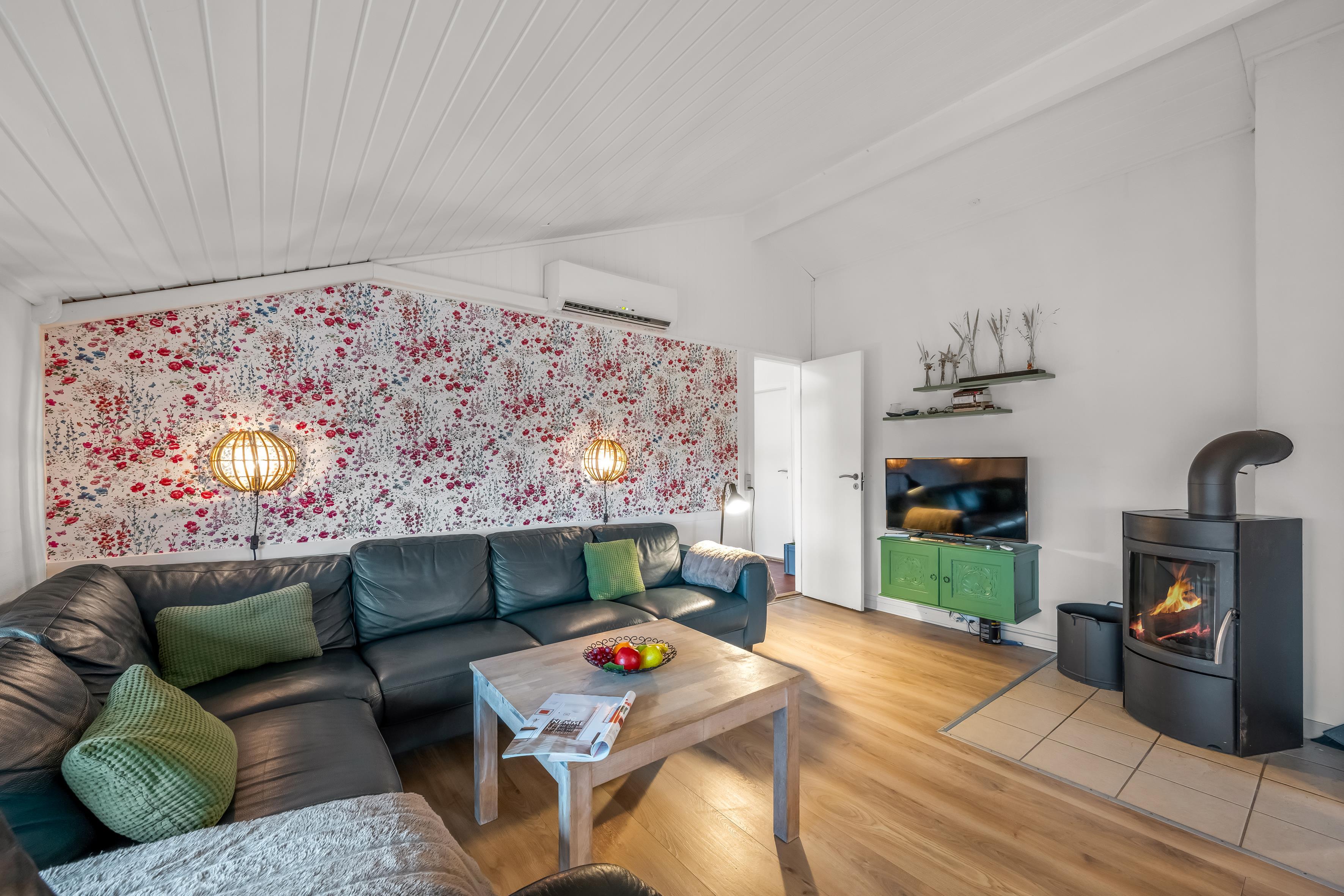 Das gemütliche Wohnzimmer verfügt über einen Kaminofen, der an kühlen Abenden für eine warme und einladende Atmosphäre sorgt. Zusätzlich gibt es eine energiesparende Wärmepumpe, die an wärmeren Tagen auch als Klimaanlage genutzt werden kann, sodass Sie das ganze Jahr über ein angenehmes Raumklima genießen können. Im Wohnzimmer finden Sie außerdem einen Fernseher mit dänischem und deutschem Fernsehen sowie Chromecast, sodass Sie Ihre Lieblingssendungen streamen können.