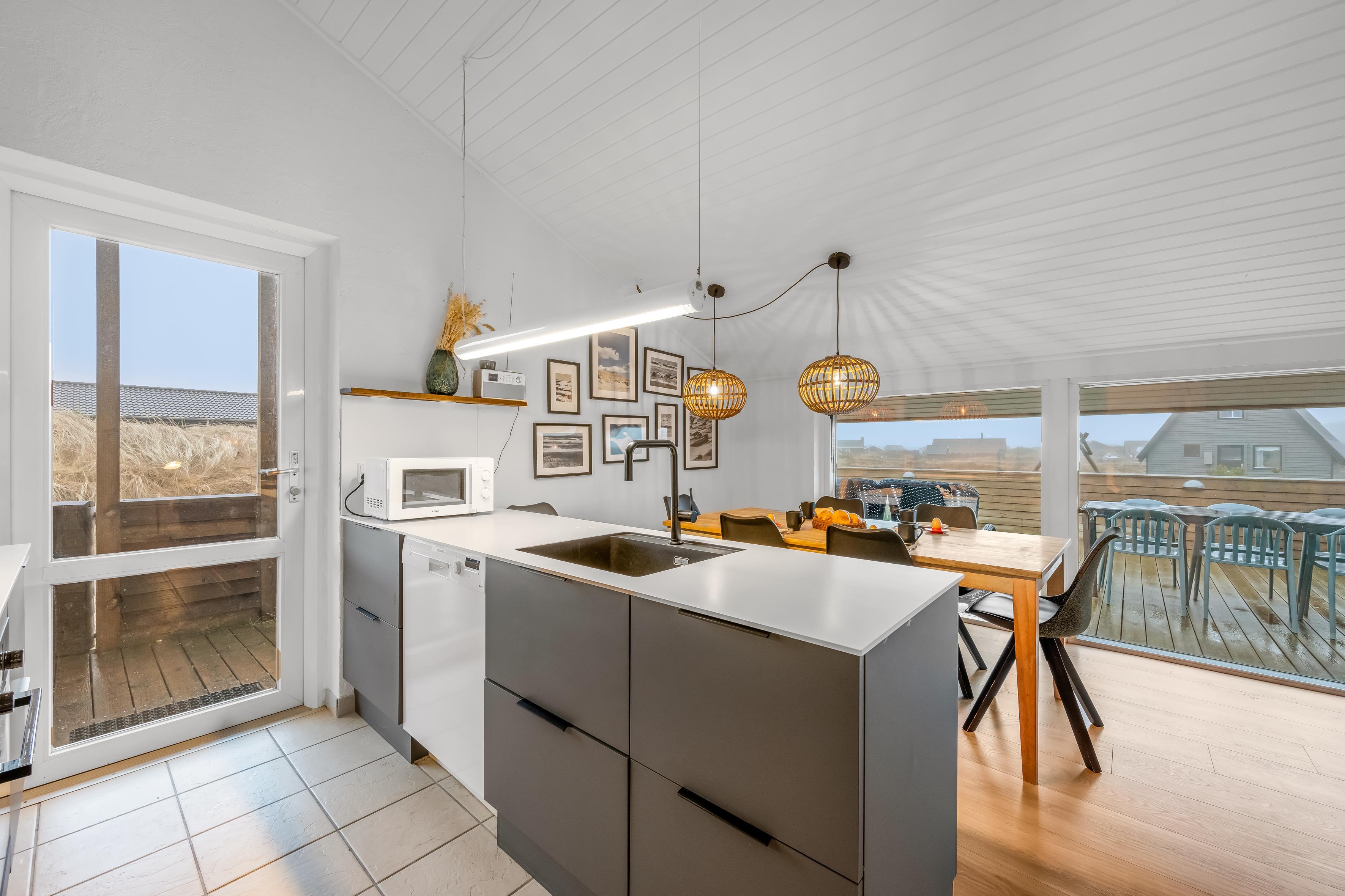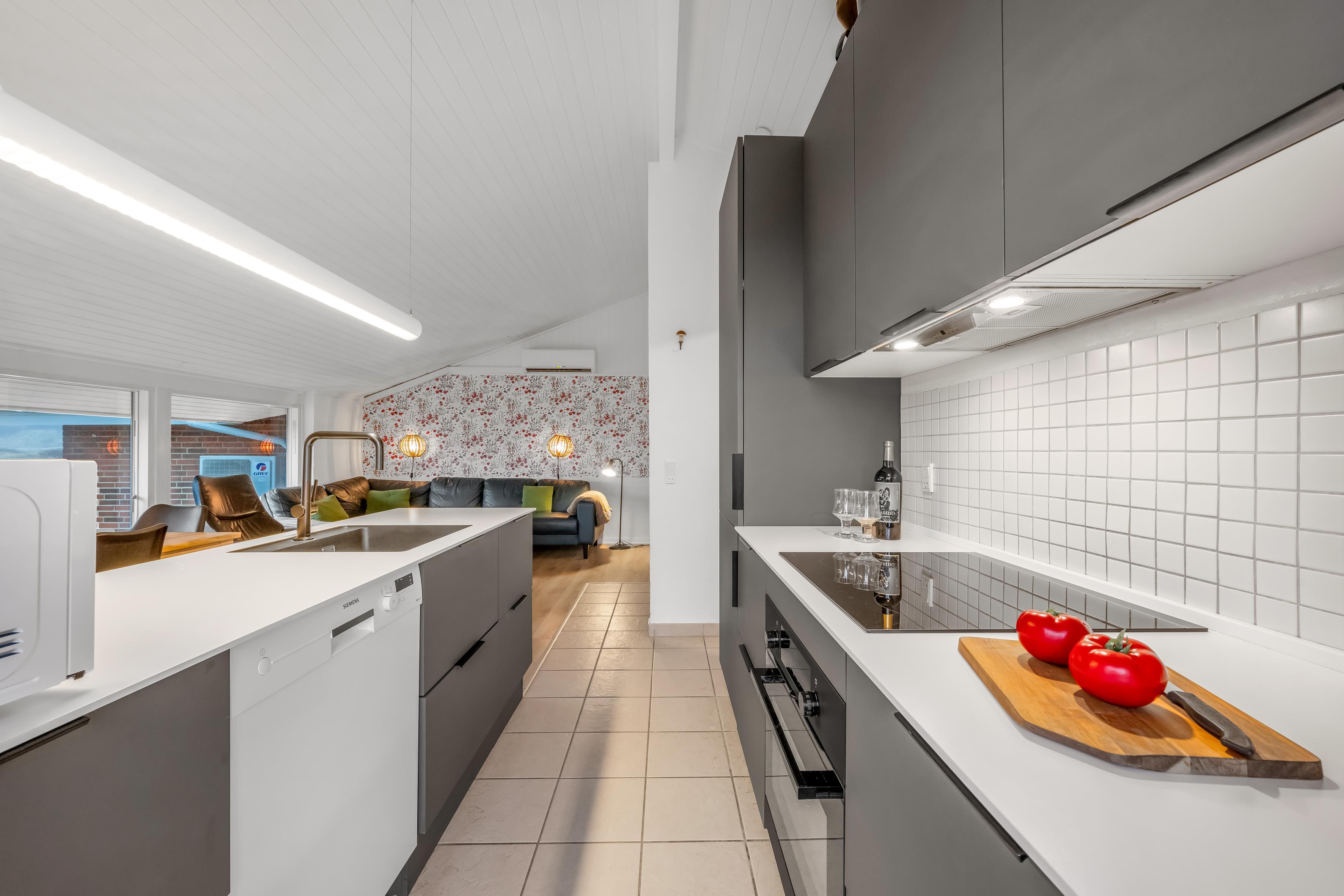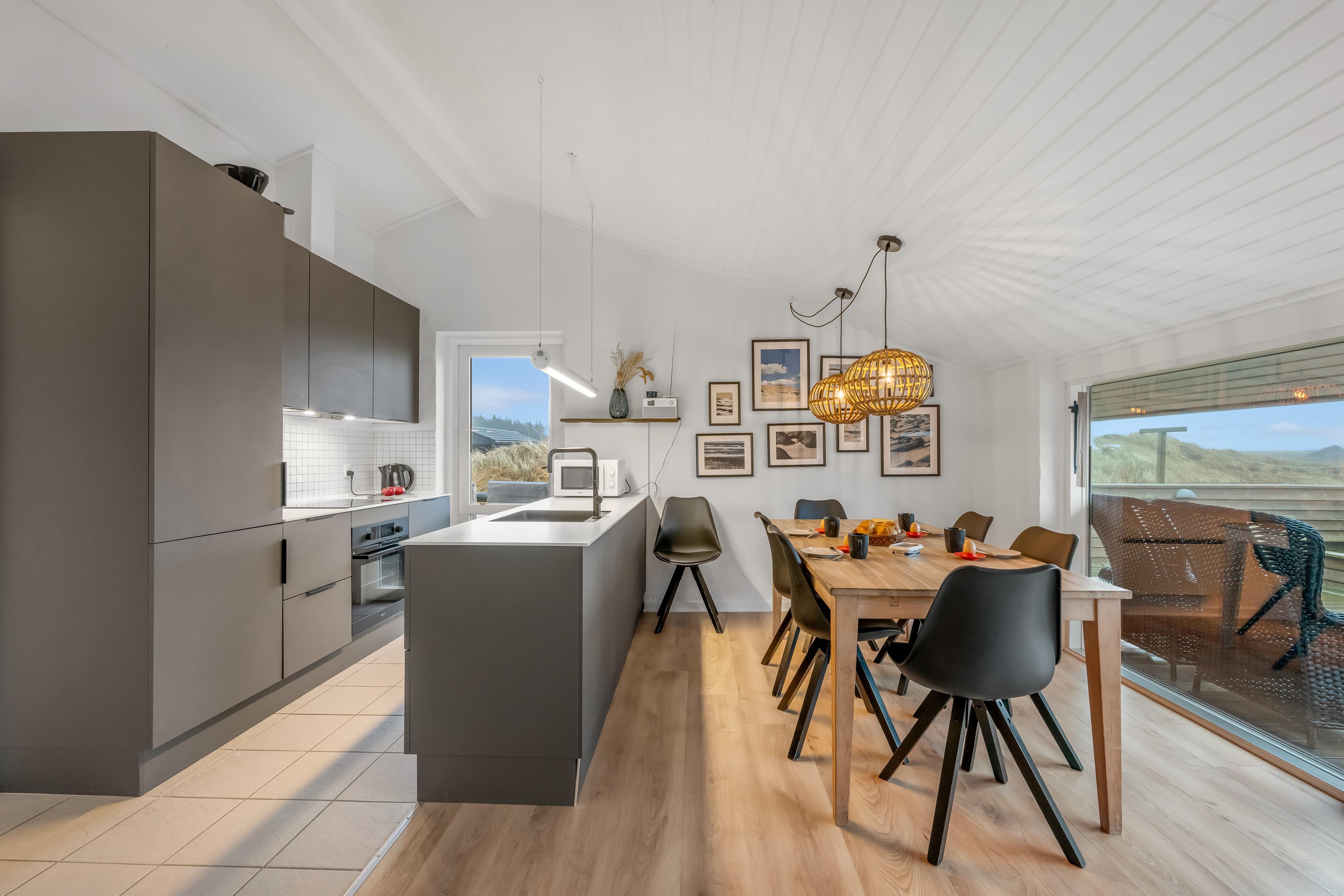 Das gemütliche Wohnzimmer verfügt über einen Kaminofen, der an kühlen Abenden für eine warme und einladende Atmosphäre sorgt. Zusätzlich gibt es eine energiesparende Wärmepumpe, die an wärmeren Tagen auch als Klimaanlage genutzt werden kann, sodass Sie das ganze Jahr über ein angenehmes Raumklima genießen können. Im Wohnzimmer finden Sie außerdem einen Fernseher mit dänischem und deutschem Fernsehen sowie Chromecast, sodass Sie Ihre Lieblingssendungen streamen können.