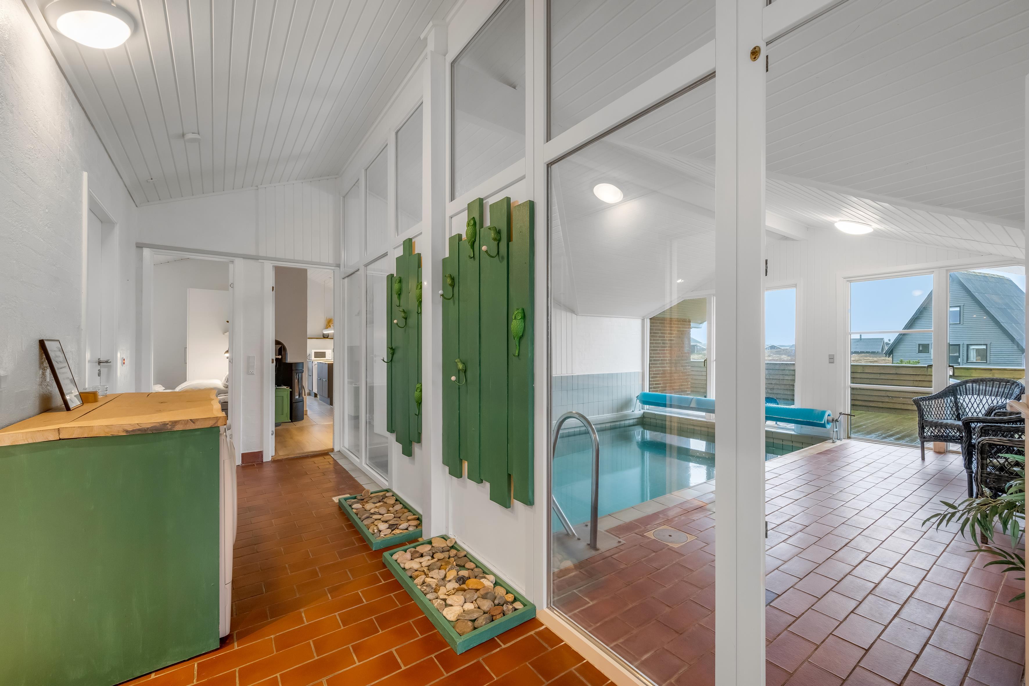 Der Poolbereich des Ferienhauses ist ein beliebter Treffpunkt für Kinder und Erwachsene. Im beheizten Pool können die Kinder planschen, während die Erwachsenen sie von den Korbmöbeln aus im Blick behalten.