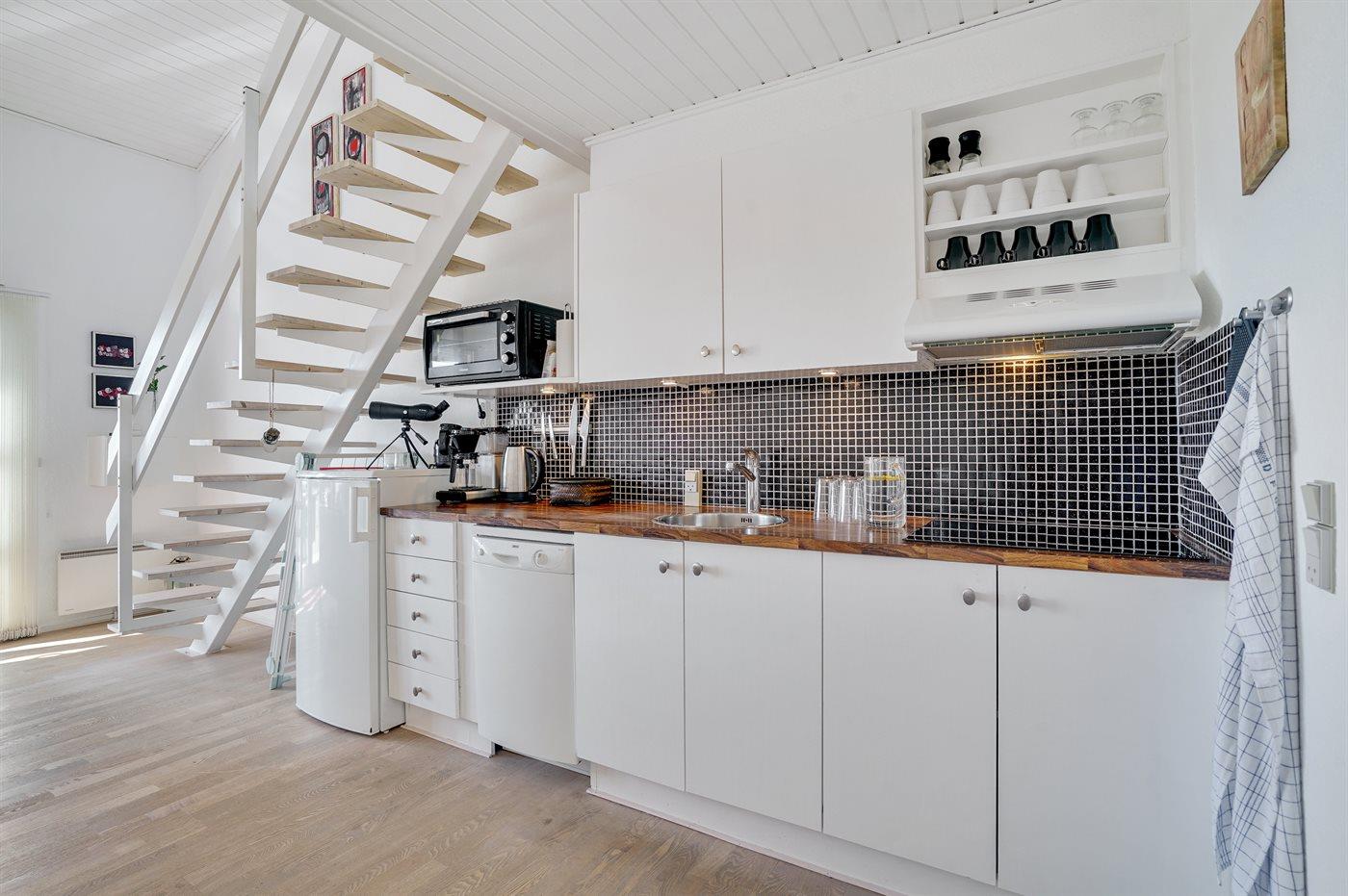 Die Küche ist mit Kühlschrank ausgestattet. Außerdem gibt es 4 Induktions-Kochzonen, Minibackofen, Airfryer sowie Geschirrspüler.