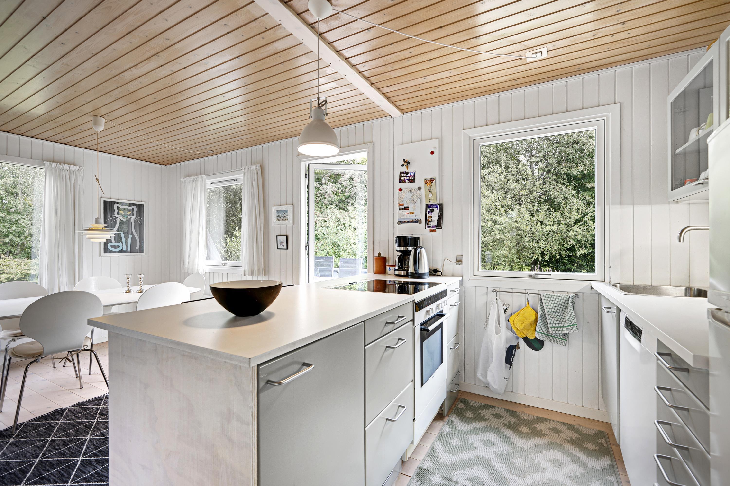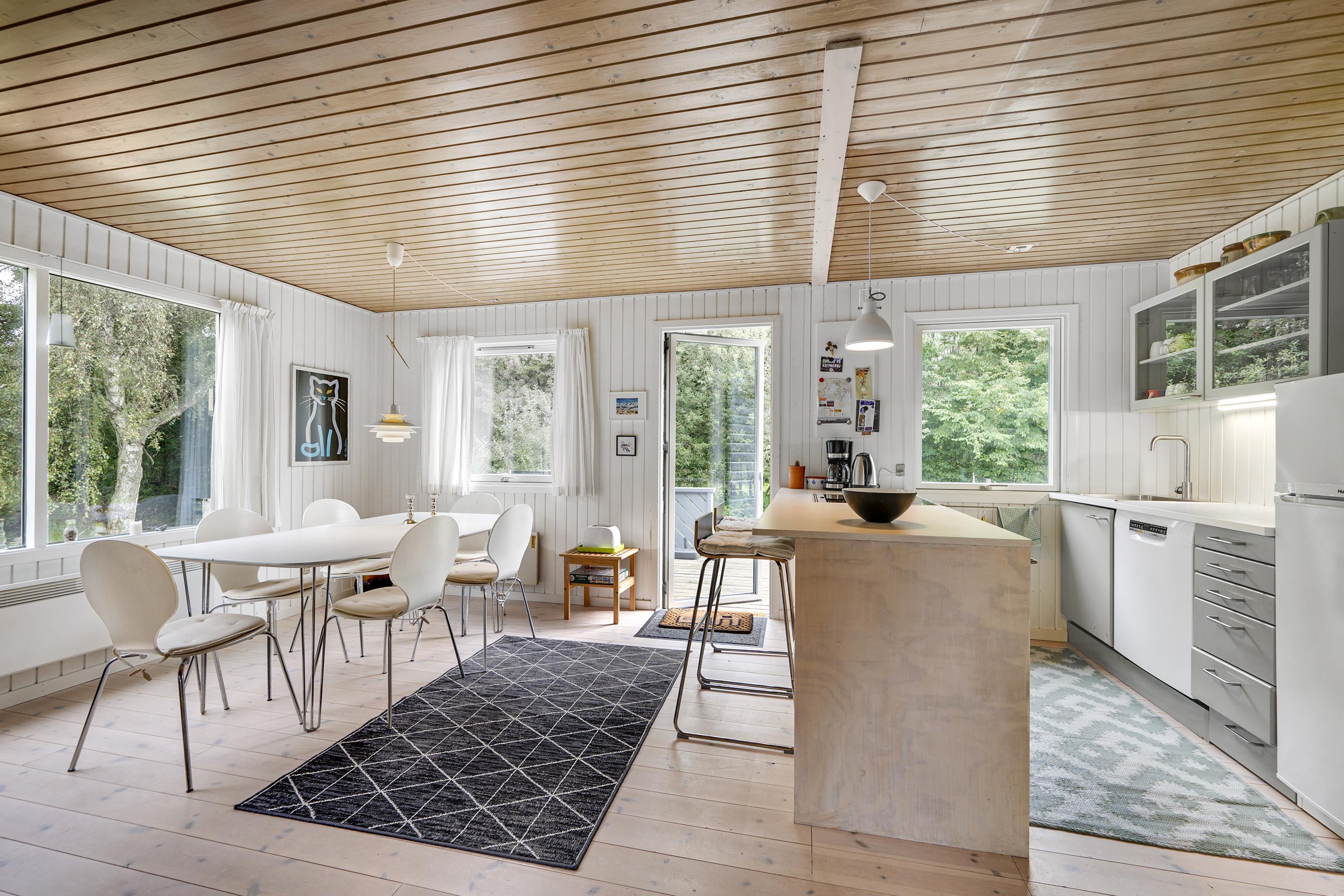 Das geräumige Wohnzimmer mit Ausgang auf die Terrasse liegt in offener Verbindung zur Küche und ist mit Kaminofen, Essplatz für sechs Personen, Sitzgarnitur und Flachbildschirm-TV mit Chromecast ausgestattet. Beachten Sie bitte, dass alle Inhalte über PC, Tablet oder Smartphone auf den Fernseher gestreamt werden müssen. Neuere Küche mit viel Arbeitsfläche, Glaskeramikherd, Kühl-/Gefrierkombination, Geschirrspüler und Mikrowelle. Die sechs Schlafplätze verteilen sich auf drei gut eingerichtete Schlafzimmer – ein großes Zimmer mit Doppelbett und zwei etwas kleinere Zimmer mit jeweils zwei Einzelbetten. Für die kleinsten Gäste ist ein Kinderbett vorhanden. Kleines, aber funktionelles Badezimmer mit Dusche. Internetzugang.
