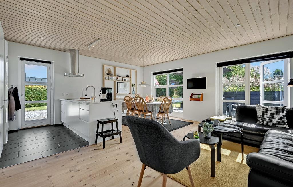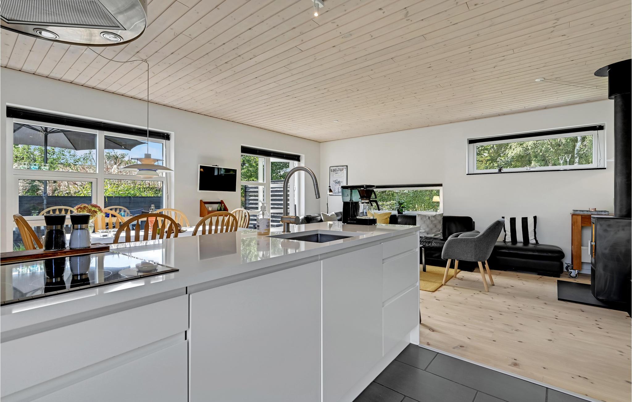 Interessantes, modernes Ferienhaus in sehr attraktiver Lage. Im Gehabstand liegen Wald und Strand. Ein System von Fußwegen bringt Sie auch schnell nach Ebeltoft. Der Strand ist schön und sandig. Sie können hier auch gut Kitesurfen. Auf dem Grundstück gibt es mehrere Terrassen und einen Rasen. Im Garten stehen auch Schaukeln zur Verfügung. Im Haus ist ein beliebter Schlafboden zum Spielen und die Aussicht genießen, es sind drei Schlafzimmer und ein gepflegtes Badezimmer vorhanden, hinzu kommt noch eine gut ausgestattete Küche.