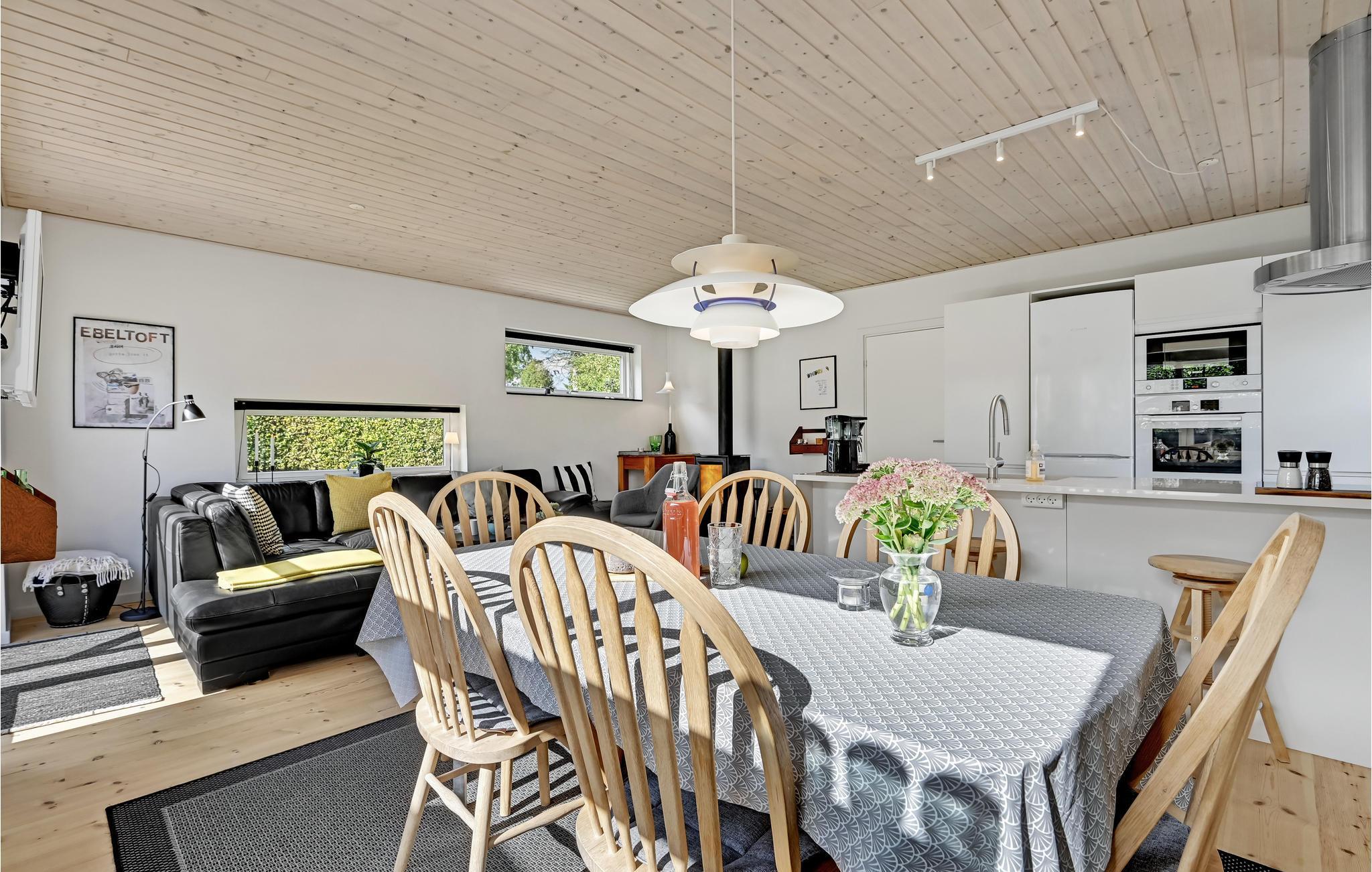 Interessantes, modernes Ferienhaus in sehr attraktiver Lage. Im Gehabstand liegen Wald und Strand. Ein System von Fußwegen bringt Sie auch schnell nach Ebeltoft. Der Strand ist schön und sandig. Sie können hier auch gut Kitesurfen. Auf dem Grundstück gibt es mehrere Terrassen und einen Rasen. Im Garten stehen auch Schaukeln zur Verfügung. Im Haus ist ein beliebter Schlafboden zum Spielen und die Aussicht genießen, es sind drei Schlafzimmer und ein gepflegtes Badezimmer vorhanden, hinzu kommt noch eine gut ausgestattete Küche.