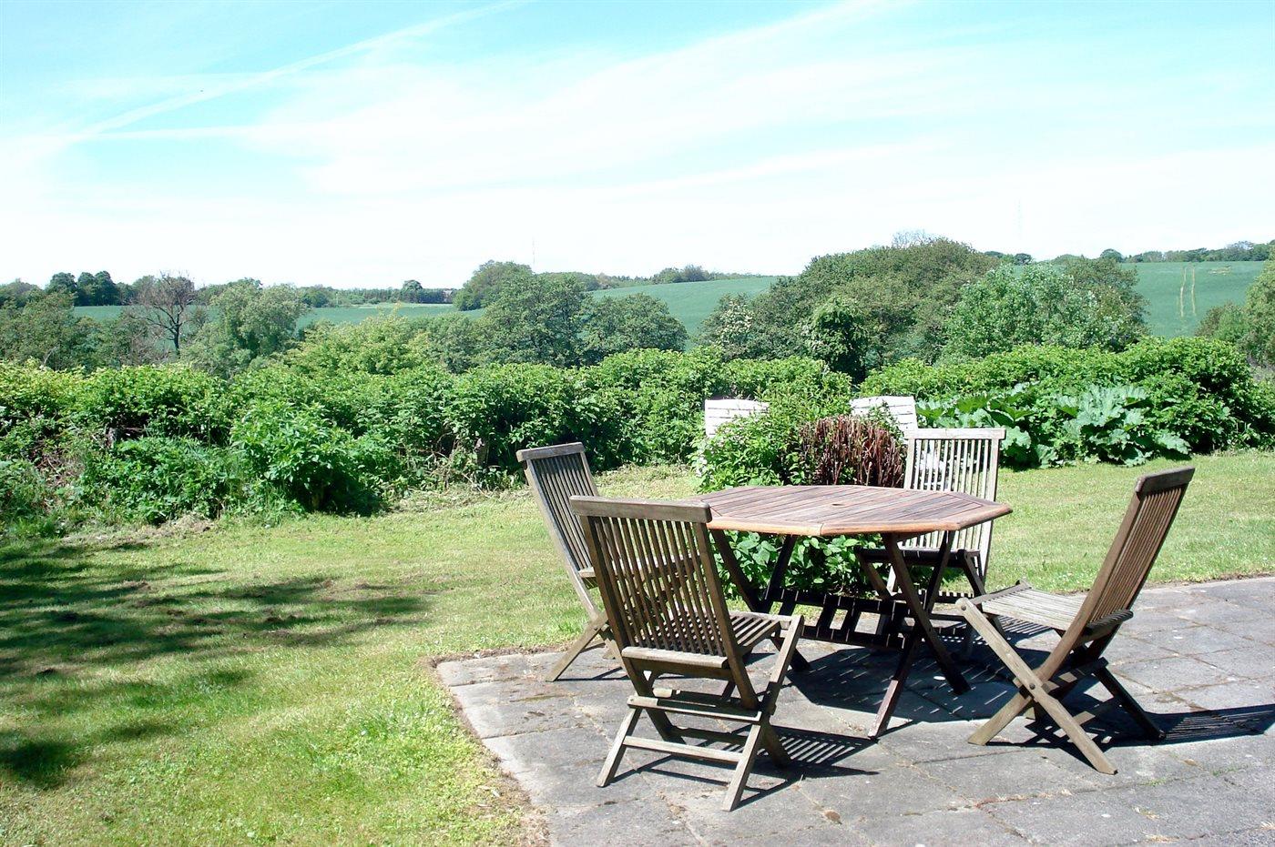Gemütliches Ferienhaus auf dem Land mit Blick auf Felder, nahe Sandstrand und umgeben von Wald- und Feldgebieten in Allinge, Dänemark.