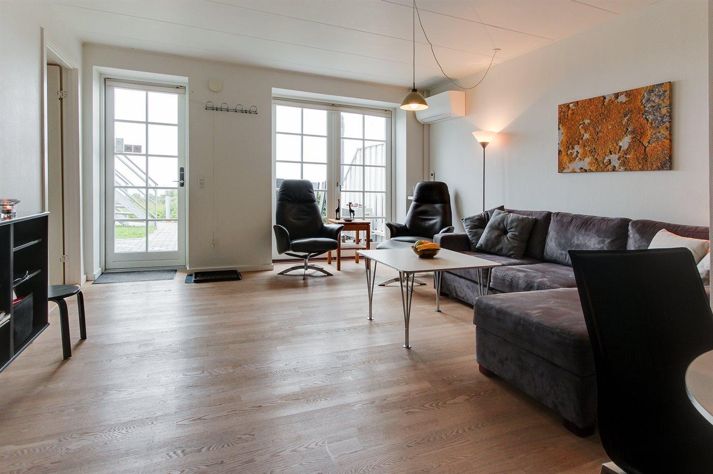 Helle Ferienwohnung mit Meerblick, Terrasse, Pool und moderner Ausstattung in Sandkås, Dänemark.