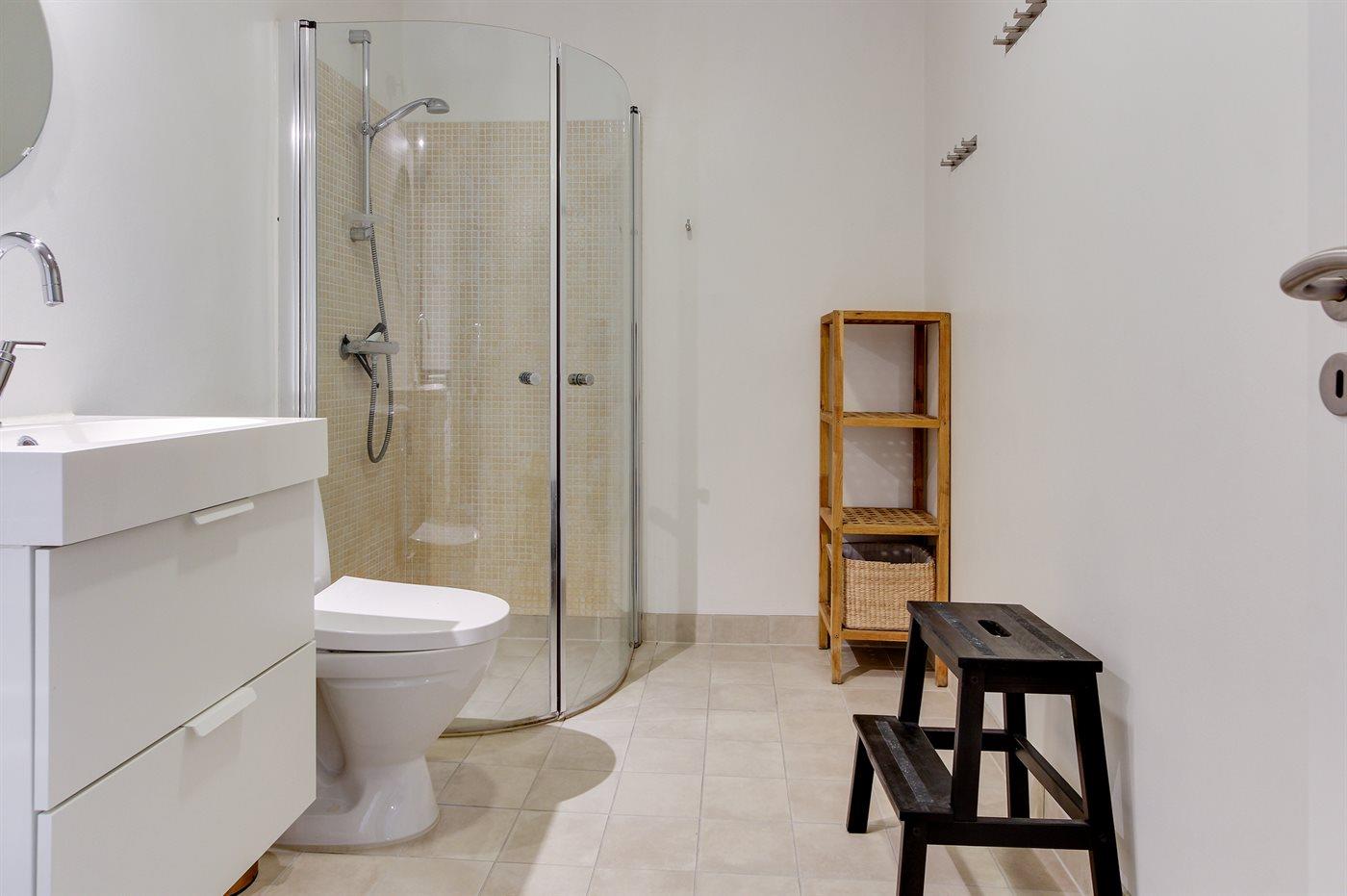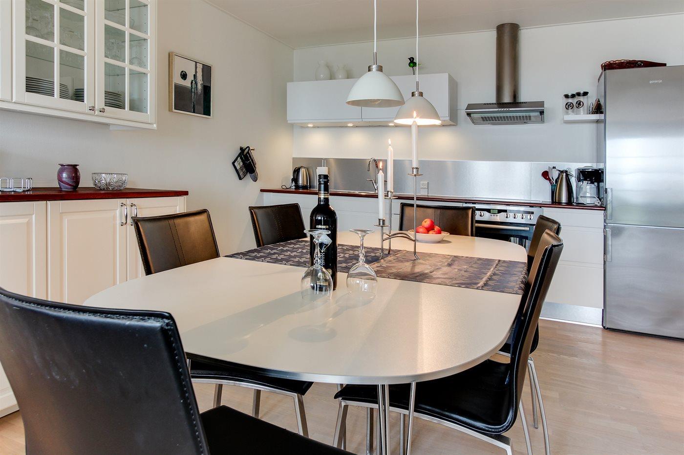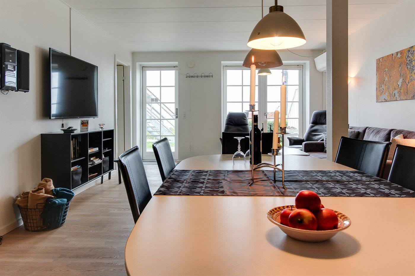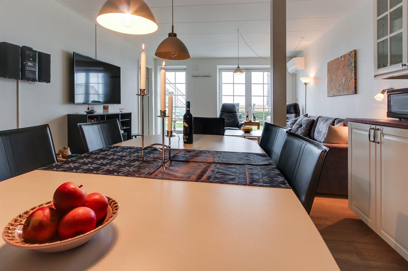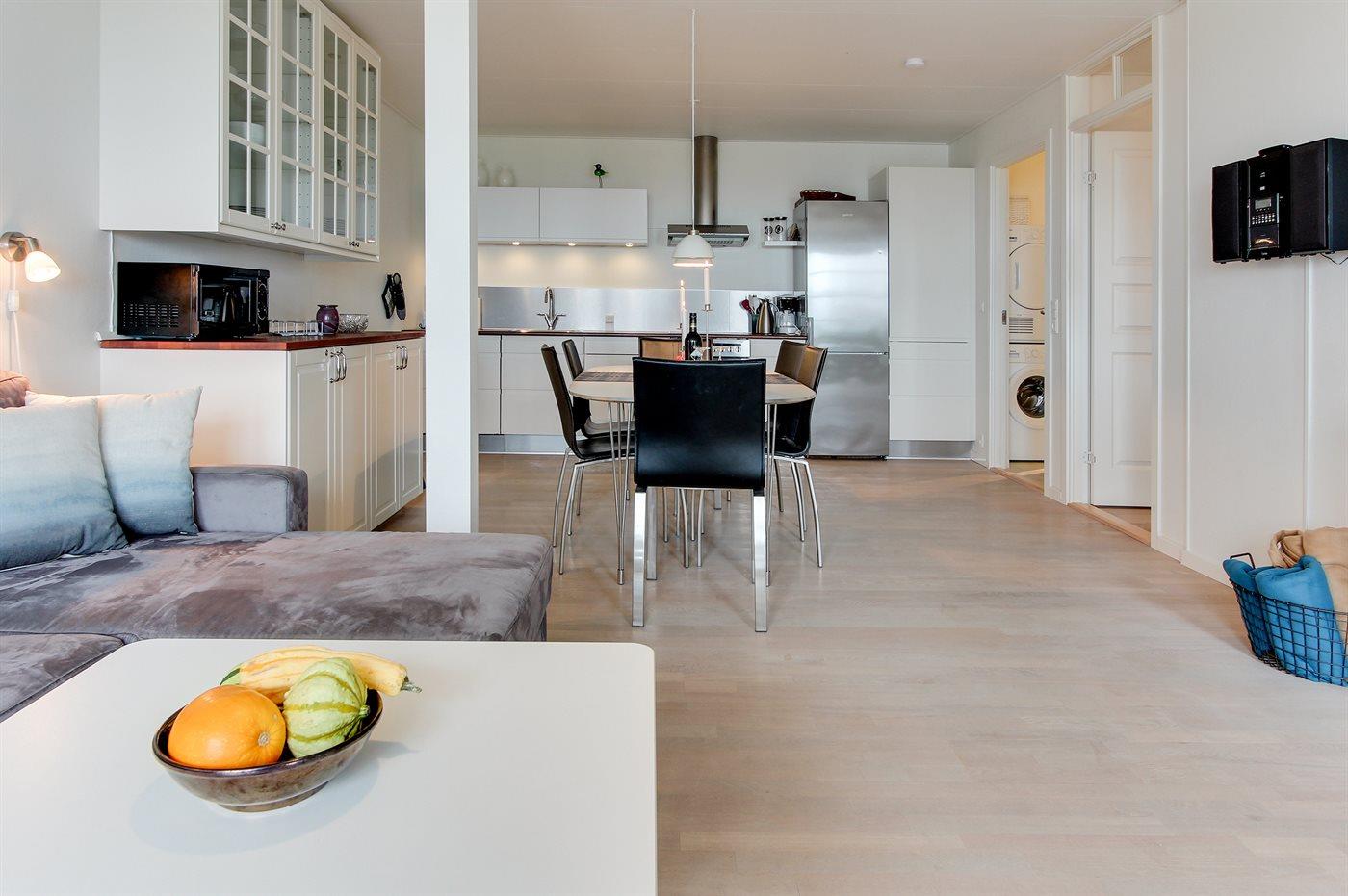 Diese geräumige, helle und nett möblierte Ferienwohnung, 2006 renoviert, liegt in der ehemaligen Pension Boesvang in Sandkås. Zur Wohnung gehört eine teilweise abgeschirmte Fliesenterrasse mit Gartenmöbeln, Gasgrill und Kohlegrill. Von der Terrasse können Sie die Aussicht auf das Meer, das sich je nach Wetterlage verändert, genießen. Rollstuhlgerechter Zugang (Fliesen) zum Haus. Innen gibt es weißgestrichene Wände und Decken sowie helle Holzböden. Die moderne Küche ist mit dem Wohnzimmer, das u. a. mit Geschirrspüler, Tiefkühlgerät, Mikrowelle, Umluftofen, Mikrowelle und Herd mit Ceran-Feld ausgestattet ist, kombiniert. Im Wohnzimmer, mit großes Fensterfront zum Meer hinaus, finden Sie Stereoanlage mit CD-Spieler und Smart-TV . Die Schlafplätze der Wohnung verteilen sich auf 2 Zimmer mit Doppelbett sowie 2 Schlafplätze auf einer Doppelschlafcouch im Wohnzimmer. Schönes Badezimmer mit Fußbodenheizung, Duschnische und Waschsäule. Die Wohnung liegt auf einem Gemeinschaftsgelände mit beheiztem Außenswimmingpool (10,0 x 9,0 x 2,0 m), der im Zeitraum 15.06.-15.09. geöffnet ist. Sandkås ist ein beliebter Ferienort - dicht an guten Aktivitätsmöglichkeiten und Sehenswürdigkeiten wie z.B. 2 x 18-Loch Golfplatz, die Burgruine Hammershus, die faszinierende bronzezeitlichen Felszeichnungen bei Madsebakke und den See "Opalsøen".