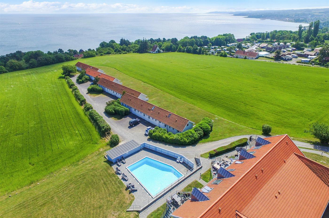 Helle Ferienwohnung mit Meerblick, Balkon und beheiztem Pool in Sandkås, Dänemark.