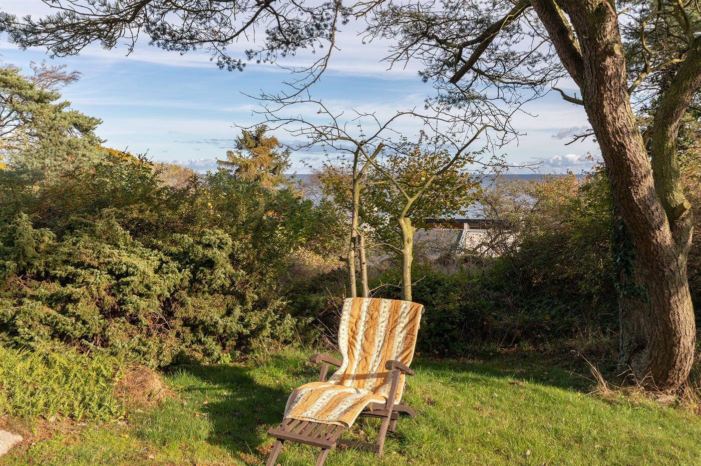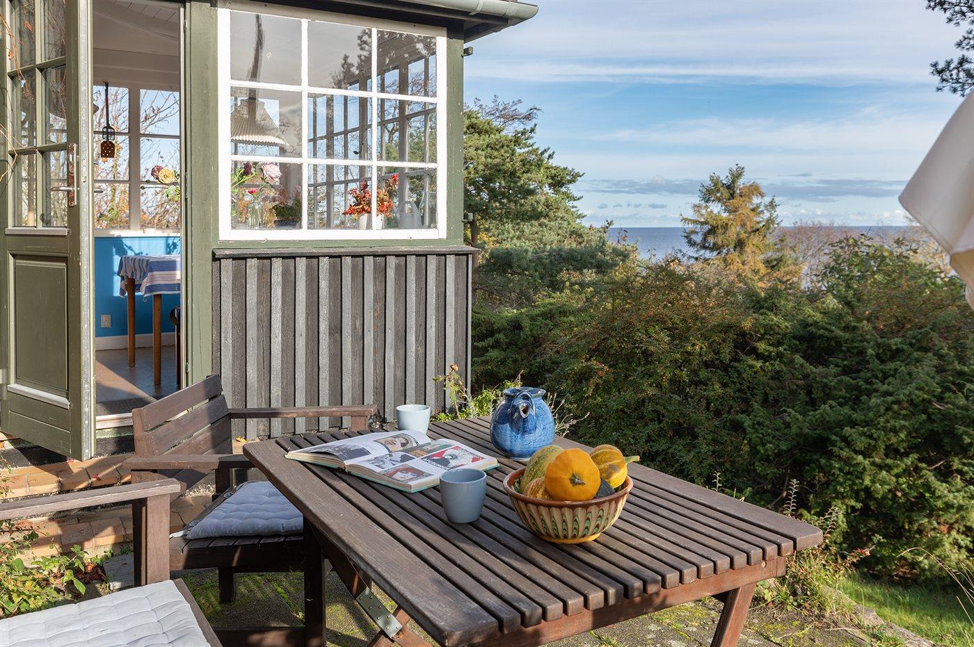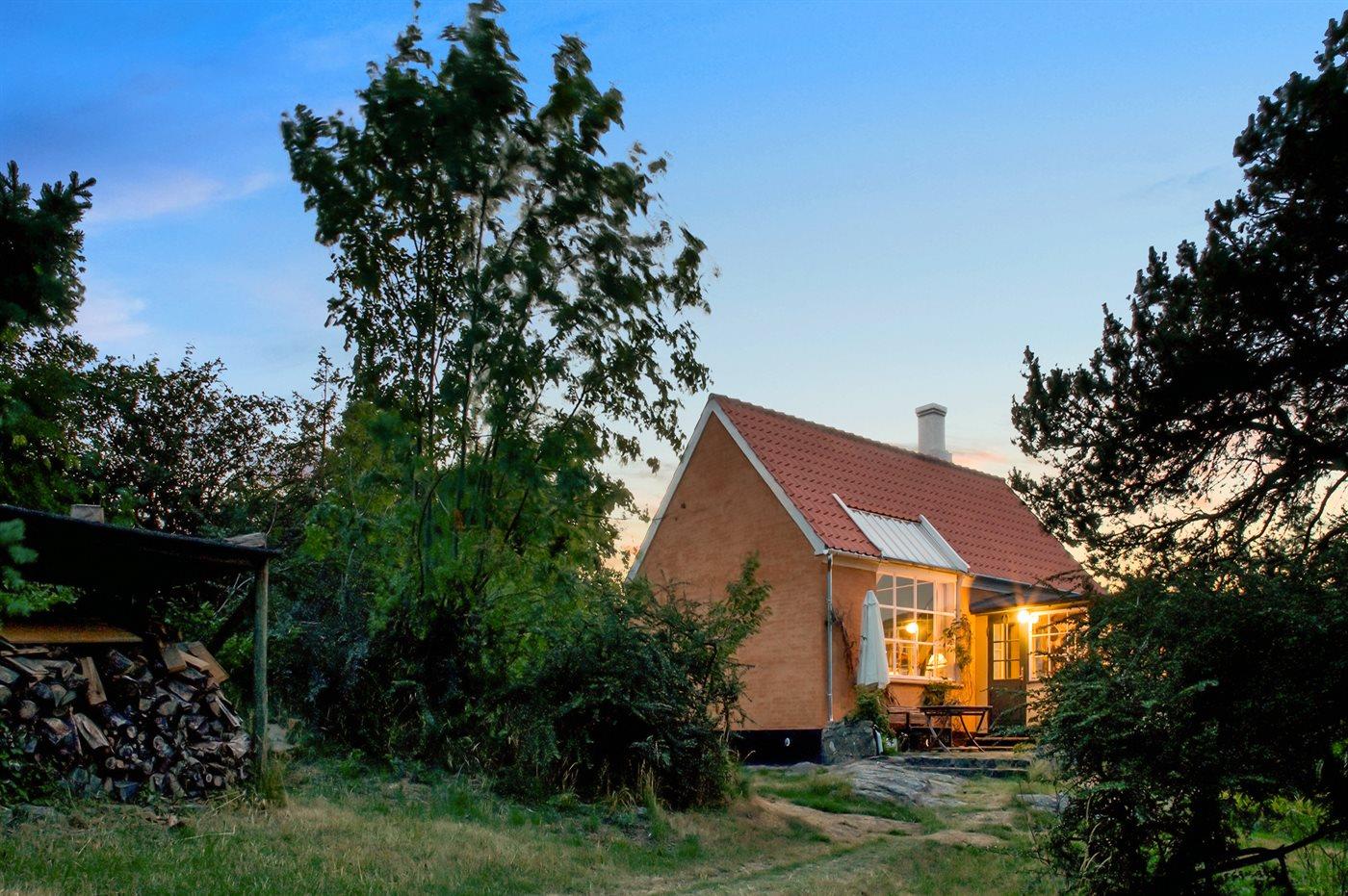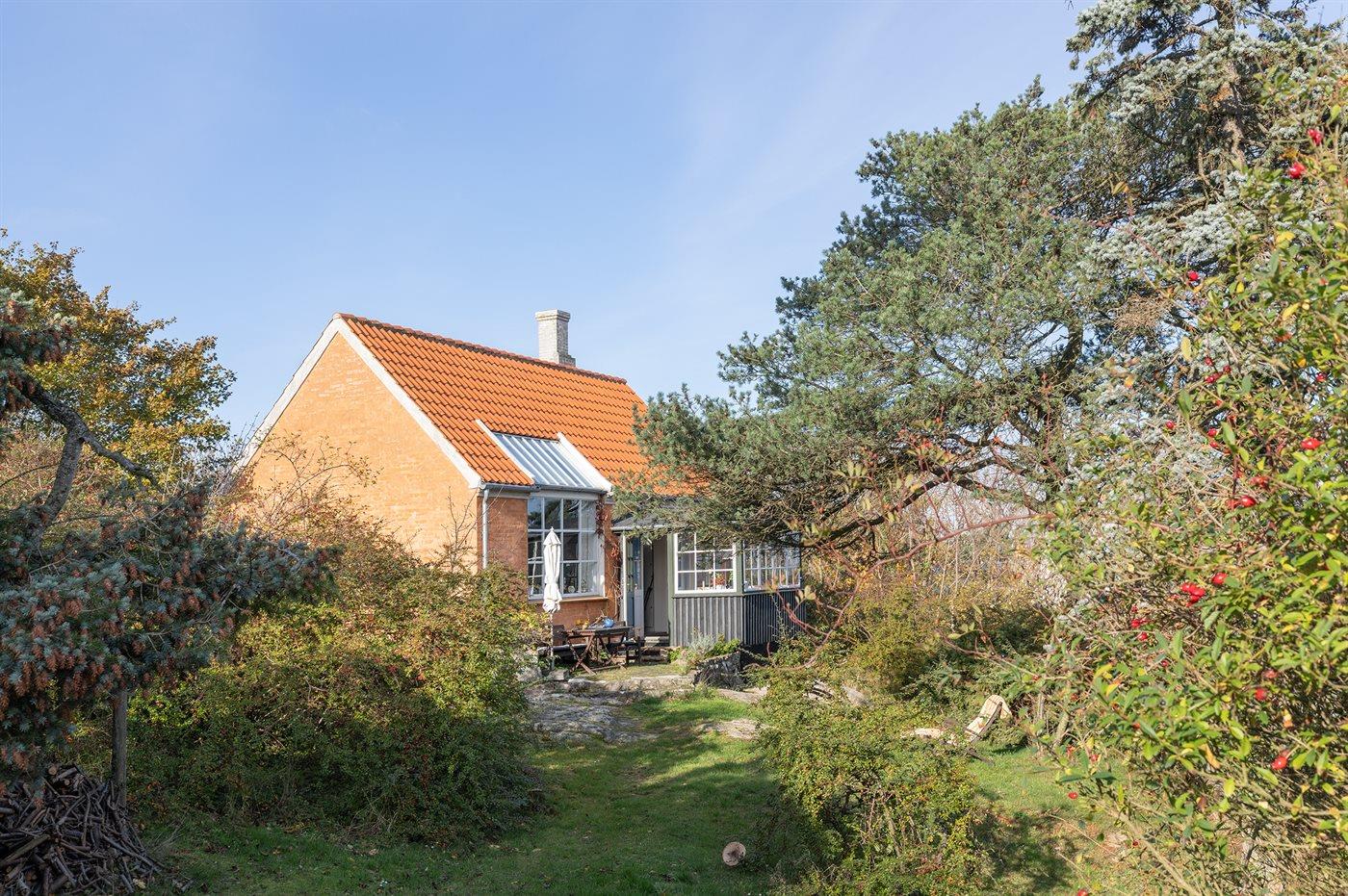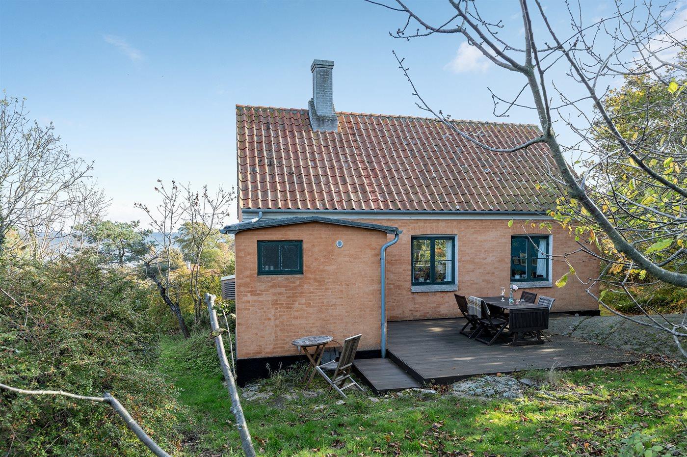 Erhöht gelegenes, älteres Ferienhaus auf einem fantastischen Naturgrundstück mit Felsvorsprung und natürlichen windgeschützten Ecken. Zum Haus gehört zudem eine erhöhte Holzterrasse, die in den Felsvorsprung eingearbeitet wurde. Ursprünglich wurde das Haus für einen Kunstmaler erbaut, dem der Allinges Geschäfte und Restaurants sind leicht zu erreichen. wunderschöne, kräftige Lichteinfall im großen Wohnzimmer zu verdanken ist. Badestrand, Räucherei sowie