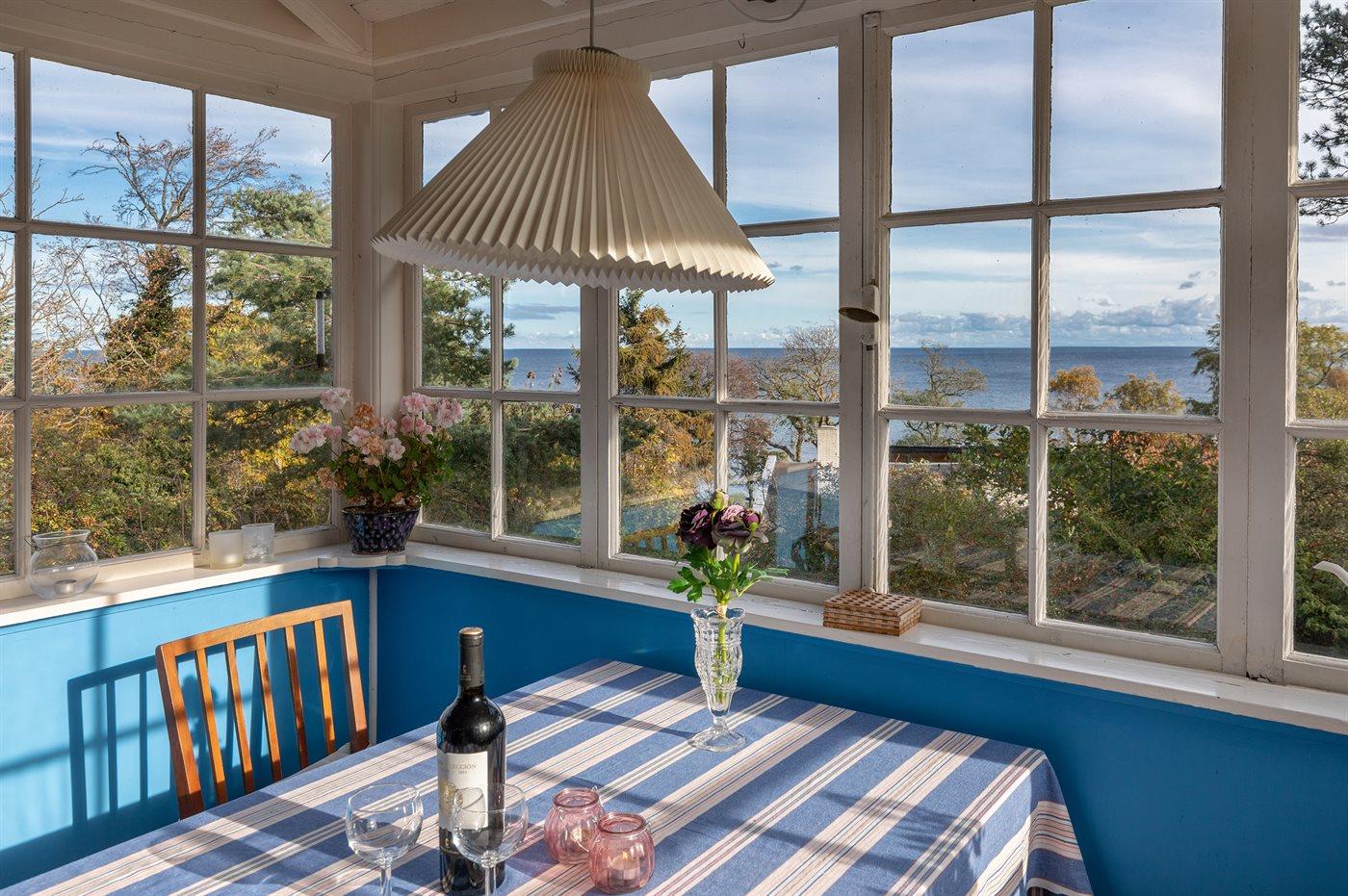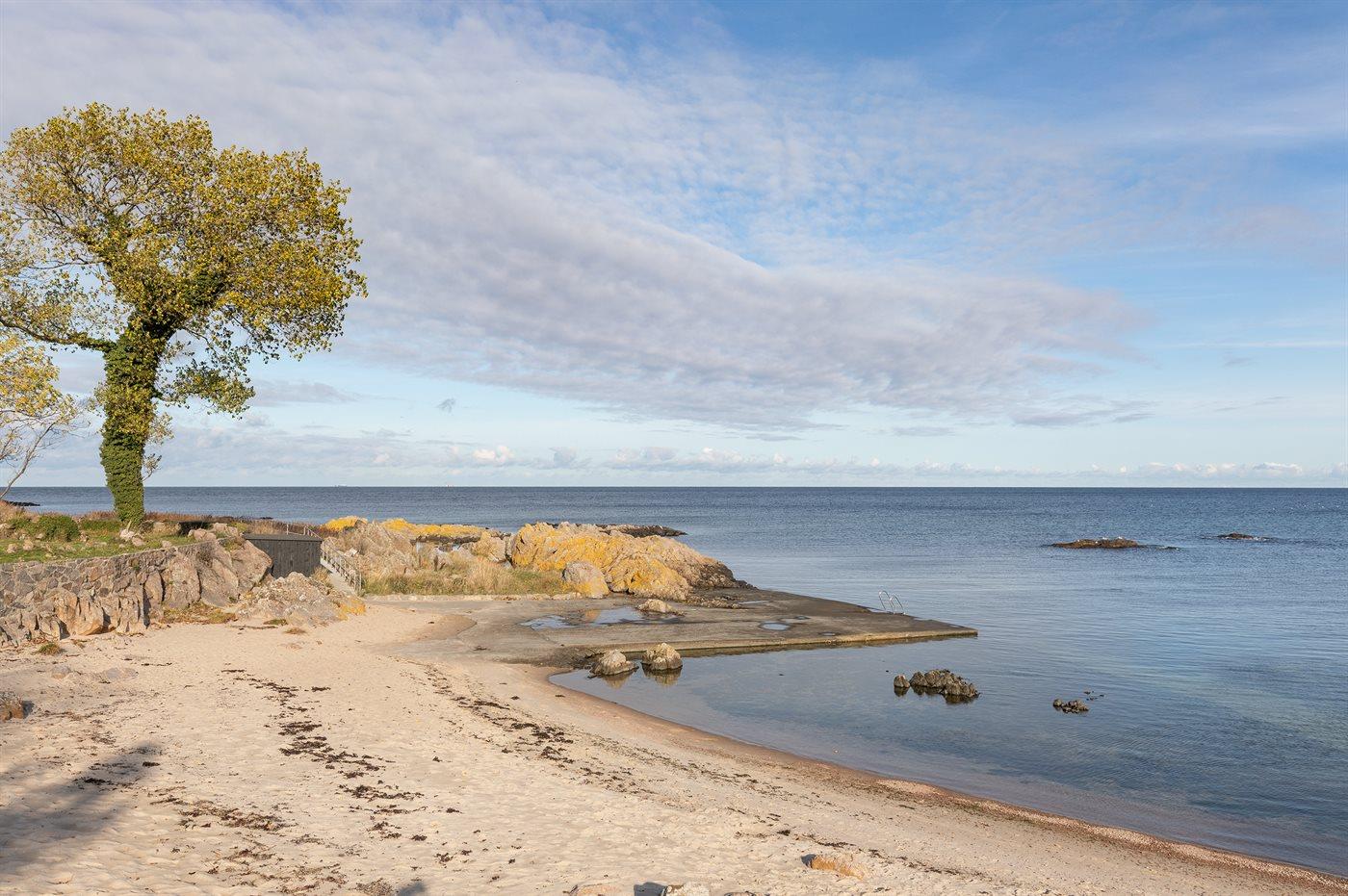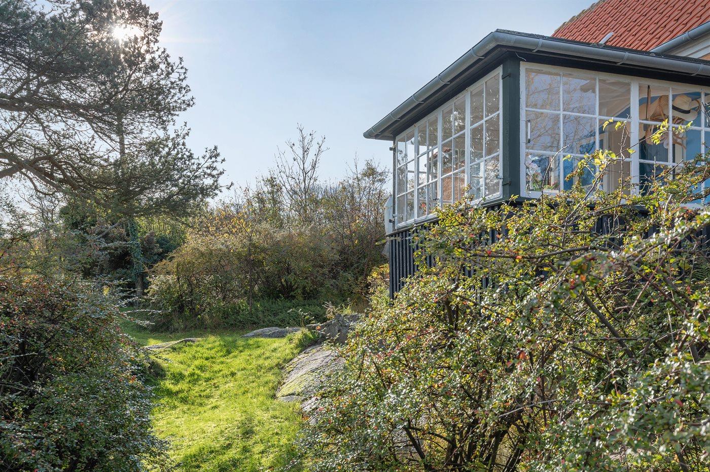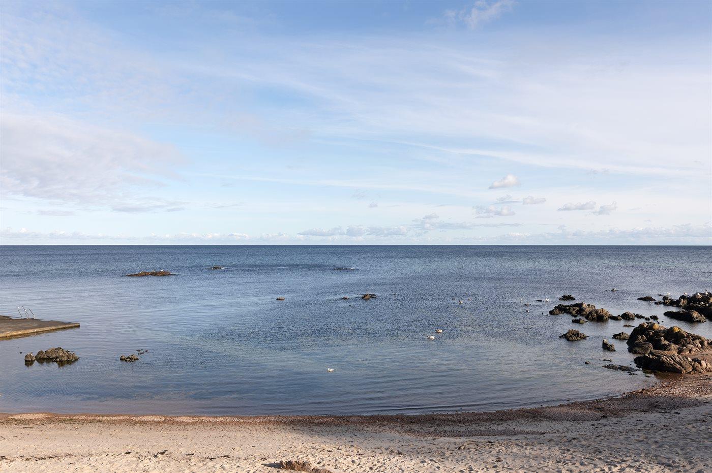 Erhöht gelegenes, älteres Ferienhaus auf einem fantastischen Naturgrundstück mit Felsvorsprung und natürlichen windgeschützten Ecken. Zum Haus gehört zudem eine erhöhte Holzterrasse, die in den Felsvorsprung eingearbeitet wurde. Ursprünglich wurde das Haus für einen Kunstmaler erbaut, dem der Allinges Geschäfte und Restaurants sind leicht zu erreichen. wunderschöne, kräftige Lichteinfall im großen Wohnzimmer zu verdanken ist. Badestrand, Räucherei sowie