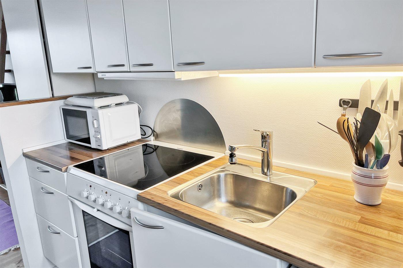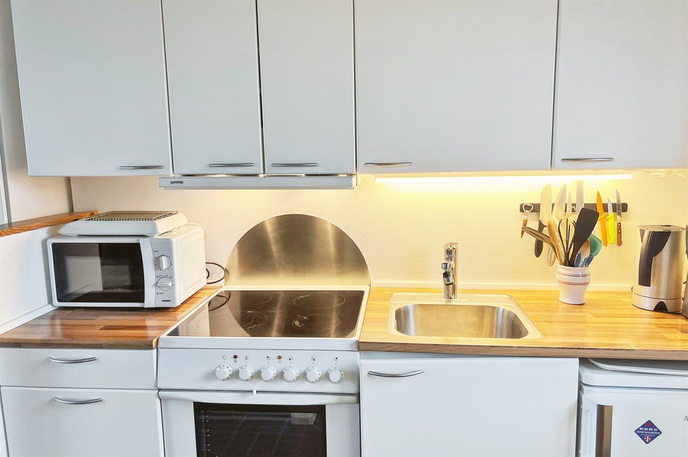 Die Küche ist mit Kühlschrank ausgestattet. Außerdem gibt es 4 Keramik-Kochfelder, Umluftofen, Mikrowelle. Fußbodenheizung in der Küche.