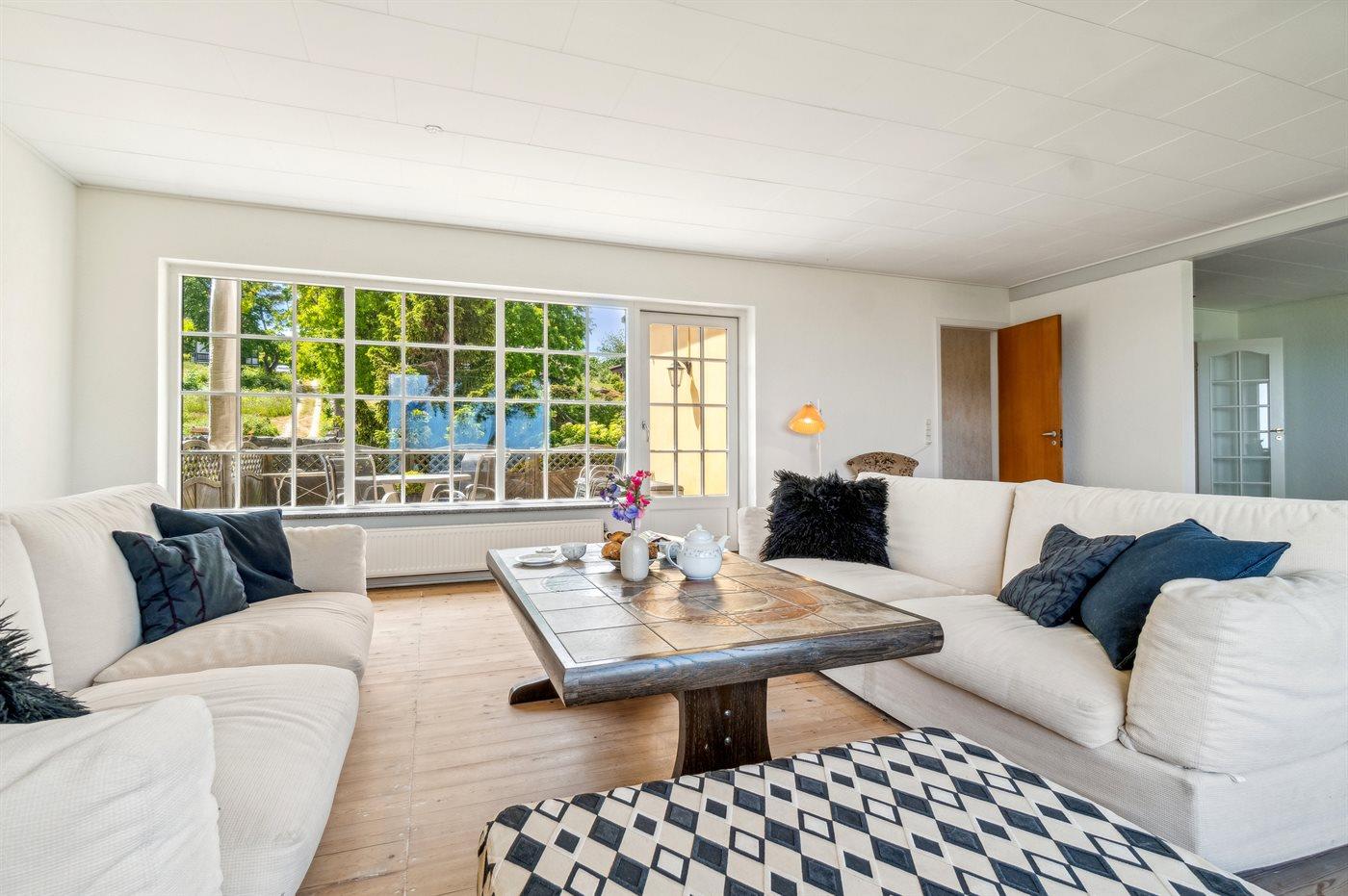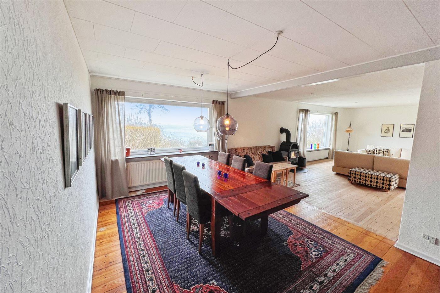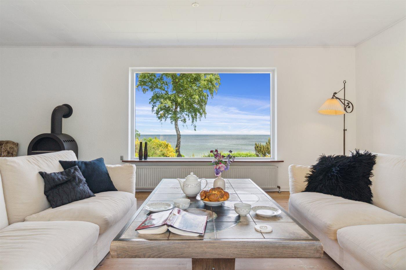Das Haus ist auf zwei Etagen und die Bauweise ist ganz besonders, sodass man sofort das Gefühl eines exklusiv gelegenen Ferienhauses bekommt. Vom Panoramafenster im Wohnzimmer hast du die schönste Aussicht über das Grundstück und auf das Meer, sodass es schwerfällt, sich beim gemütlichen Kaminfeuer nur auf das Lesen eines guten Buches zu konzentrieren, weil die Aussicht so fesselnd ist. Im großen Schlafzimmer im ersten Stock können die Türen zum französischen Balkon geöffnet werden, sodass du auch dort den vollen Genuss der Aussicht hast.