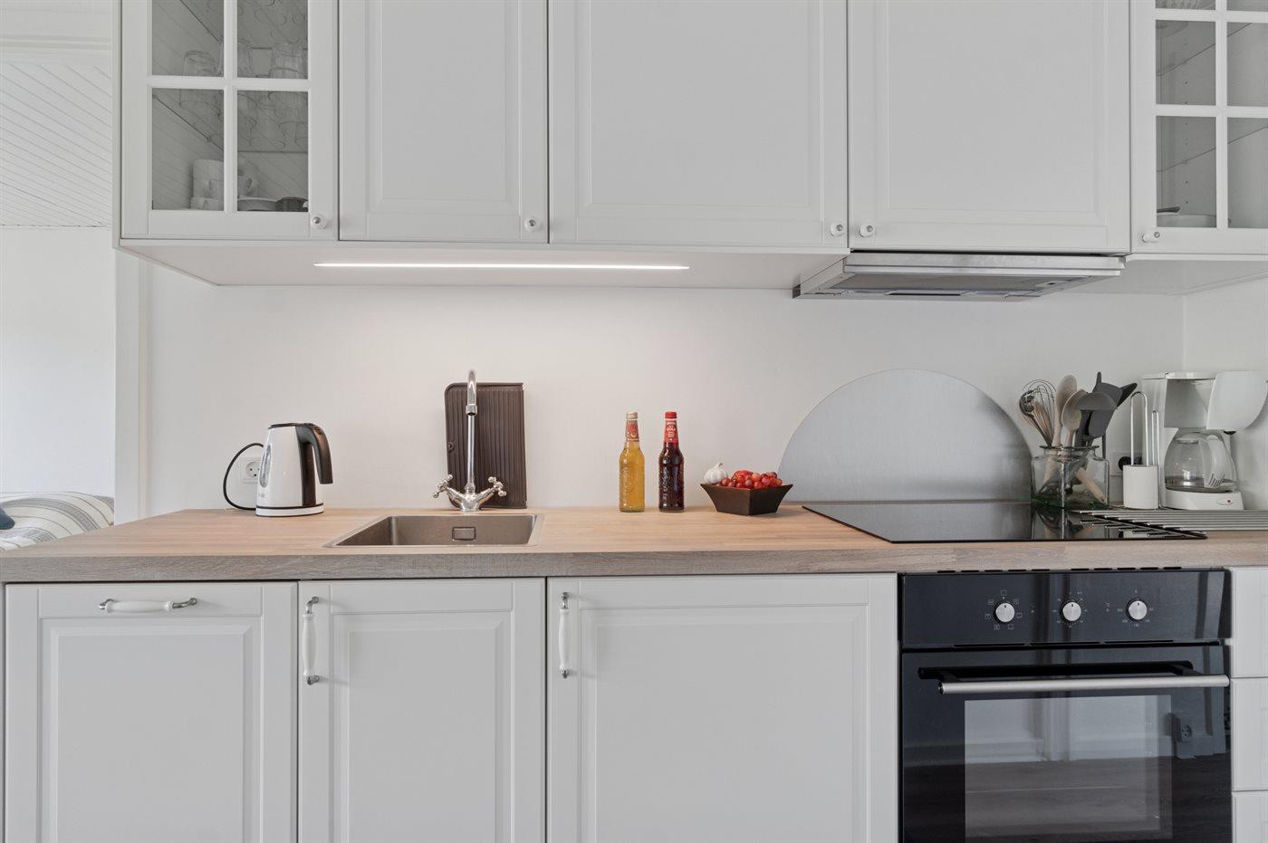 Die Küche ist mit Kühlschrank ausgestattet. Außerdem gibt es 4 Induktions-Kochzonen, Umluftofen sowie Geschirrspüler.
