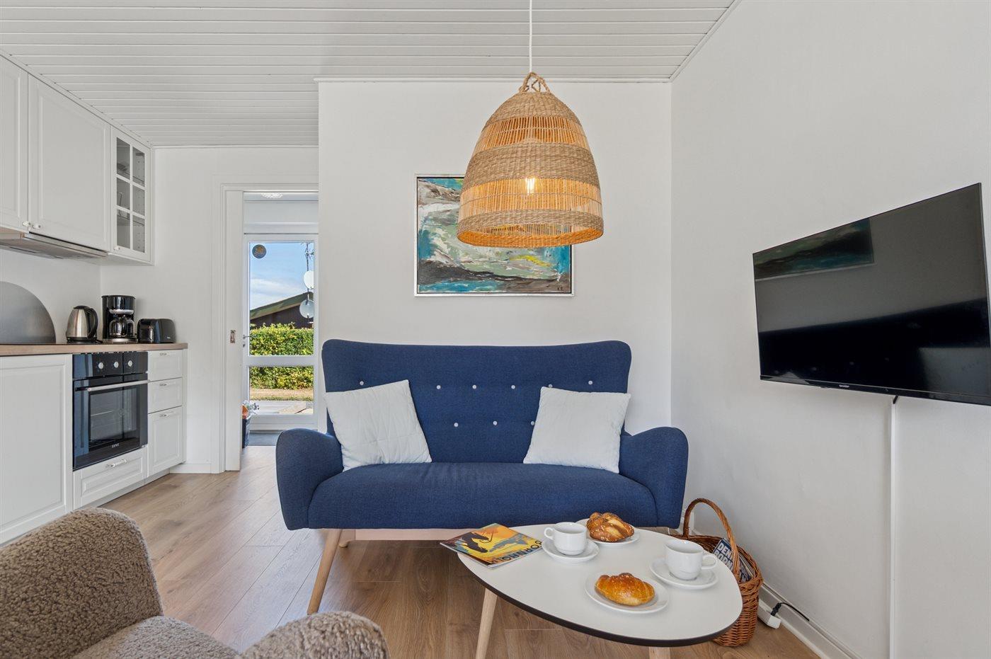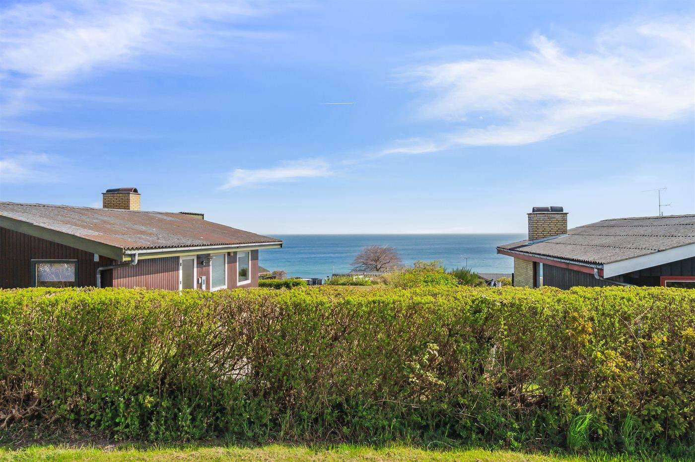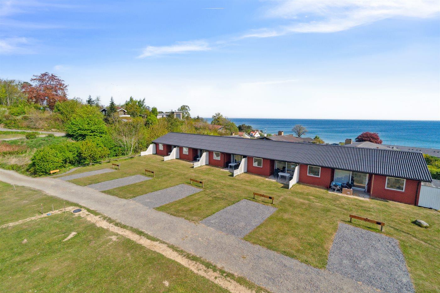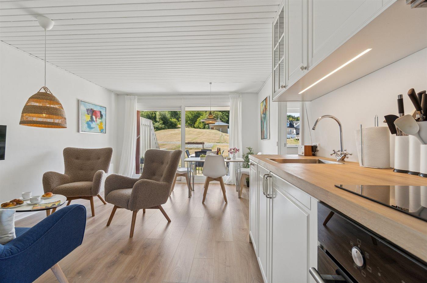 Ein komplett renoviertes und einladendes Reihenhaus mit schönem Meerblick – sowohl vom Inneren der Unterkunft als auch von der nach Osten ausgerichteten Terrasse. Auf der zweiten Terrasse, die zur Mittagszeit in der Sonne liegt, genießt du einen herrlichen Blick auf das hügelige Gelände, das so typisch für Sandkås ist – eines der beliebtesten Ferienhausgebiete Bornholms.