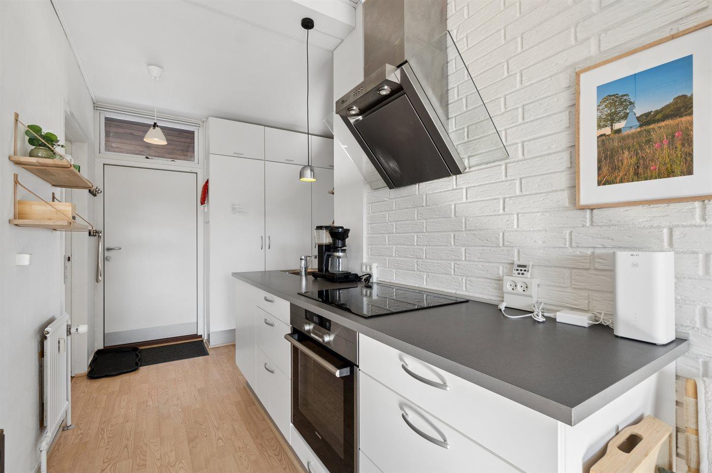 Die Küche ist mit Kühlschrank ausgestattet. Außerdem gibt es 4 Keramik-Kochfelder, Umluftofen.