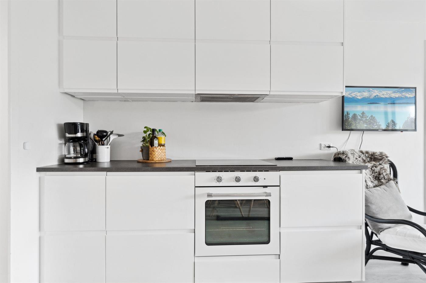 Die Küche ist mit Kühlschrank ausgestattet. Außerdem gibt es 4 Induktions-Kochzonen, Umluftofen, Mikrowelle sowie Geschirrspüler.