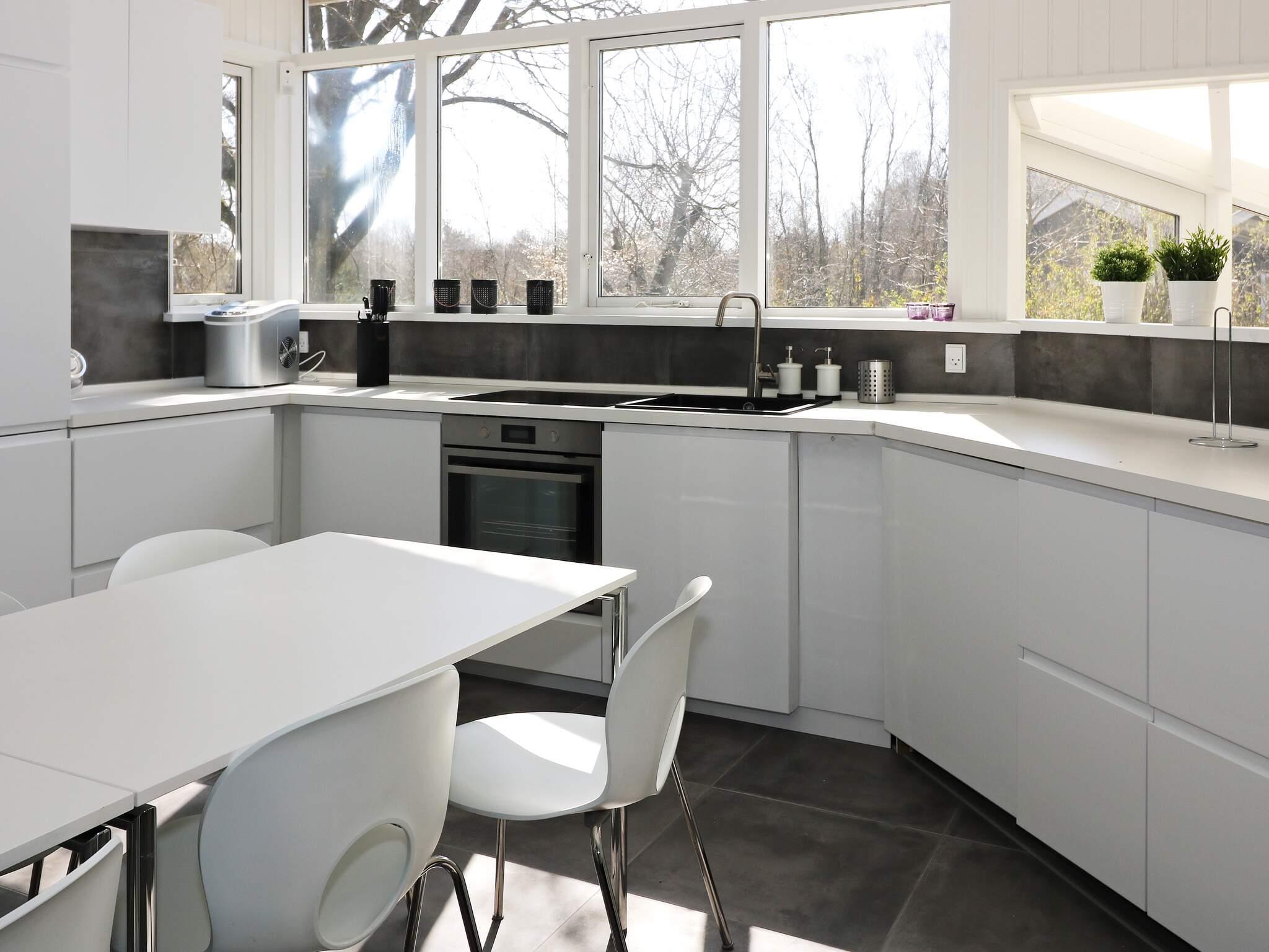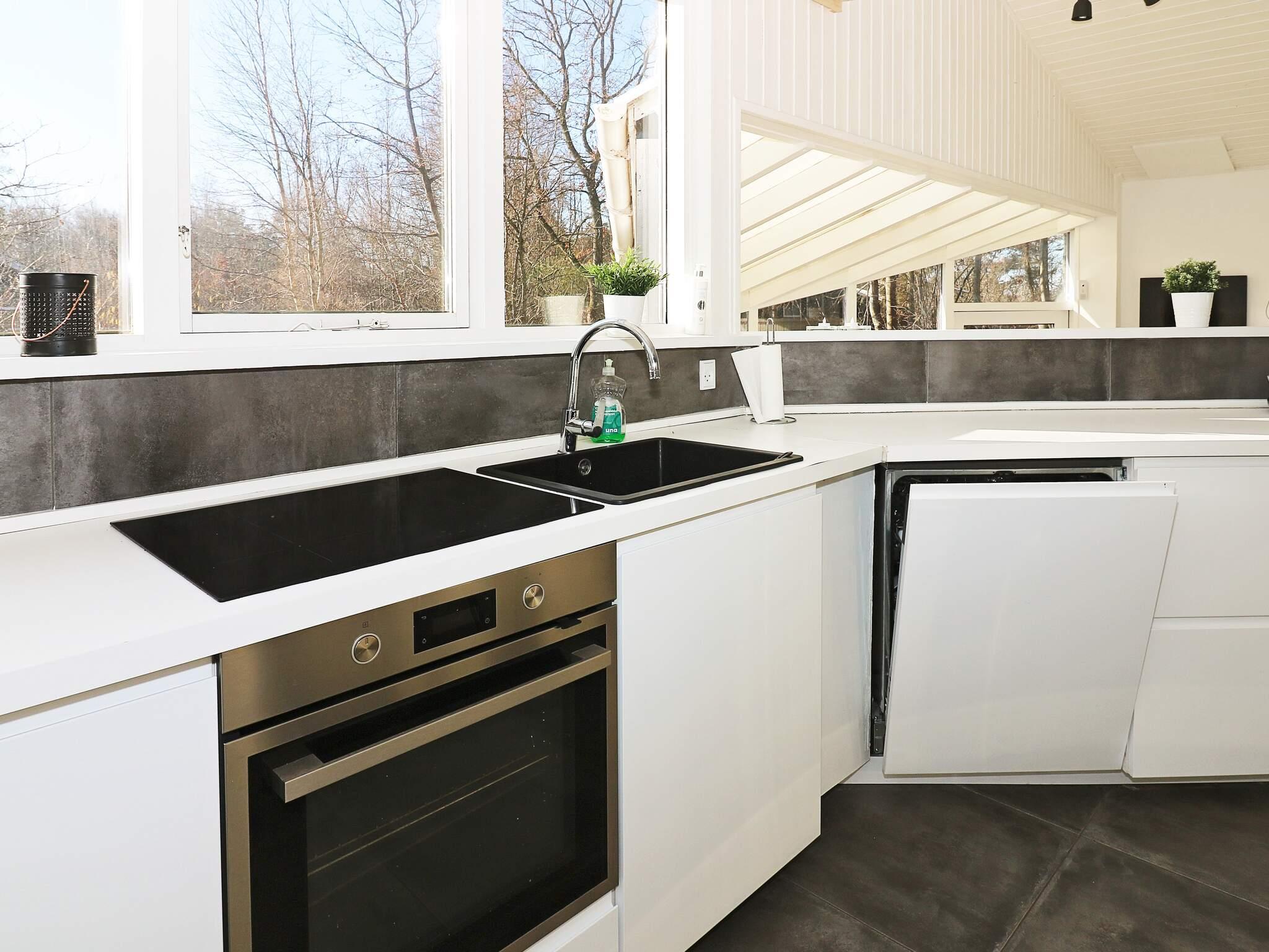 Das geräumige Ferienhaus ist architektonisch individuell gestaltet und bietet zwei Wohnebenen, die über einige Treppenstufen miteinander verbunden sind. Der große, helle Küchen-/Essbereich ist offen mit dem Wohnzimmer verbunden. TV ohne Senderempfang, dafür mit Chromecast zum Streamen eigener Anbieter. An kühleren Abenden können Sie es sich auch vor dem mit Bio-Ethanol beheizten Kamin gemütlich machen. Zudem bietet der Raum Zugang zur Terrasse.