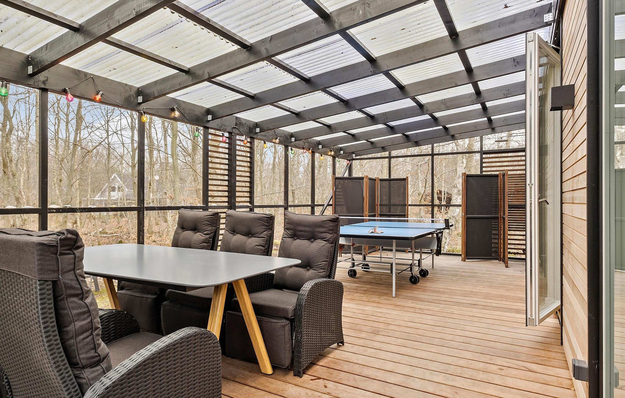 Modernes Ferienhaus mit Wintergarten, Holzbad und Garten für entspannte Familienzeit.