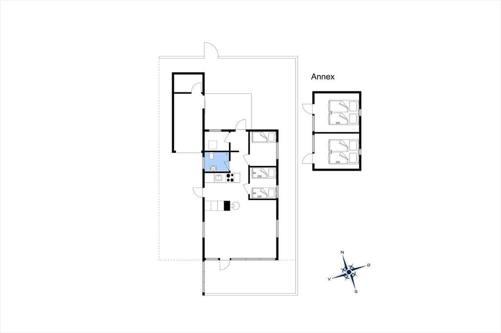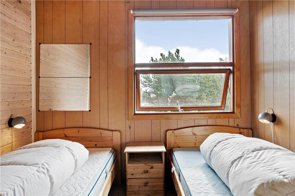 Im Haupthaus befindet sich ein Schlafzimmer mit zwei Einzelbetten, ein Schlafzimmer mit Etagenbett und ein helles Badezimmer. Von den Doppelbetten der zwei Schlafzimmern des Nebengebäudes haben Sie schönste Aussicht über Felder und den Damm nach Alrø.