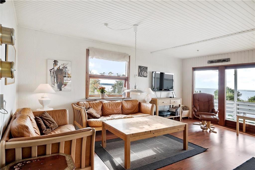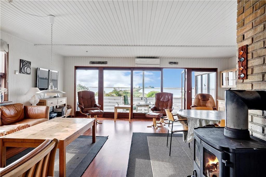 Vom gemütlichen Wohnzimmer haben Sie Zugang zur Terrasse und einen grandiosen Blick aufs Meer. Der Wohnbereich ist ausgestattet mit Kaminofen, bequemer Sitzecke und Esstisch und verbunden mit der offene Küche, durch die Sie direkten Zugang haben zur Terrasse auf der Westseite des Hauses.