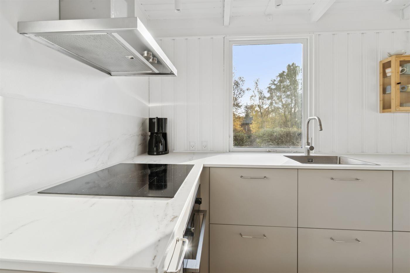 Die Küche ist mit Kühlschrank ausgestattet. Außerdem gibt es 4 Induktions-Kochzonen, Umluftofen sowie Geschirrspüler.