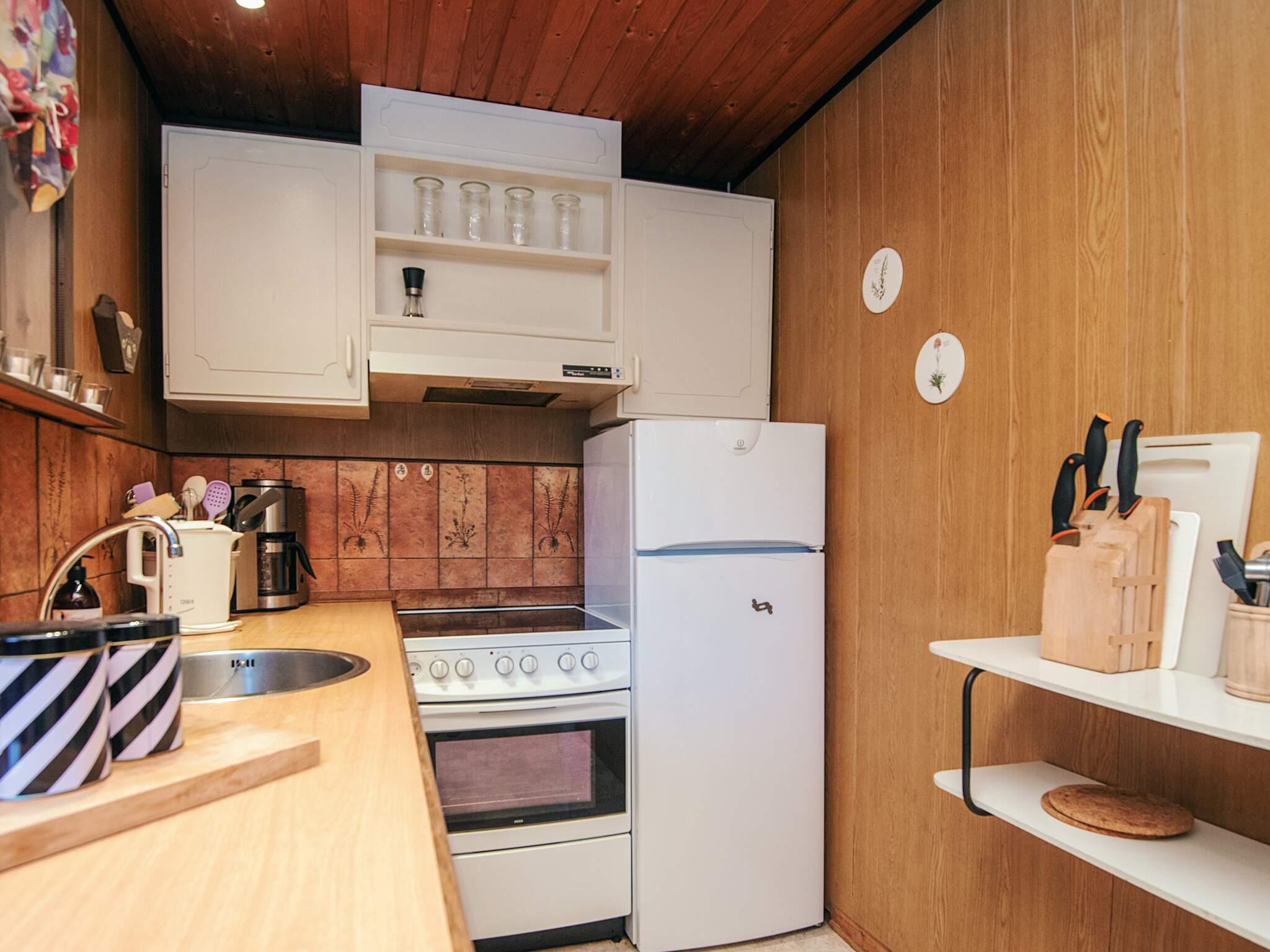 Im Haus offener Küchen-/Essbereich mit Holzofen. Die Einrichtung ist wohnlich und familienfreundlich gestaltet. Draußen auf der überdachten Terrasse können Sie grillen, während die Kinder nebenan auf der großen Rasenfläche Ball spielen.