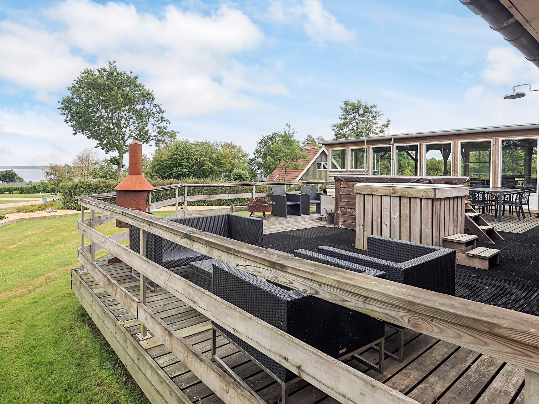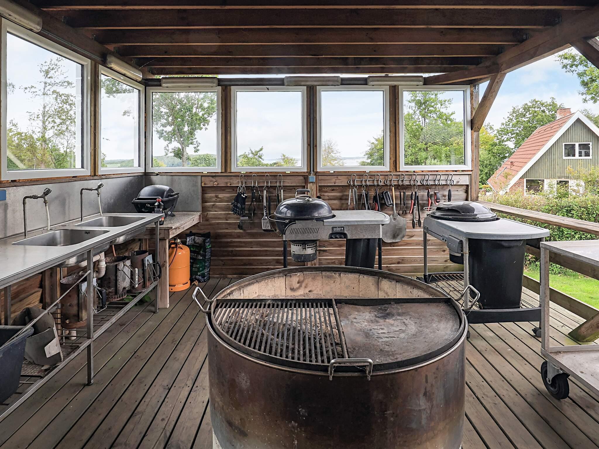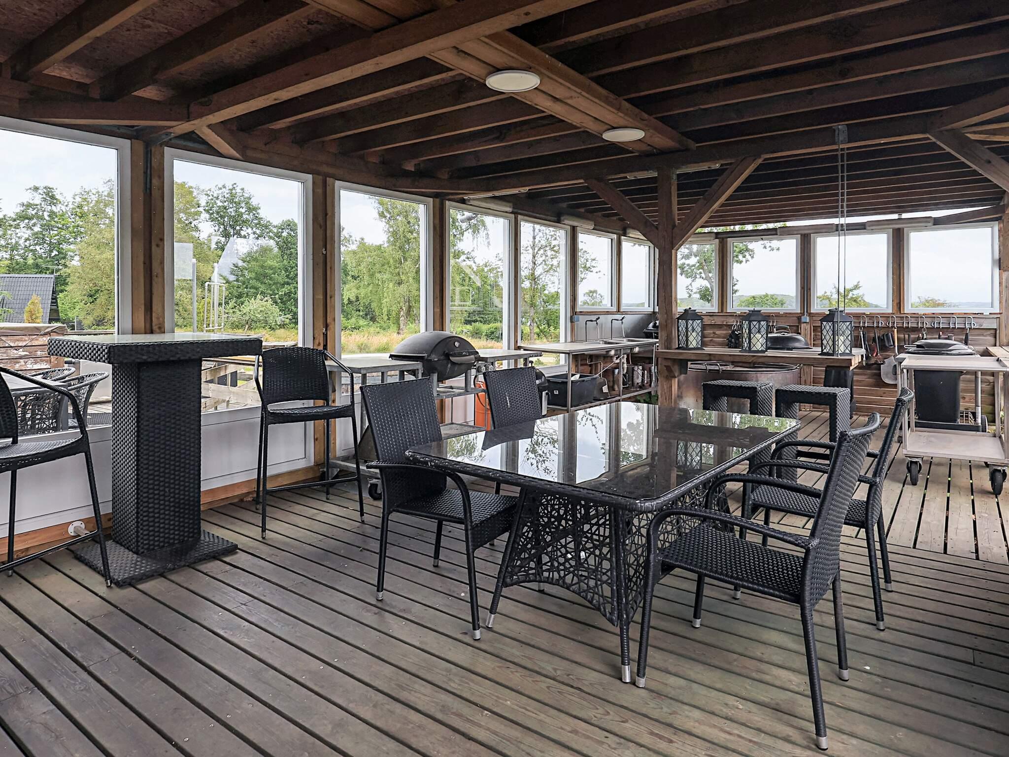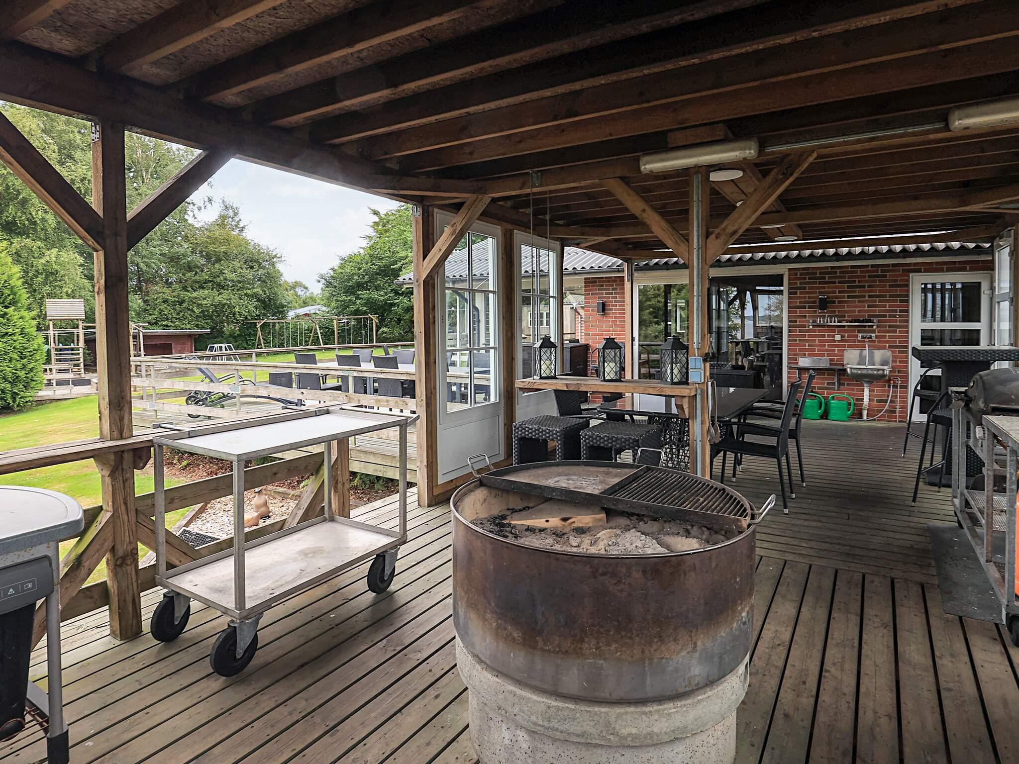 eine 235 m² große Terrasse, wovon 50 m² überdacht sind und bietet Ihnen Aussicht auf den Fjord. Für die größeren Kinder ist ein isolierter Shelter vorhanden.