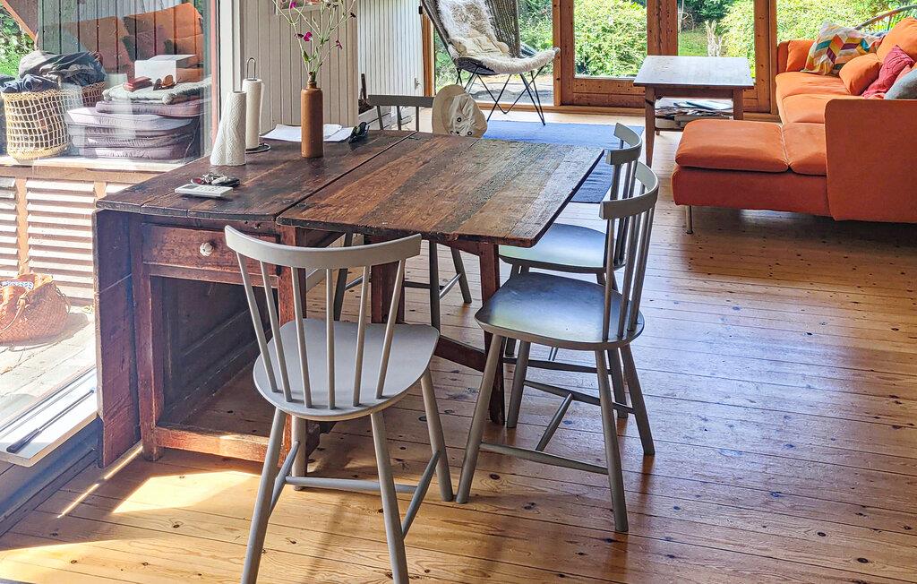 Betreten Sie den Innenbereich und lassen Sie sich von der warmen, persönlichen Atmosphäre empfangen. Nehmen Sie auf dem Sofa Platz, das zum Entspannen einlädt. Genießen Sie den Blick ins satte Grün durch die großen Glasflächen, die viel Licht in den Wohnraum lassen. Die offene Gestaltung des Innenbereichs verbindet Kochen, Essen und Erholen miteinander. Servieren Sie gemeinsame Mahlzeiten am rustikalen Holztisch und planen Sie hier in Ruhe Ihre Ausflüge. Ziehen Sie sich abends mit einem Buch in den Lesesessel am Fenster zurück und lassen Sie den Tag ruhig ausklingen.