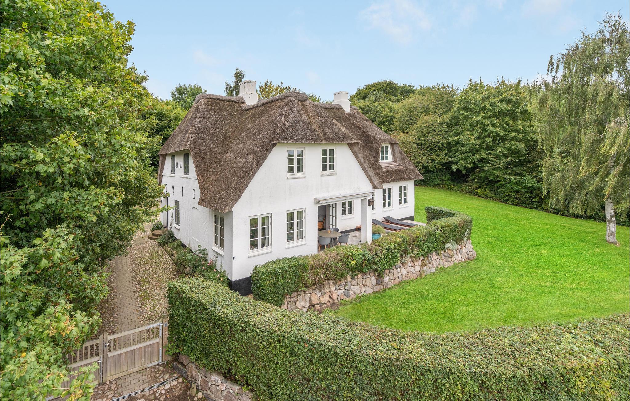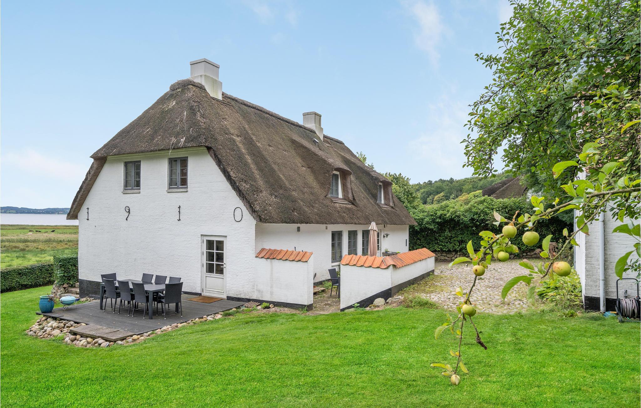 Idyllisches Ferienhaus mit Schilfdach, Panoramablick auf den Fjord Aabenraa und modernem Komfort in Dänemark.